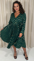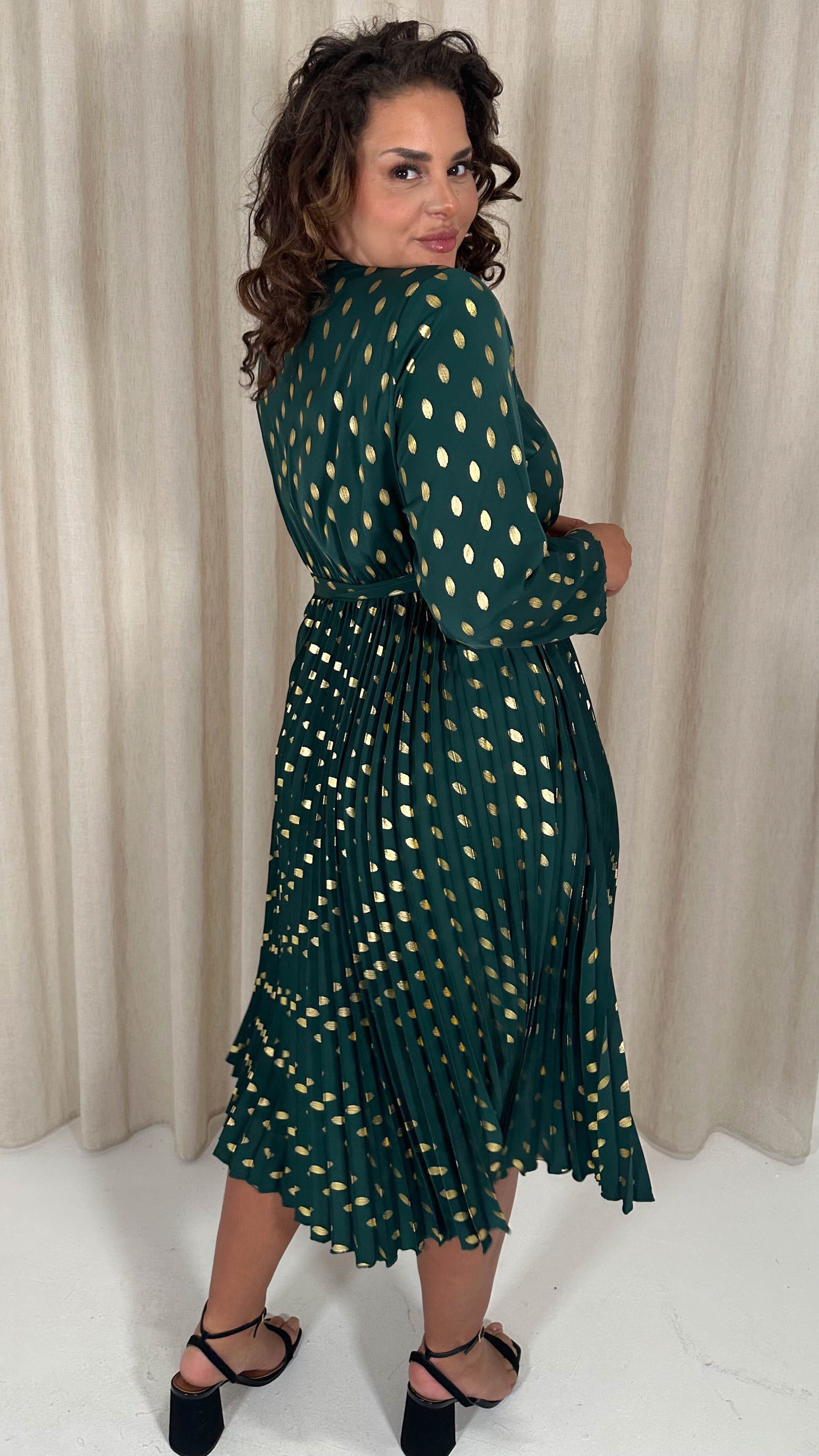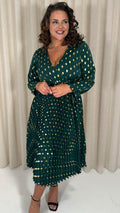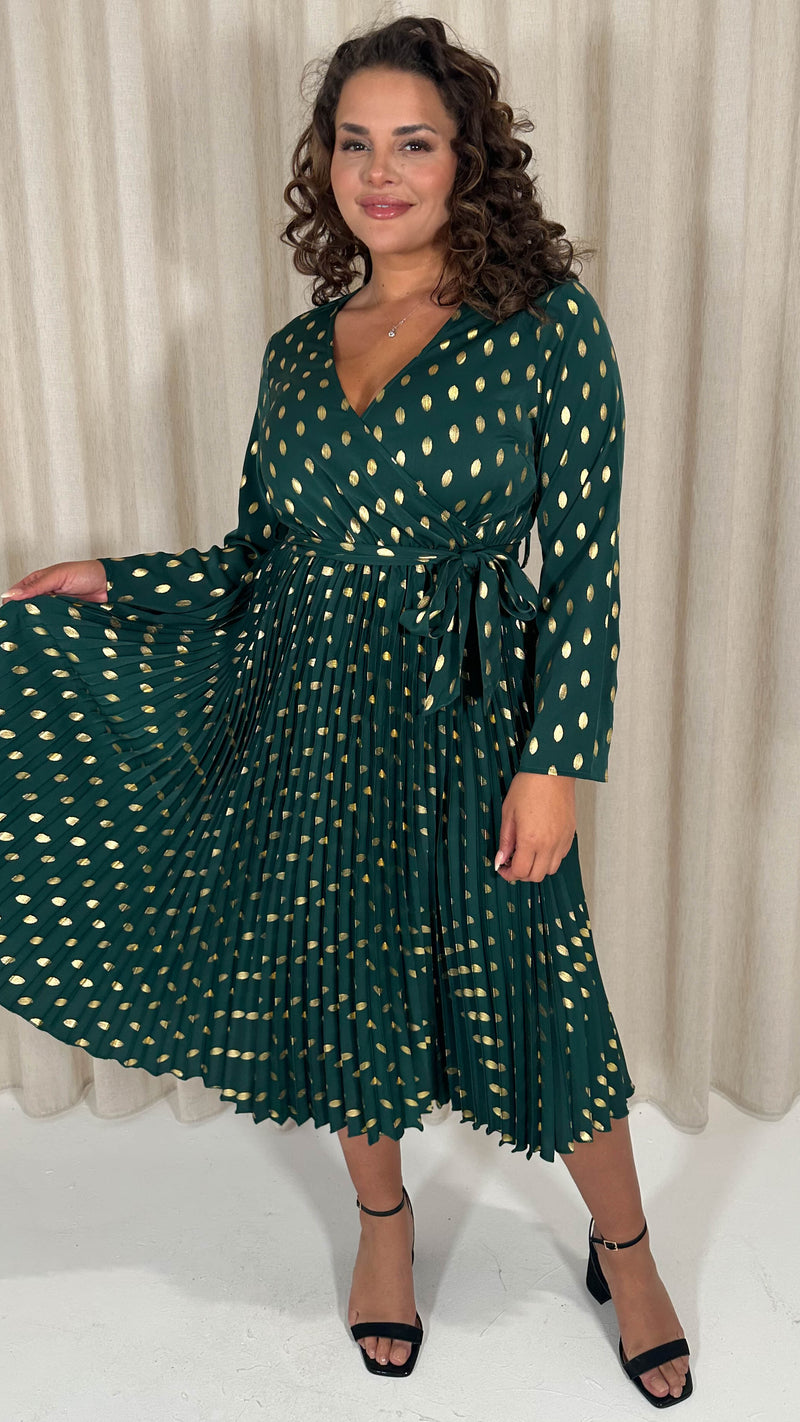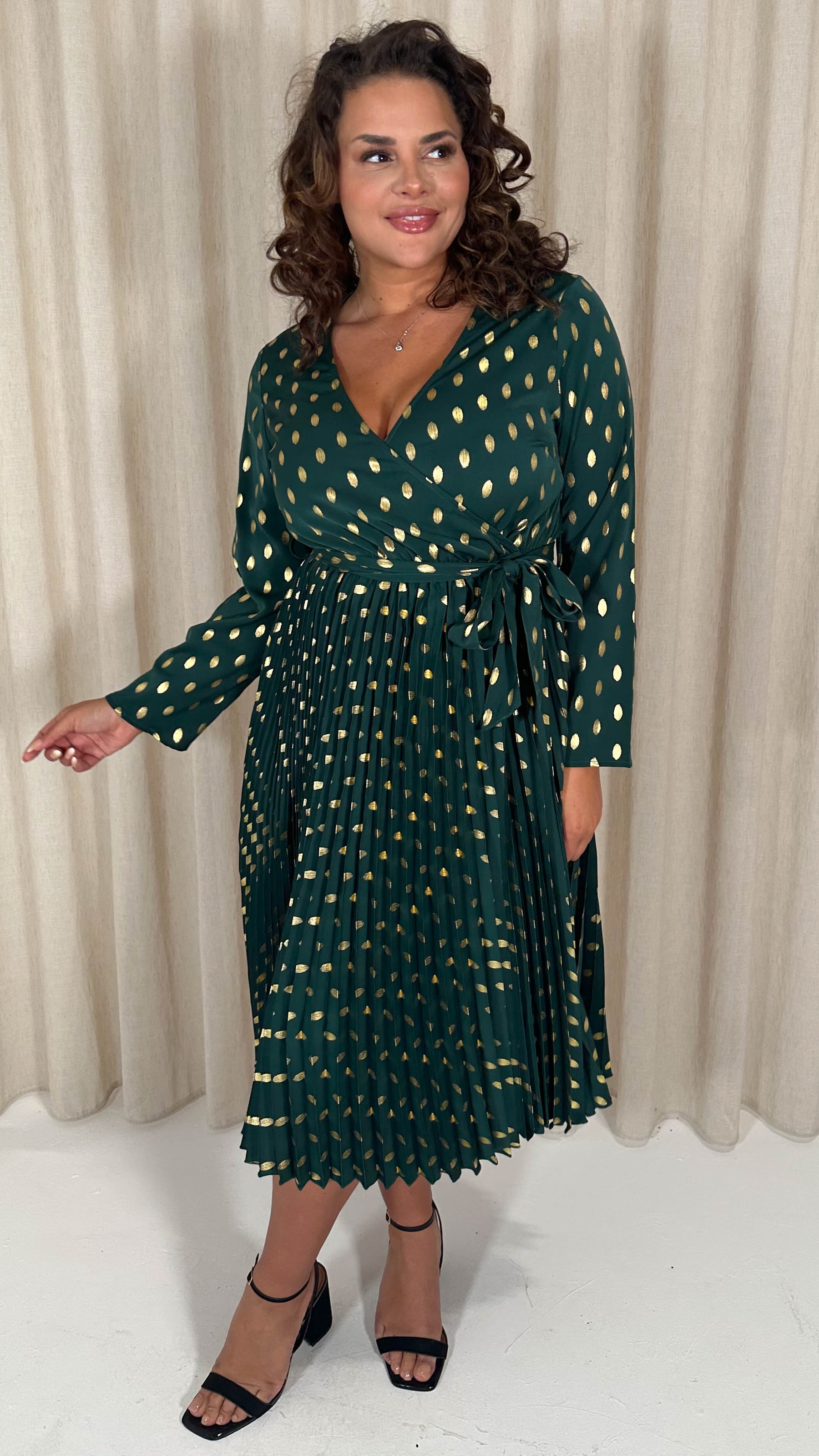 CurveWow Long Sleeve Pleated Wrap Dress Green Spot