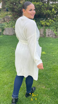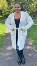 Layer up in style with this knitted maxi cardigan. Features a big knit, long sleeves, functional pockets and tie ups. Made for this transitional weather to wear over any outfit. Wear with denim or any dress.