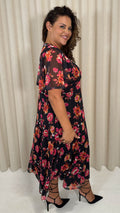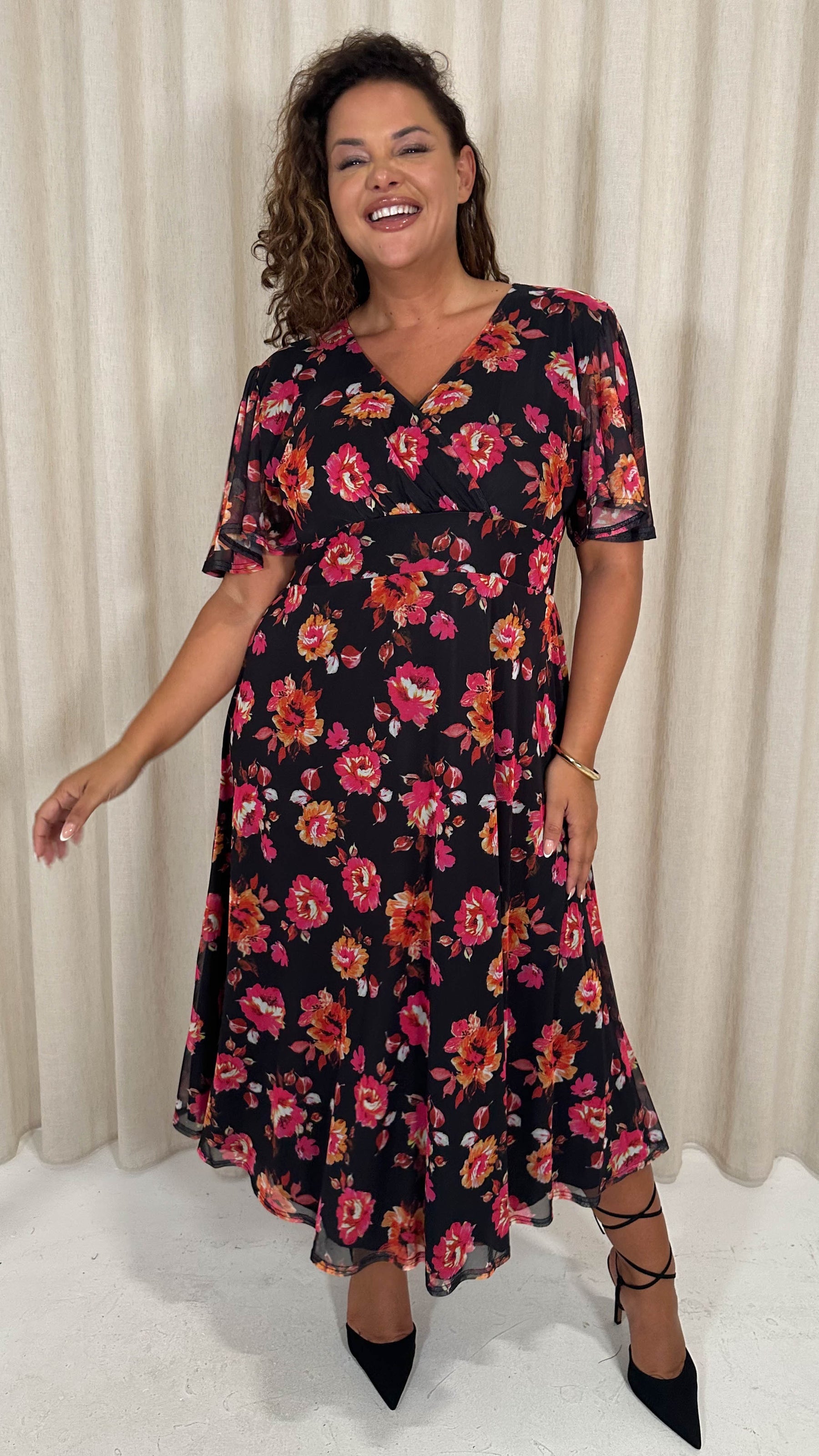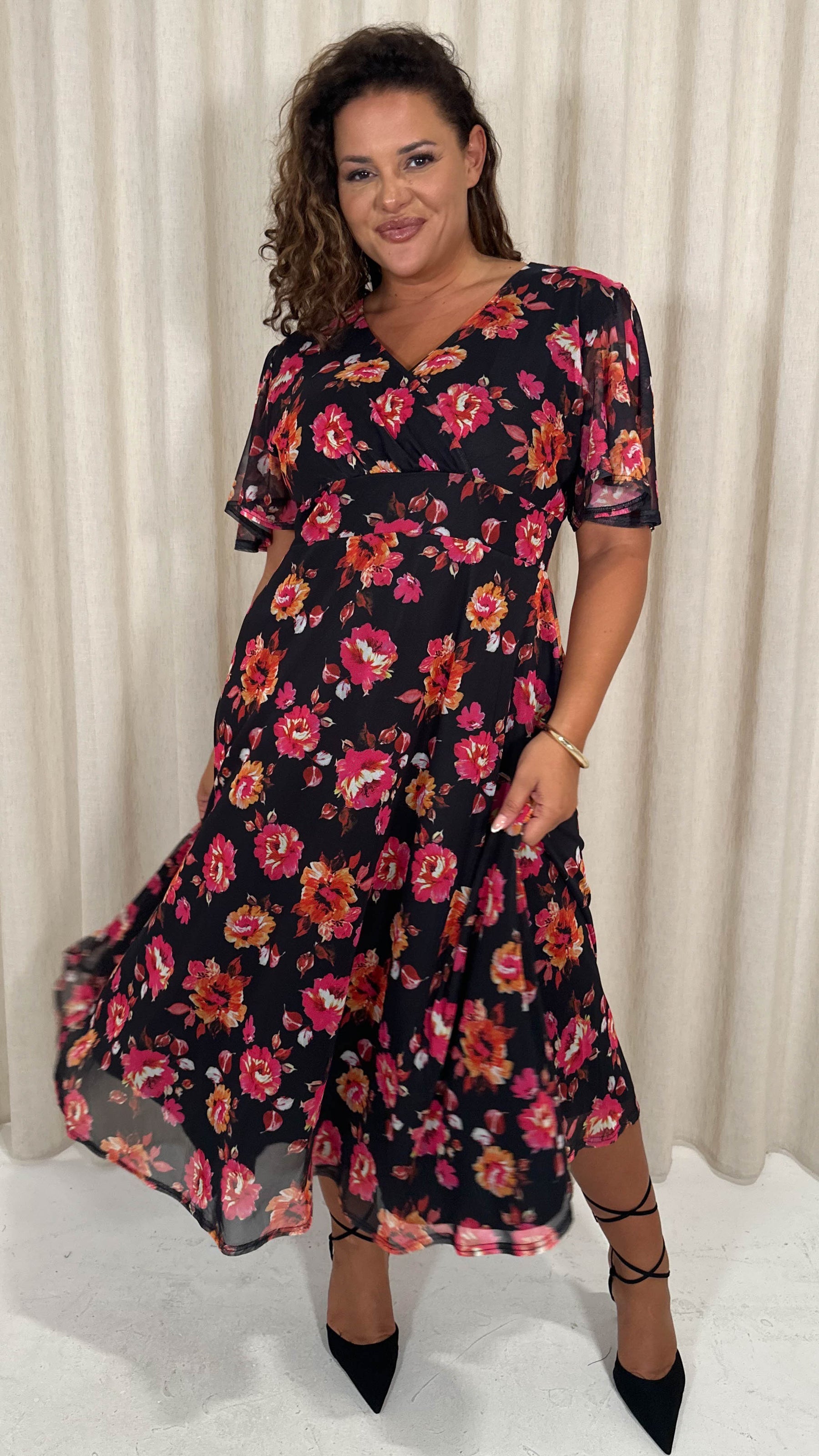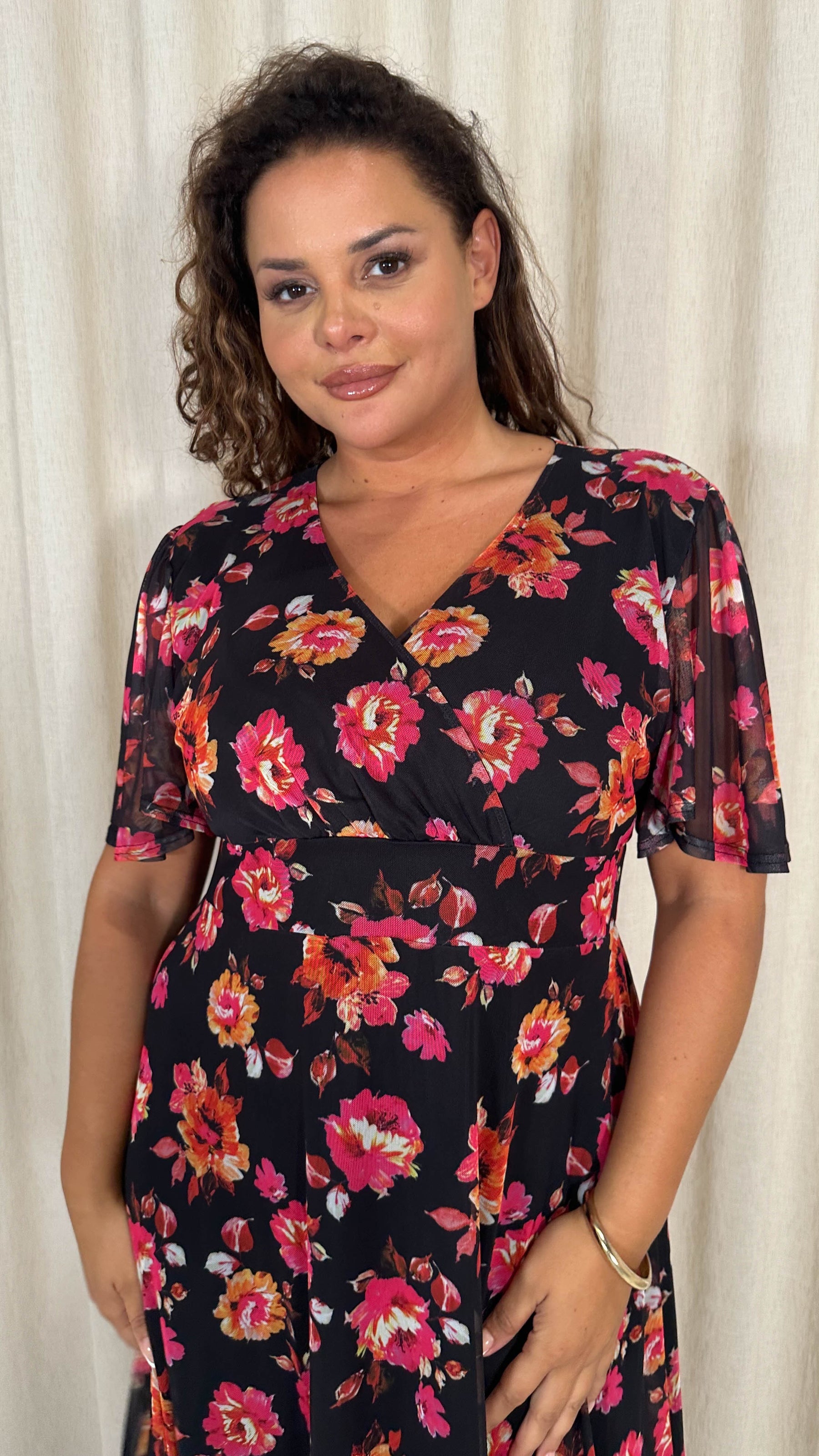 CurveWow Mesh Angel Sleeve Dress Black Pink Floral