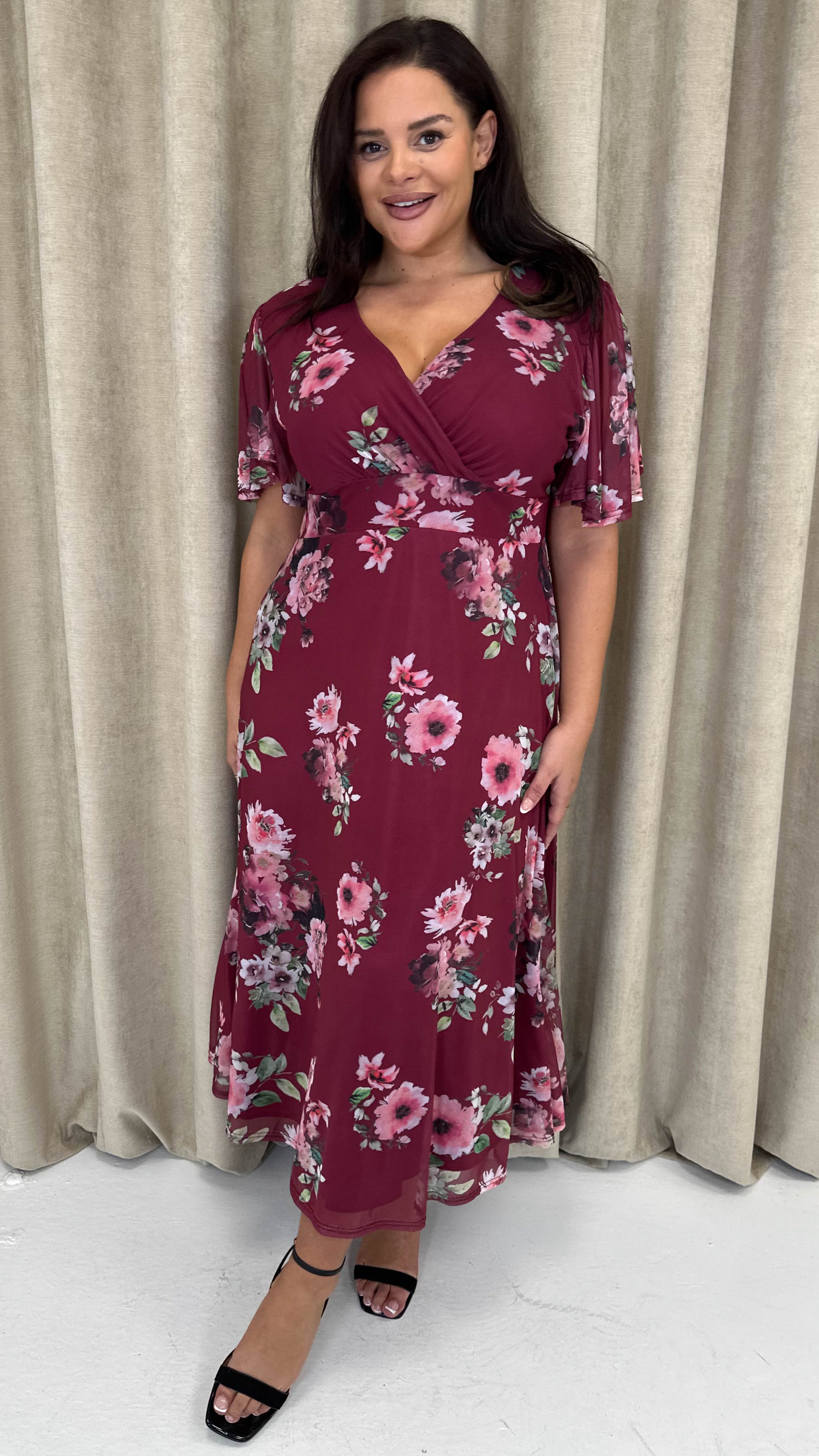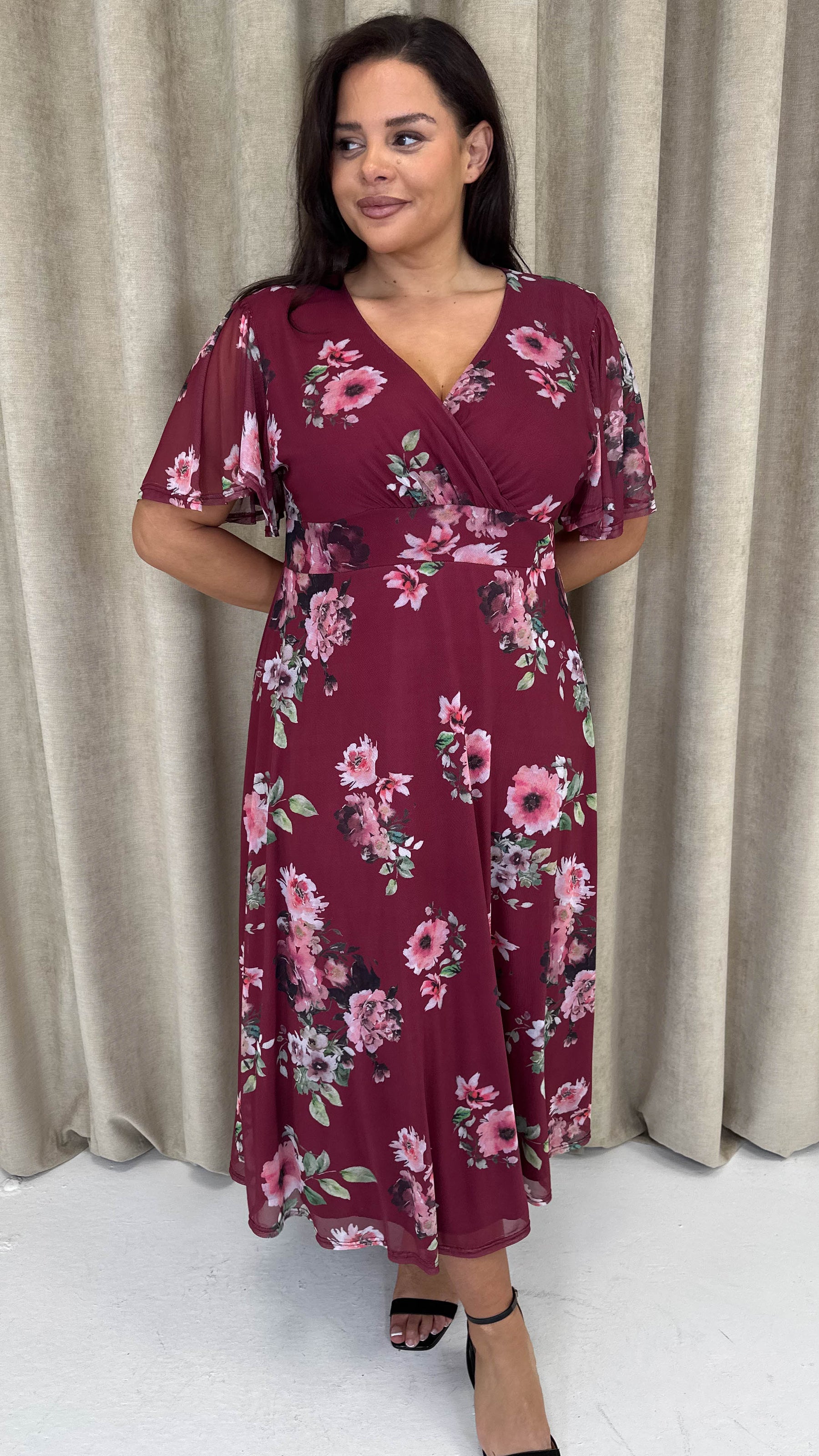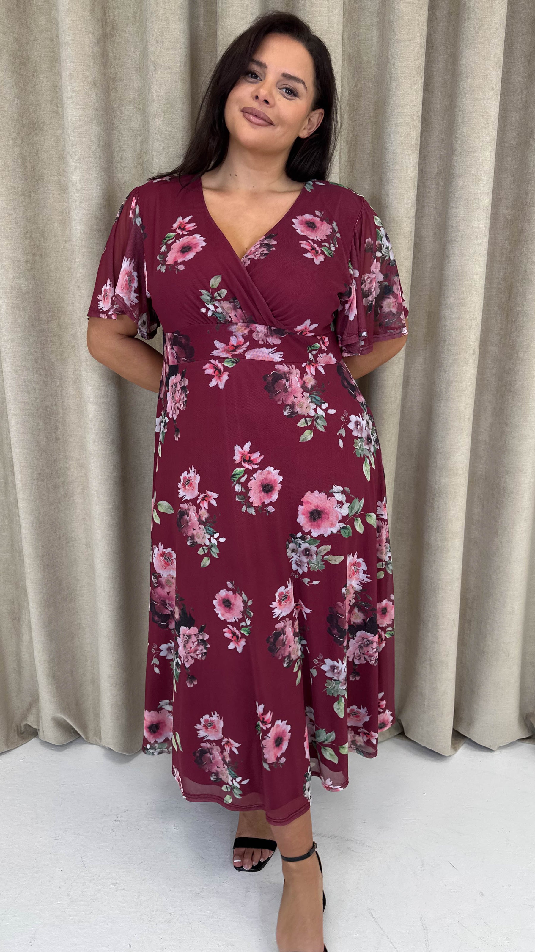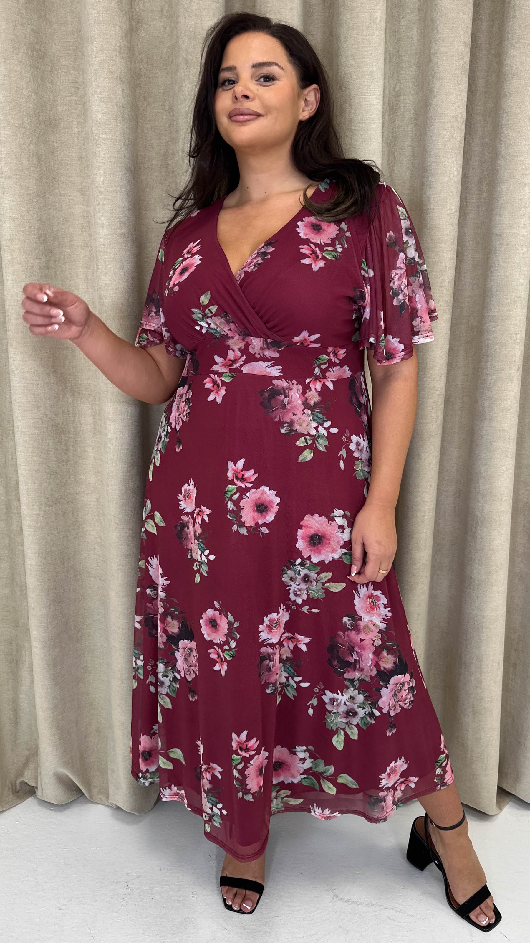 CurveWow Mesh Angel Sleeve Dress Wine Multi Floral
