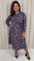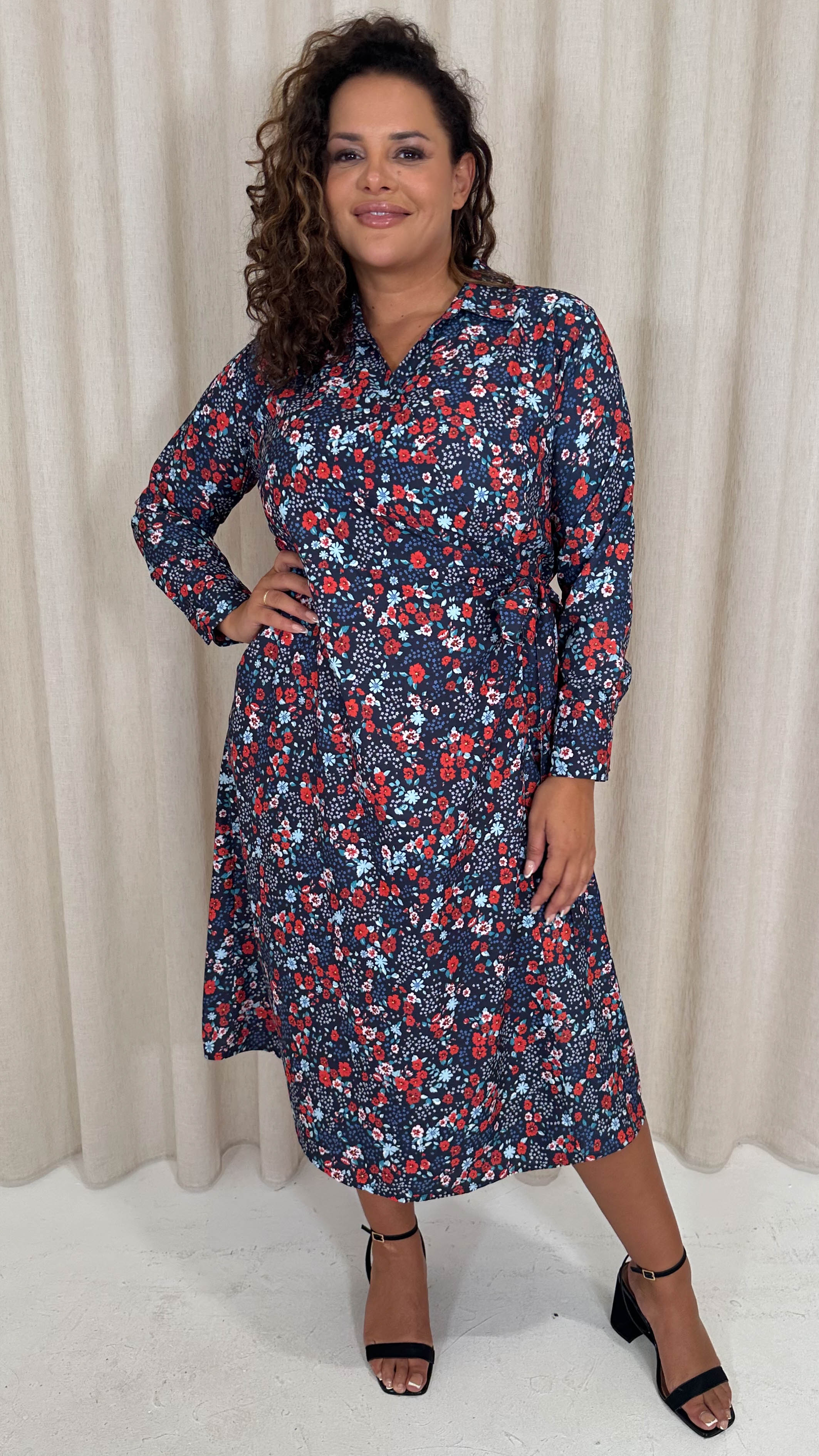 CurveWow Midi Wrap Shirt Dress Navy & Red Floral