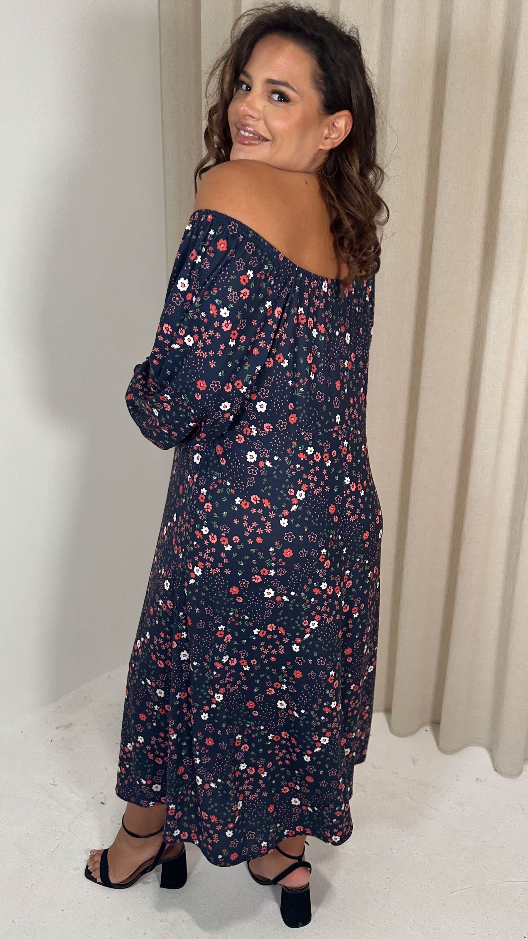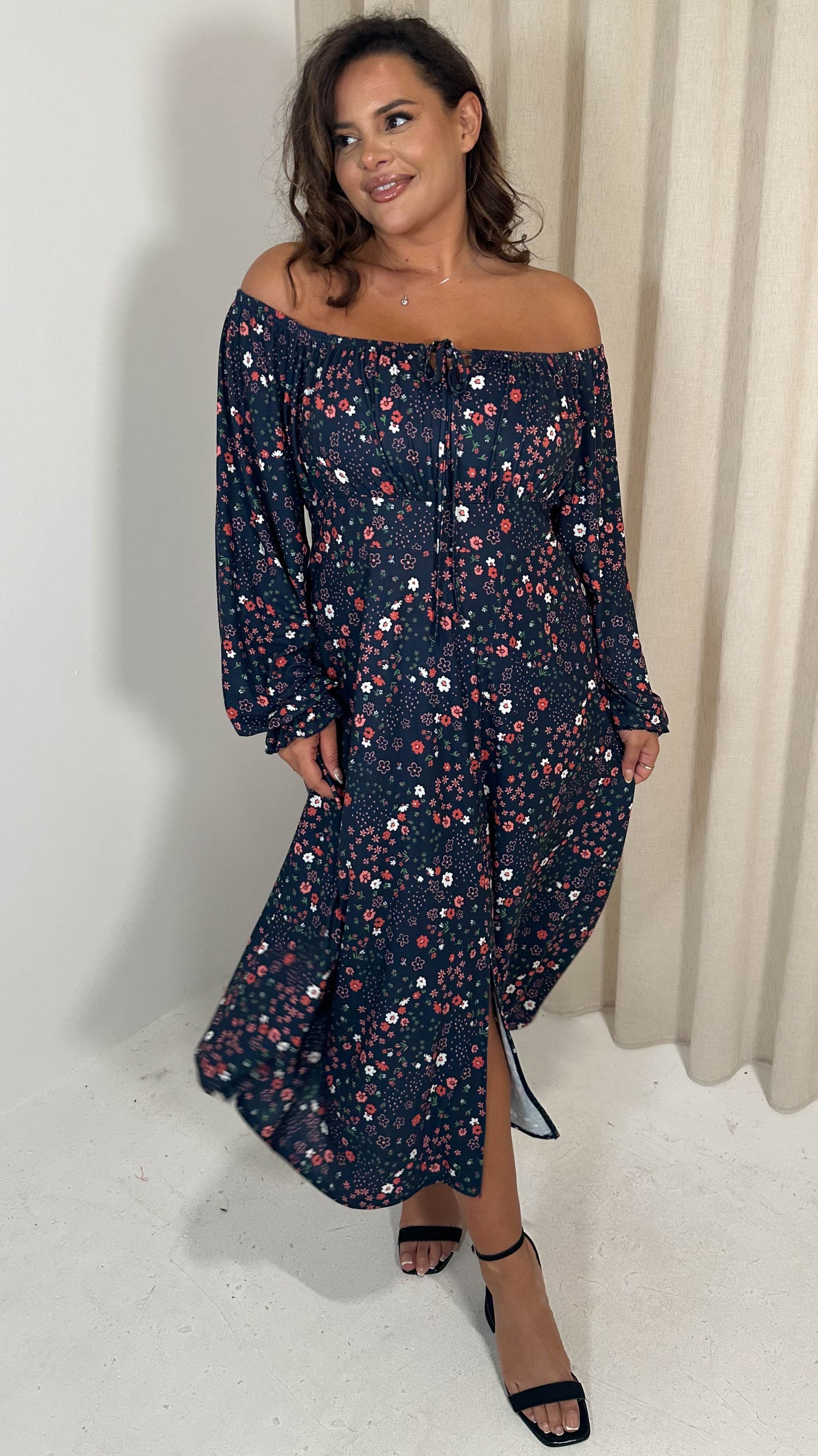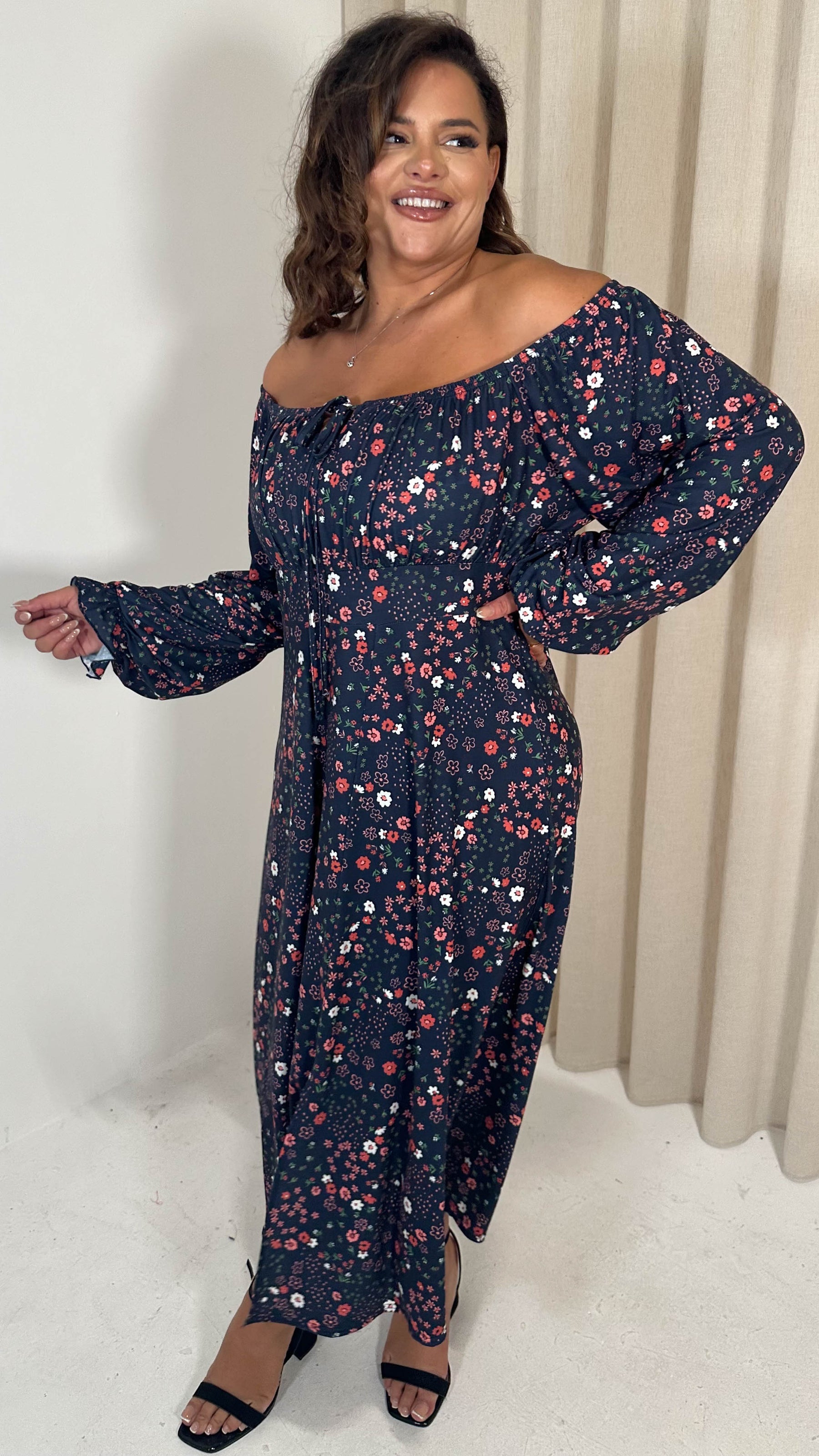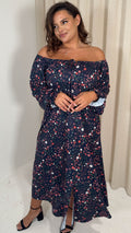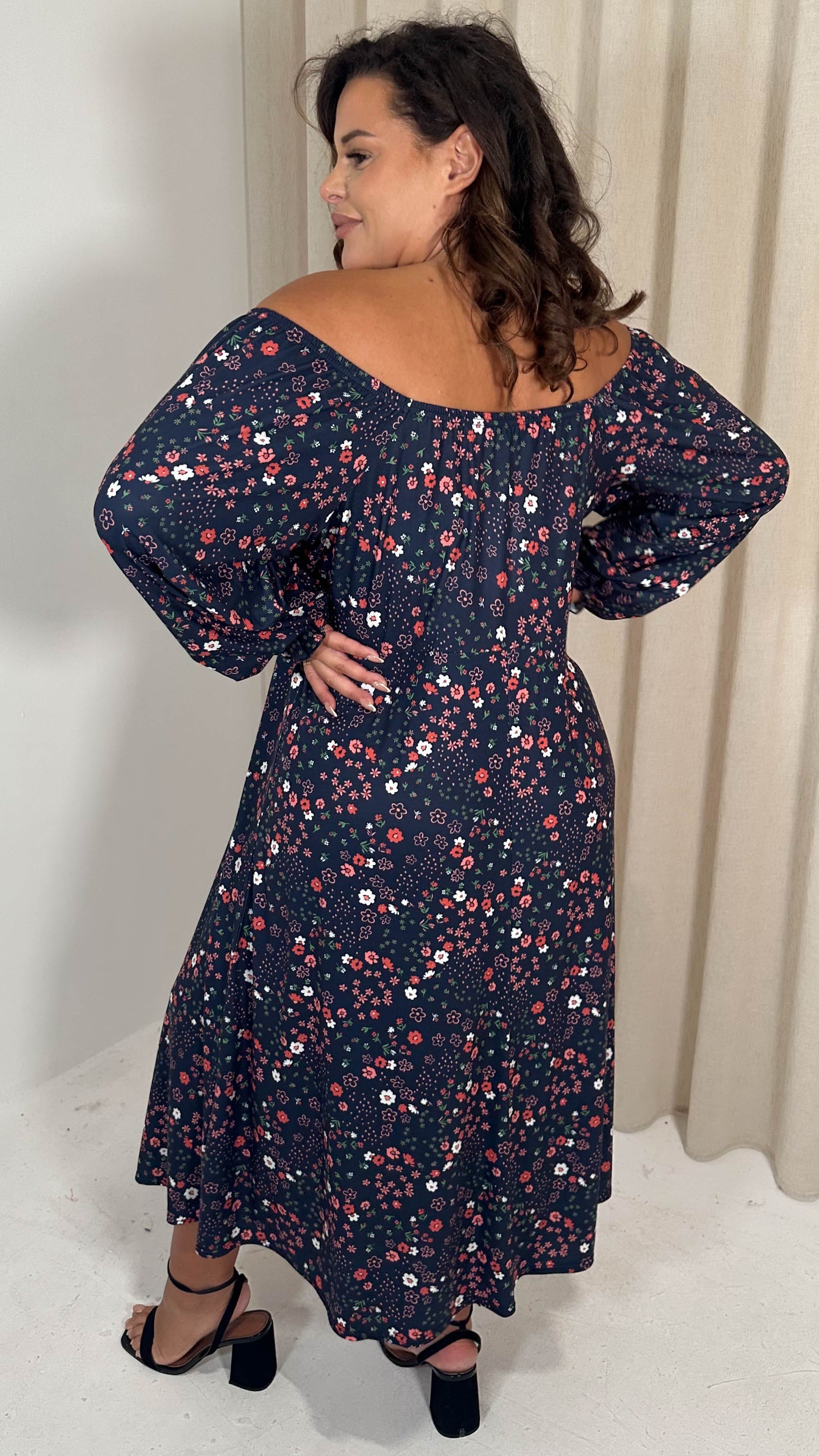 CurveWow Milkmaid Balloon Sleeve Midi Dress Navy Ditsy