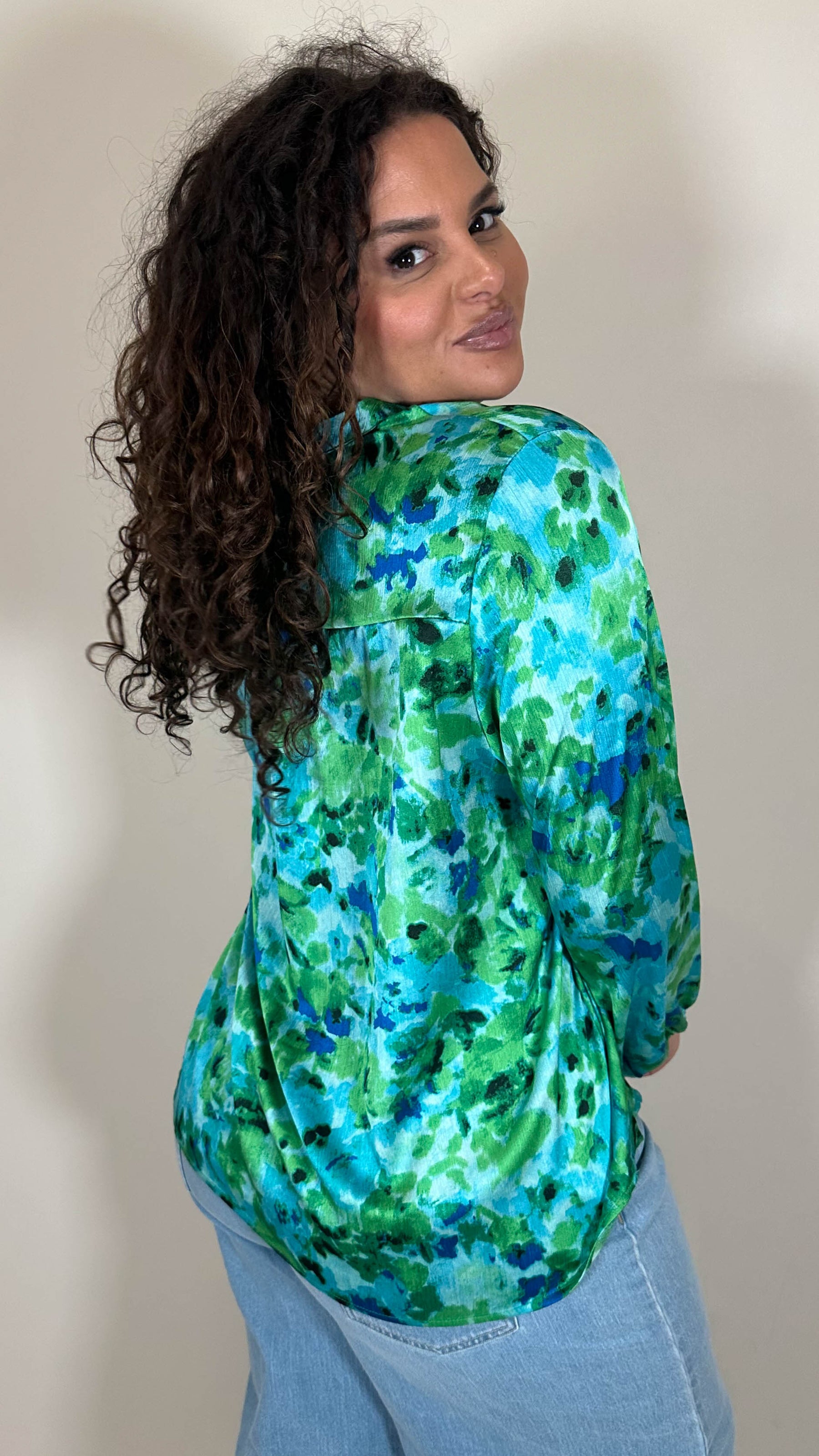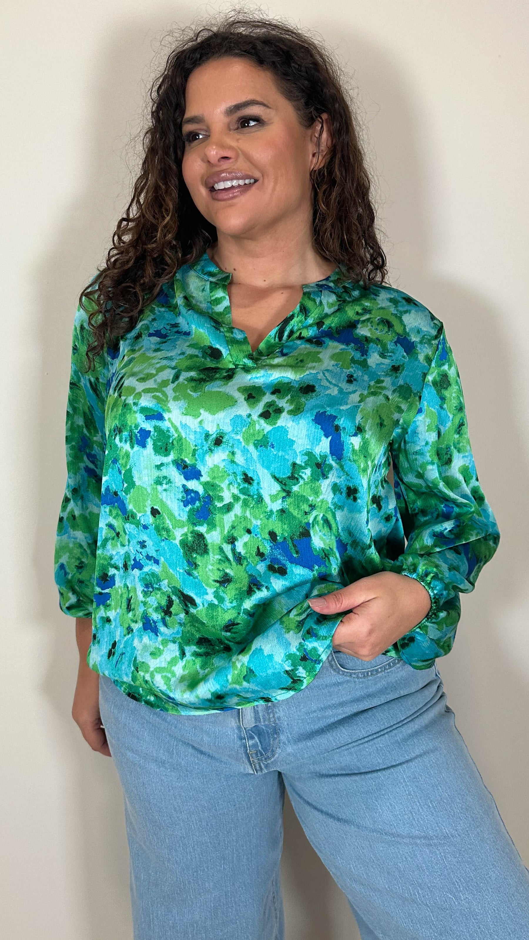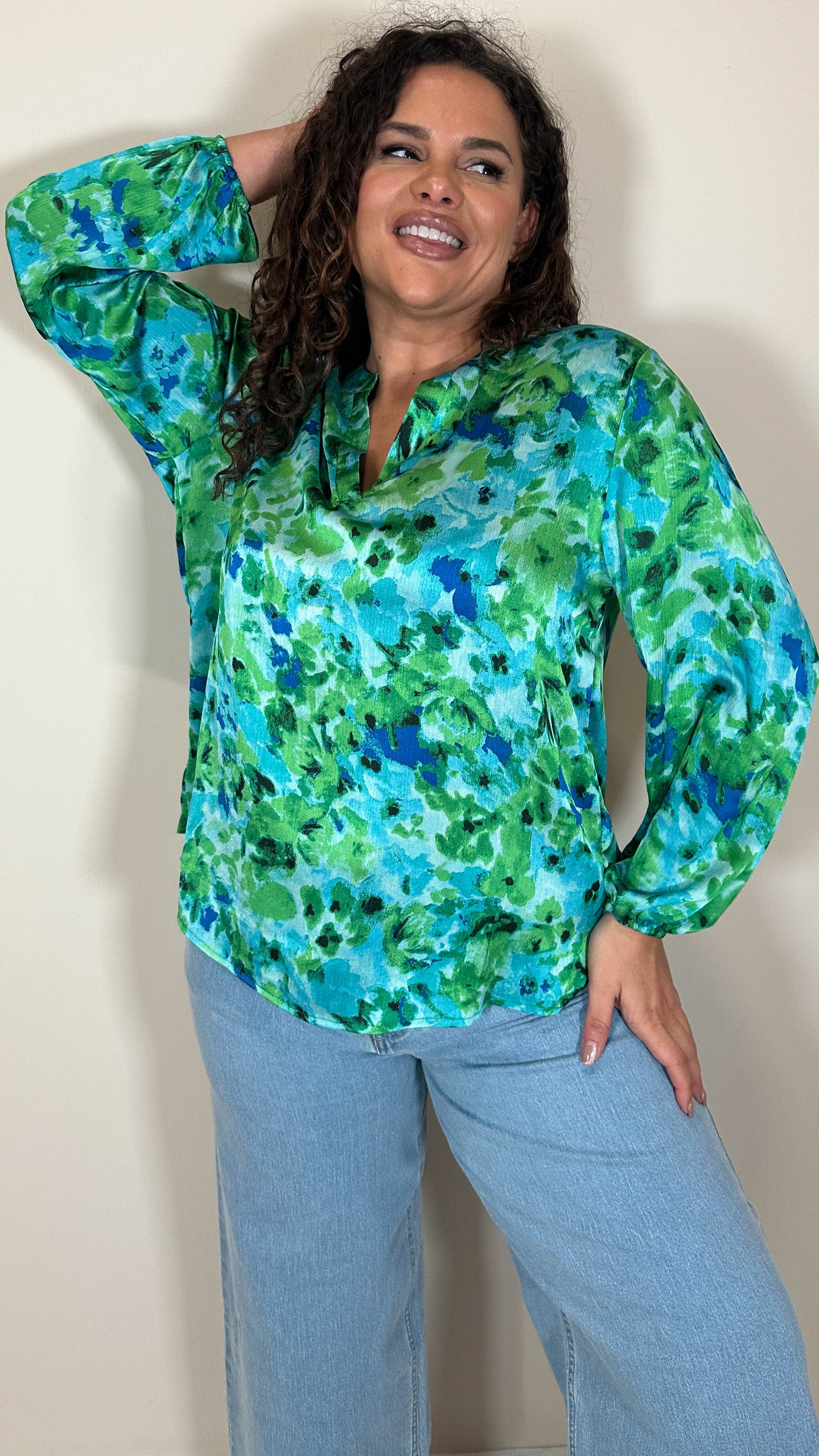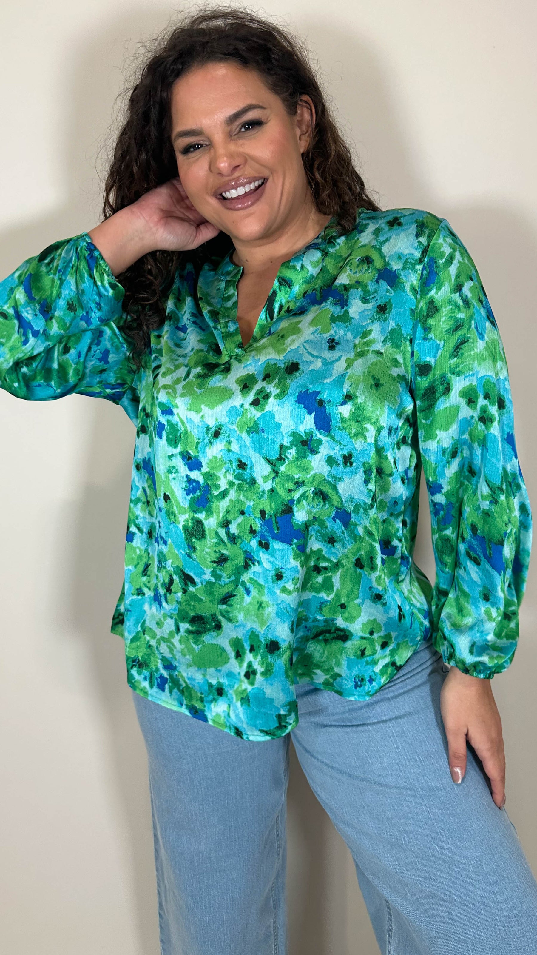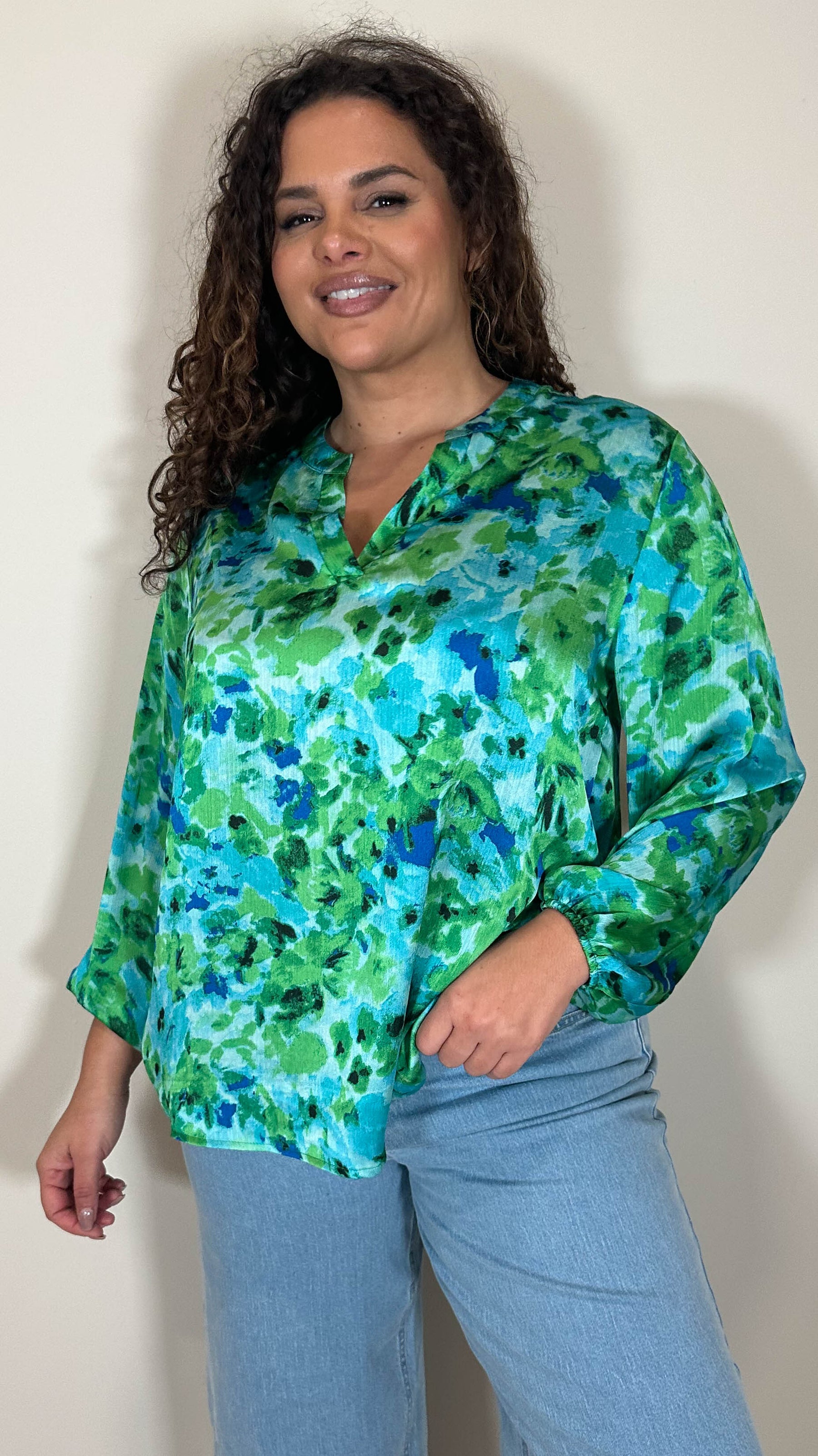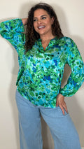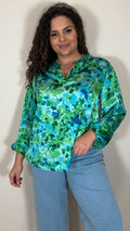 CurveWow Notch Neck Satin Printed Top Green Floral