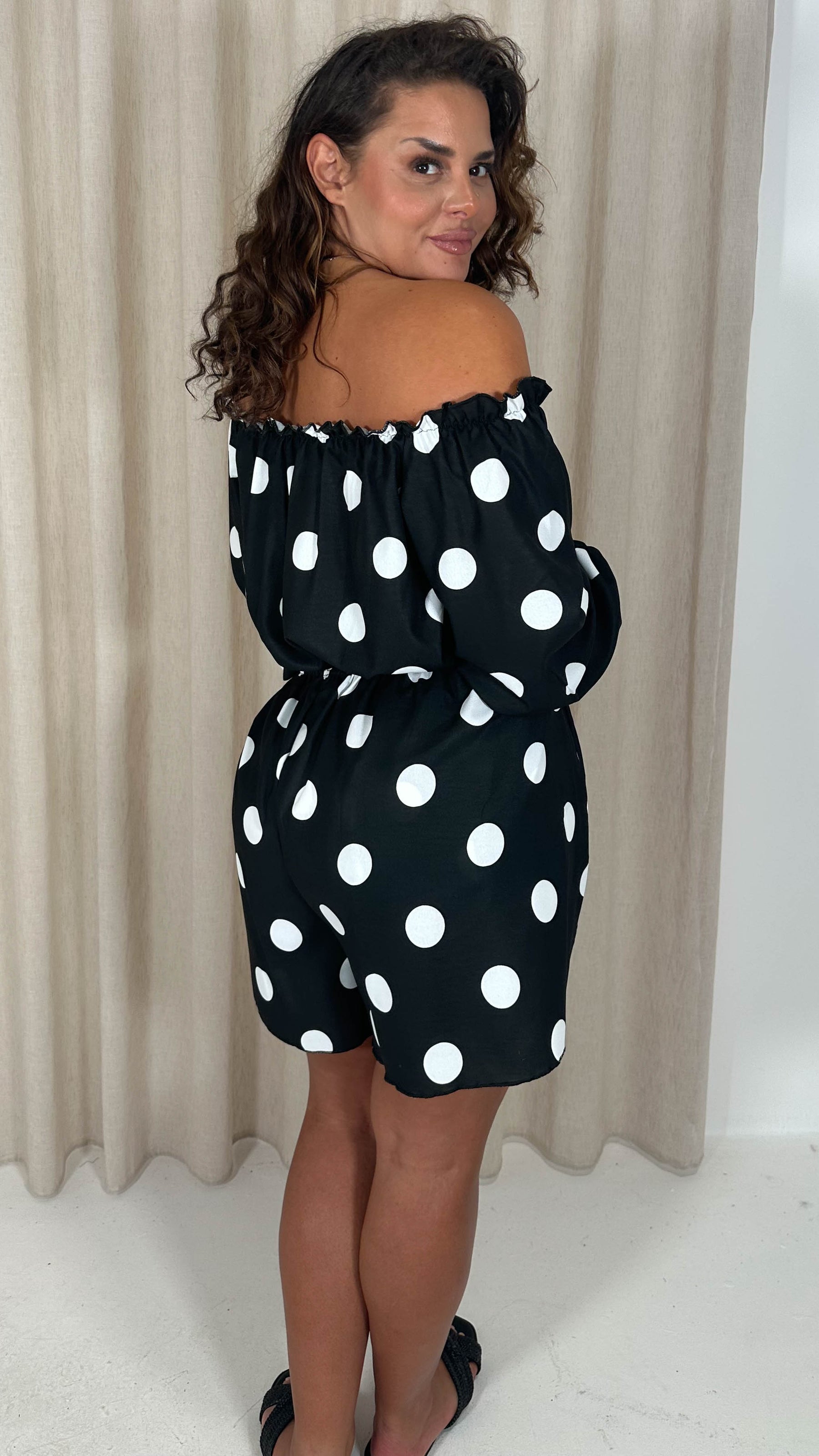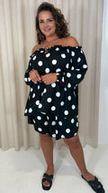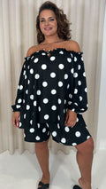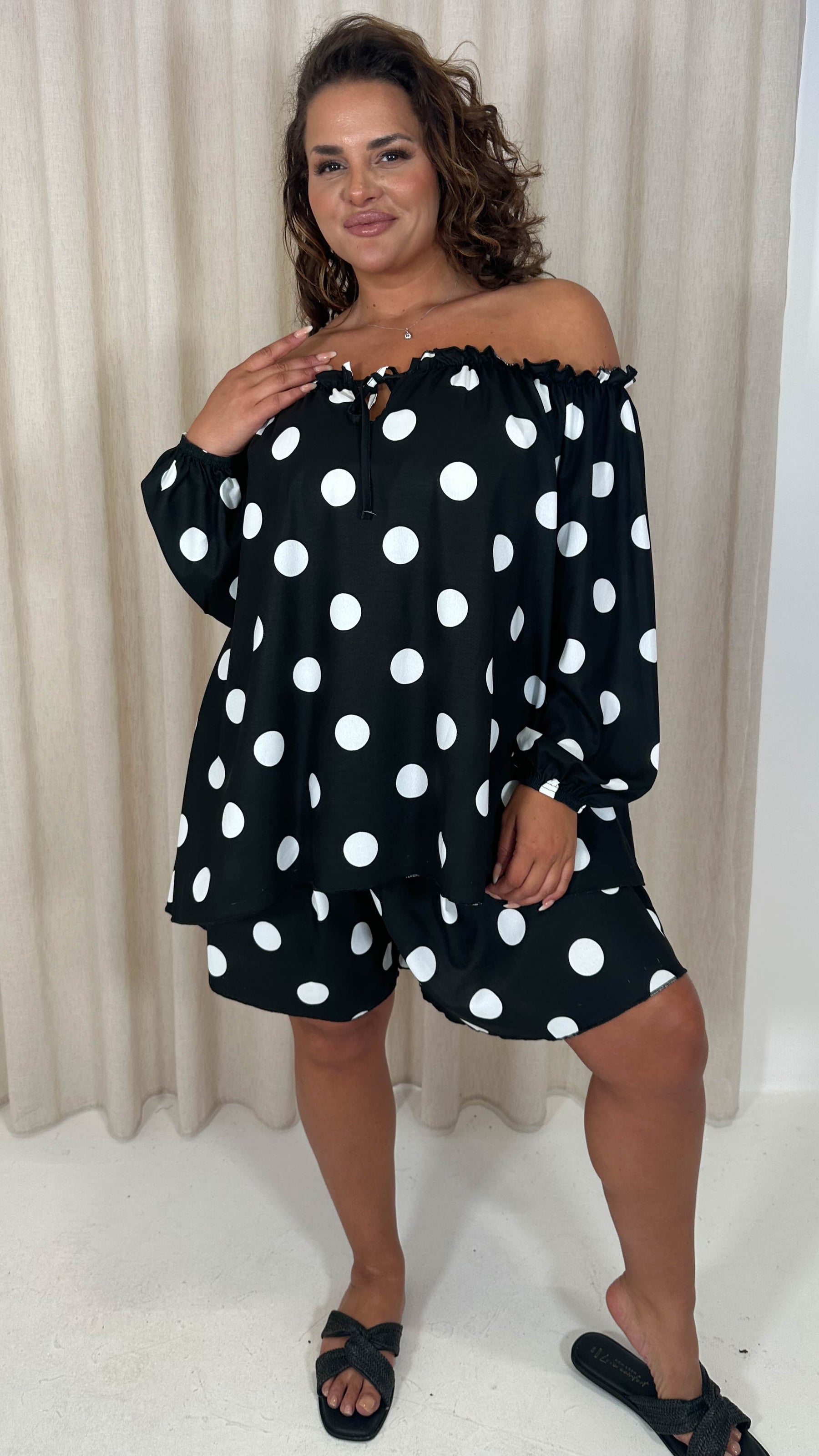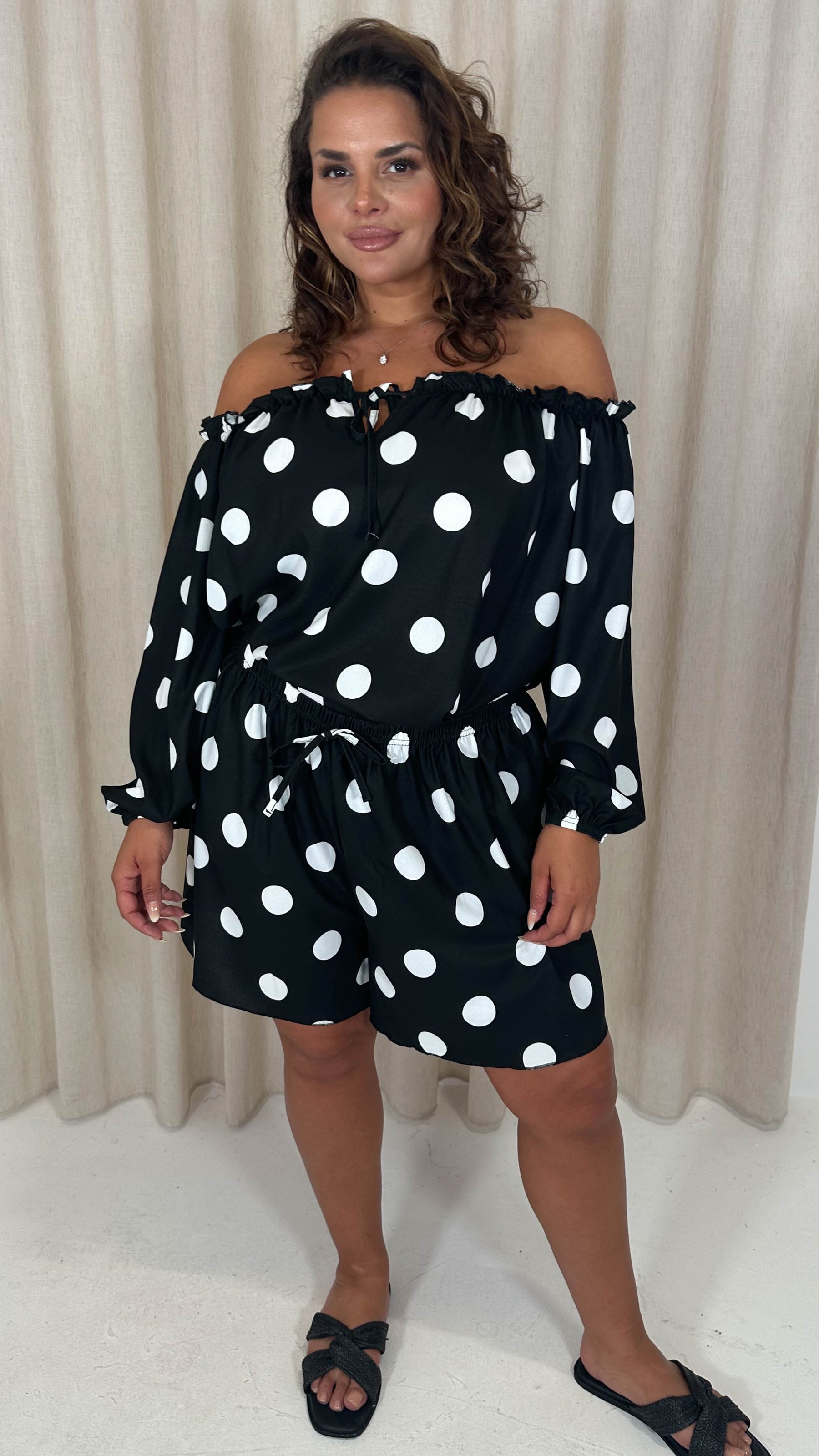 CurveWow Off The Shoulder Lantern Sleeve Tie Front Top Black Polka Dot