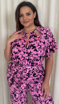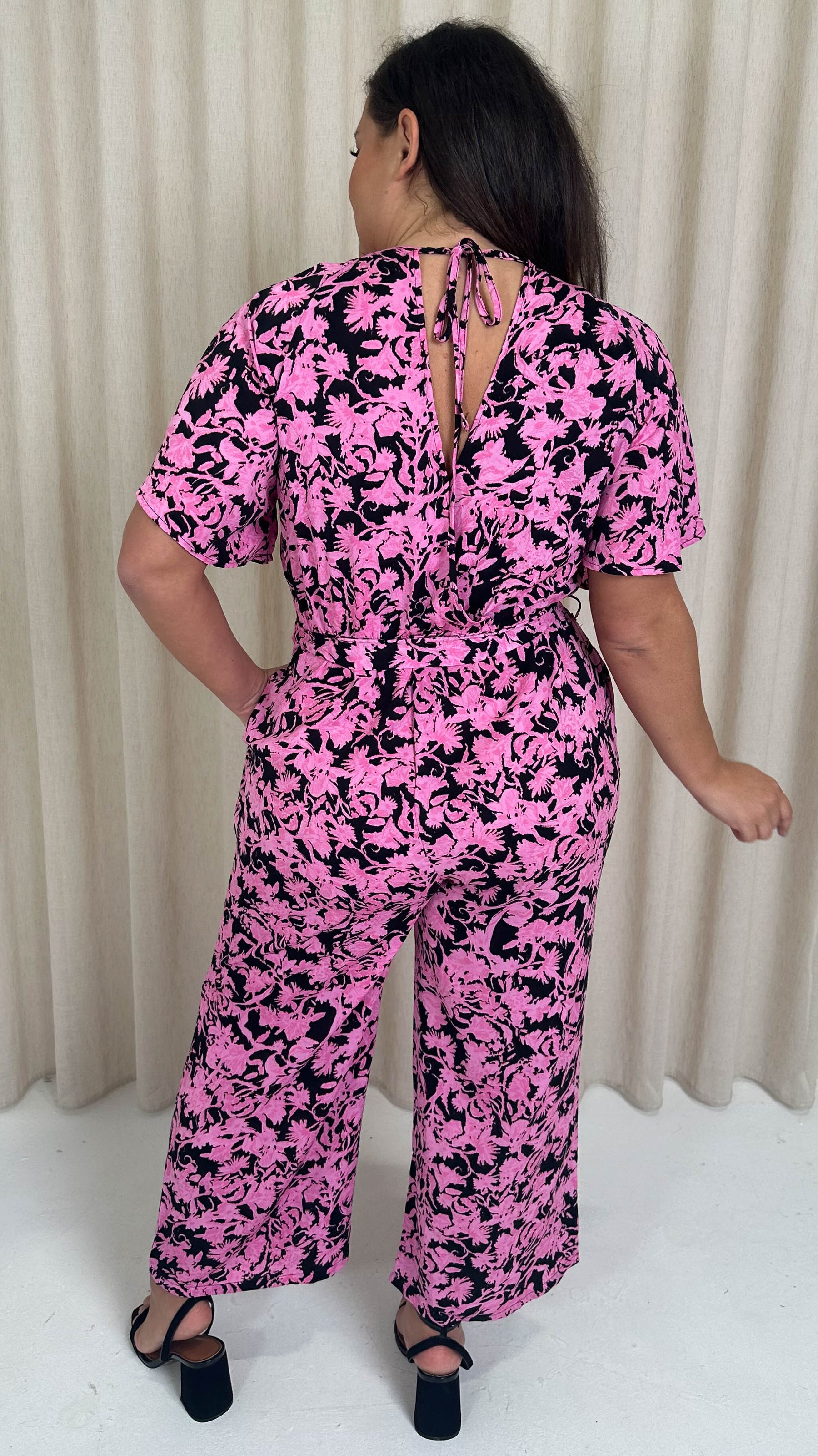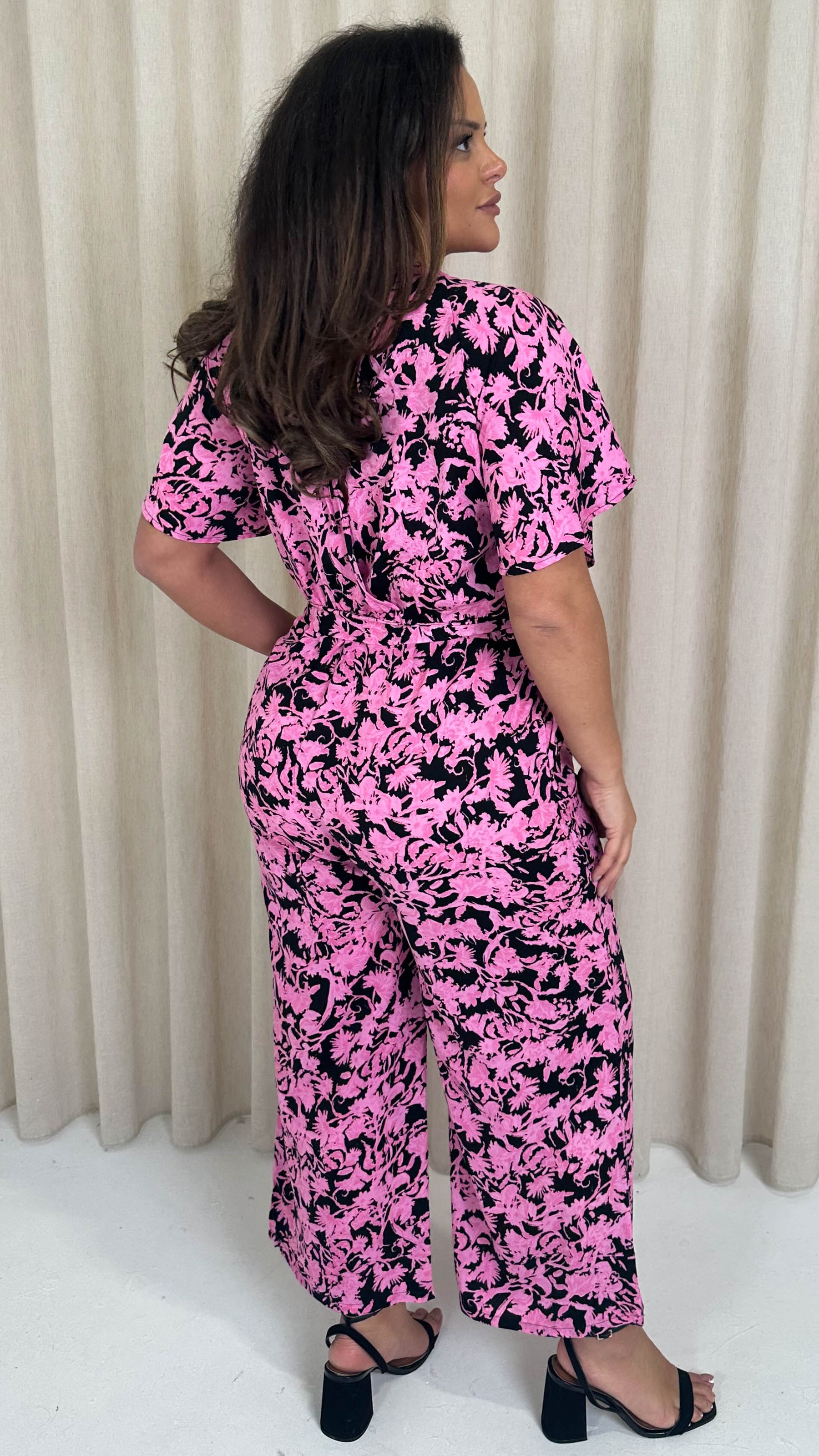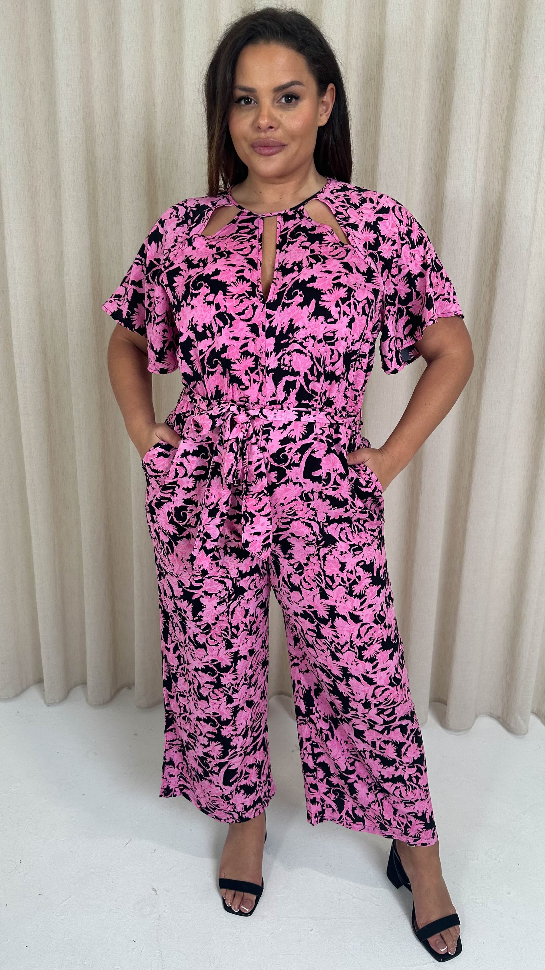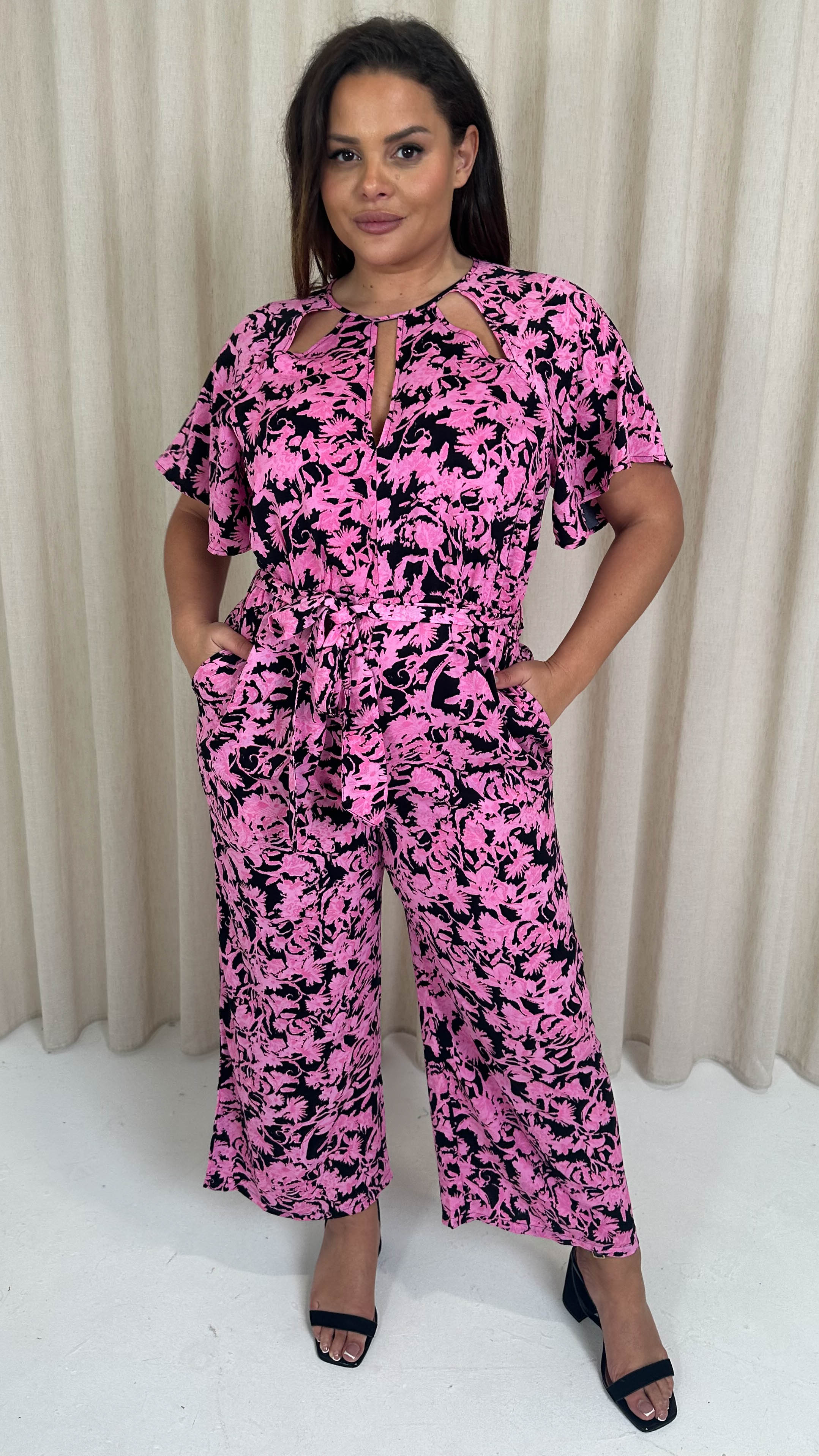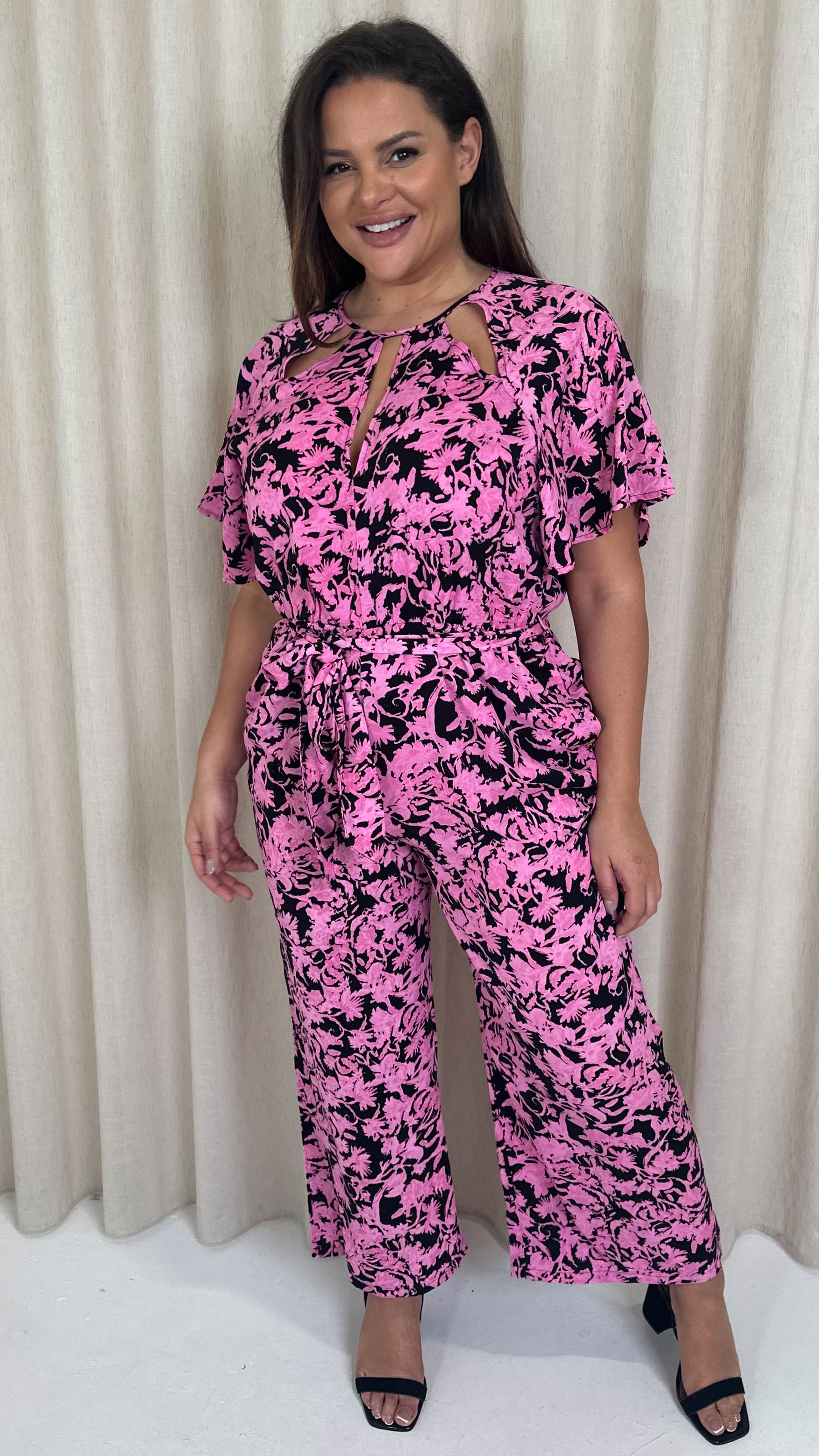 CurveWow Cut Out Drape Sleeve Jumpsuit Black Pink Floral