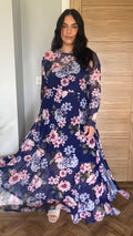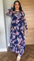 CurveWow Printed Mesh Maxi Dress Navy & Pink Floral