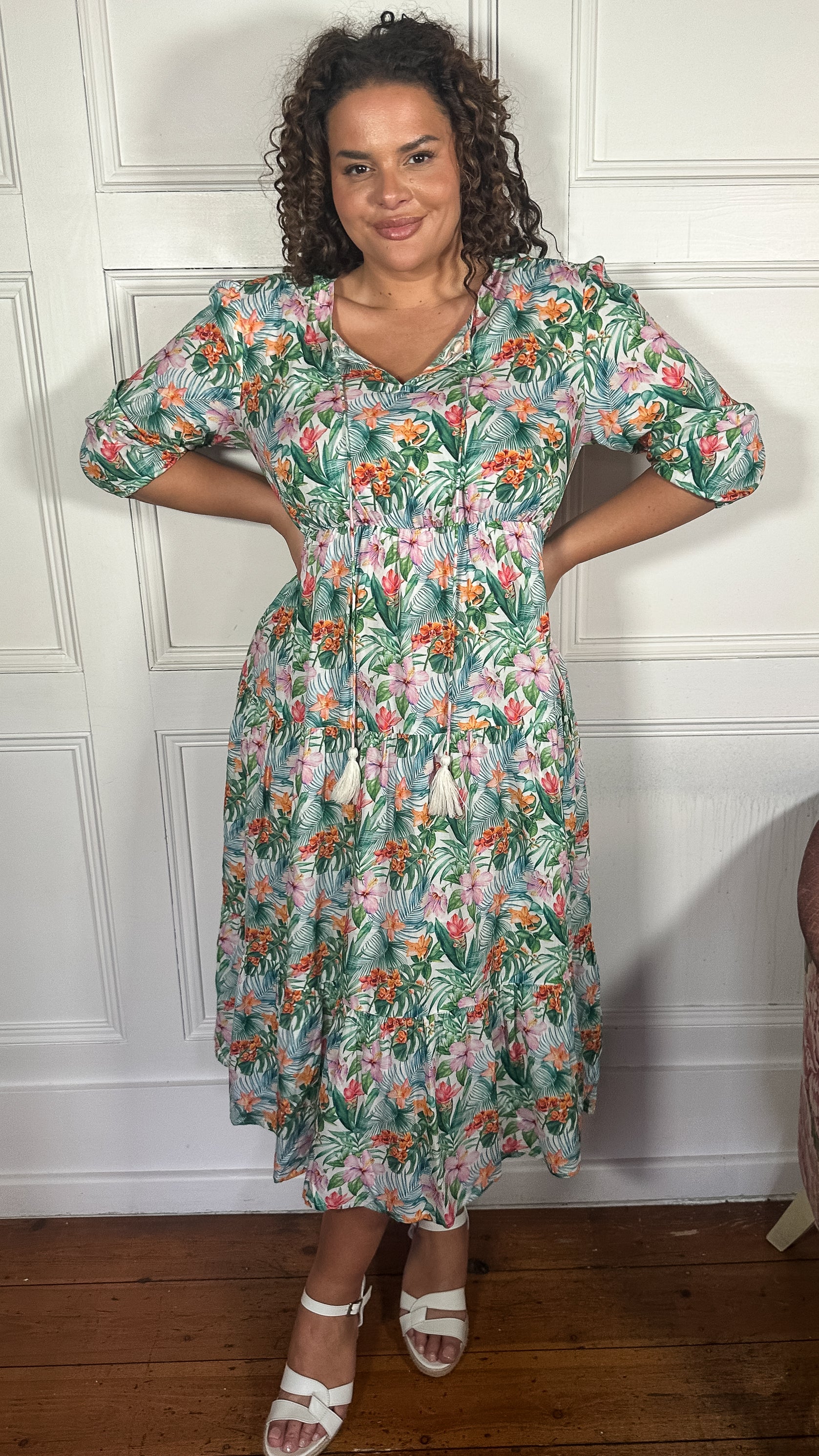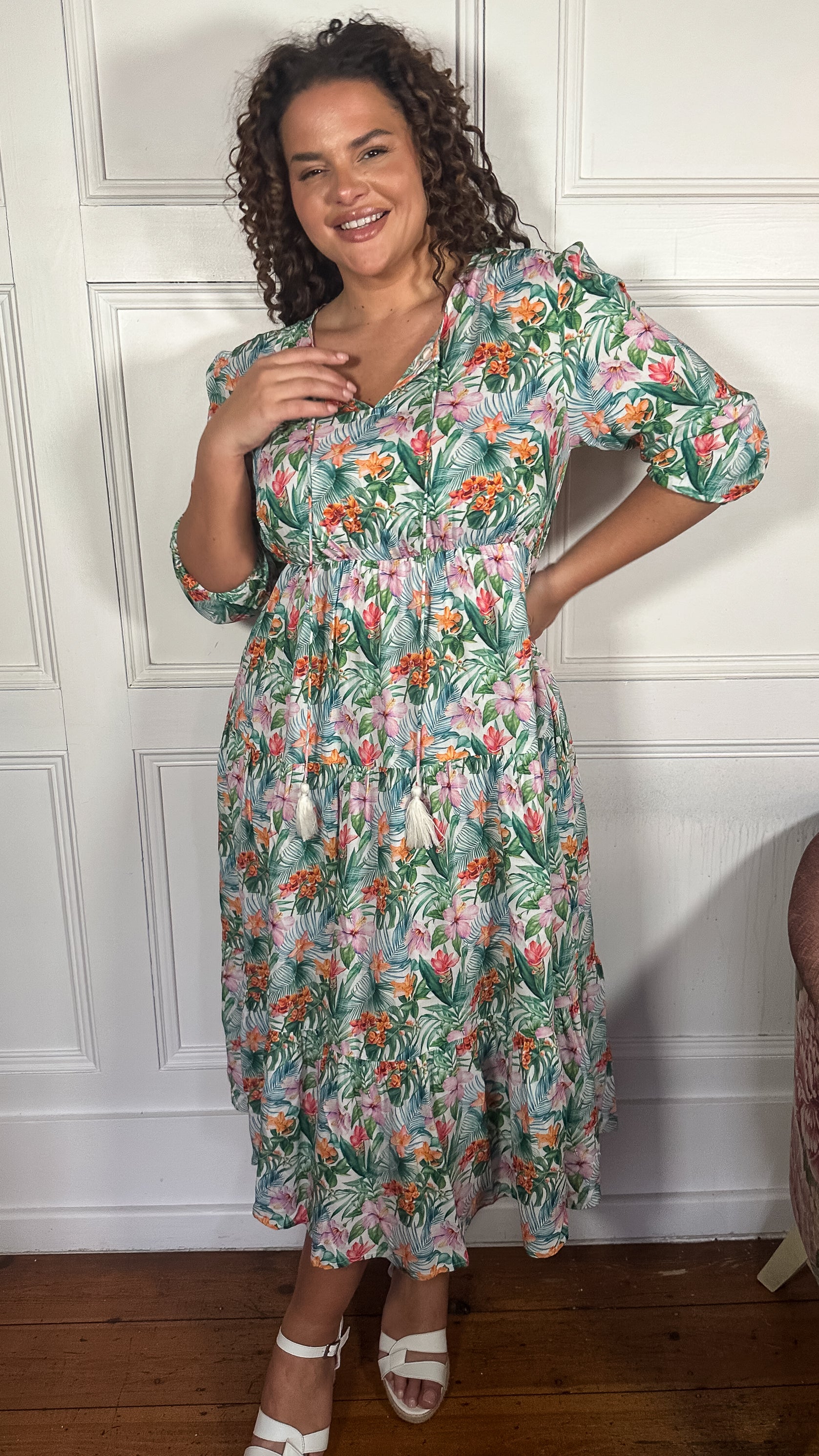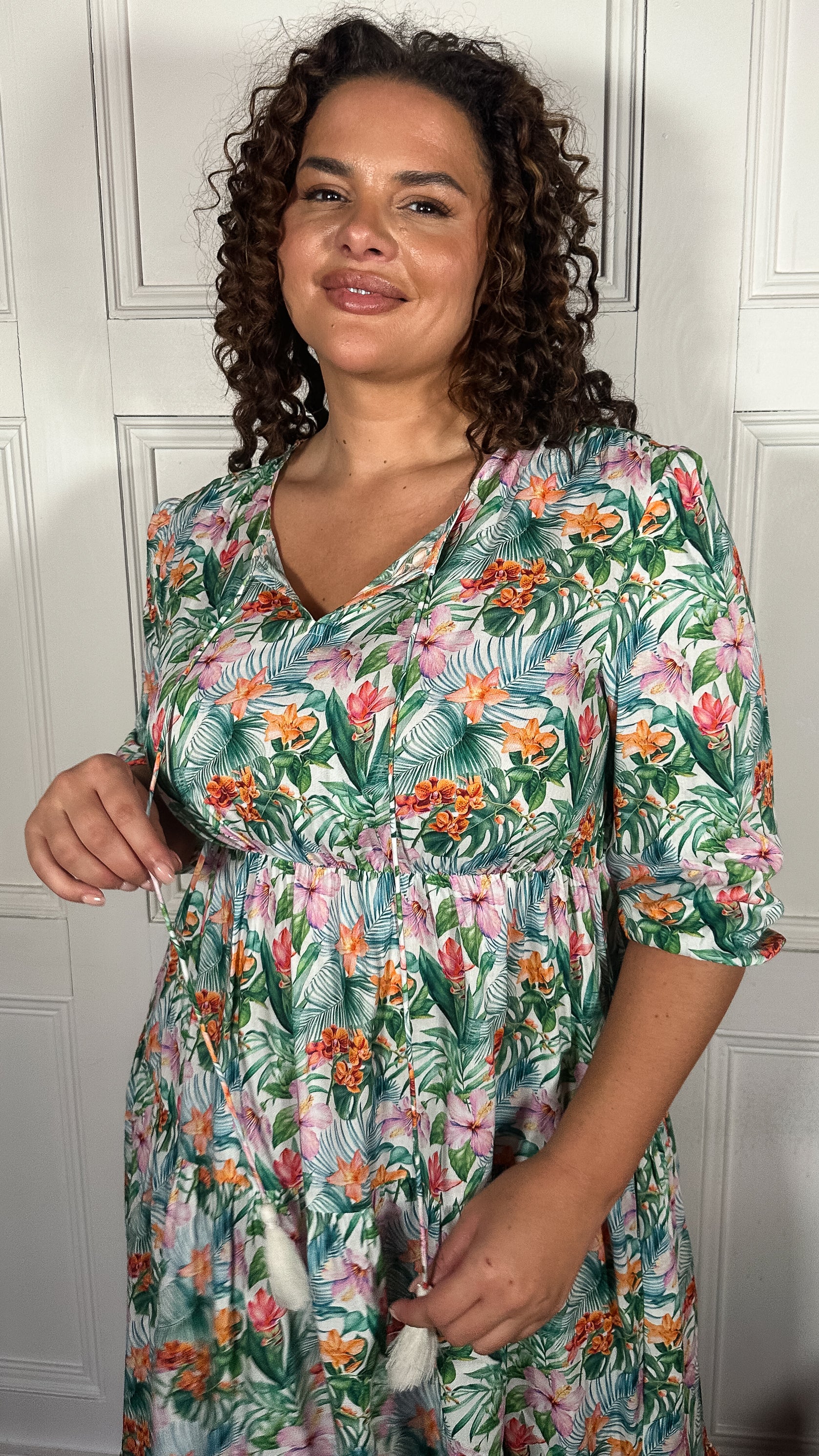 CurveWow Tassel Tie Tiered Maxi Dress White Floral