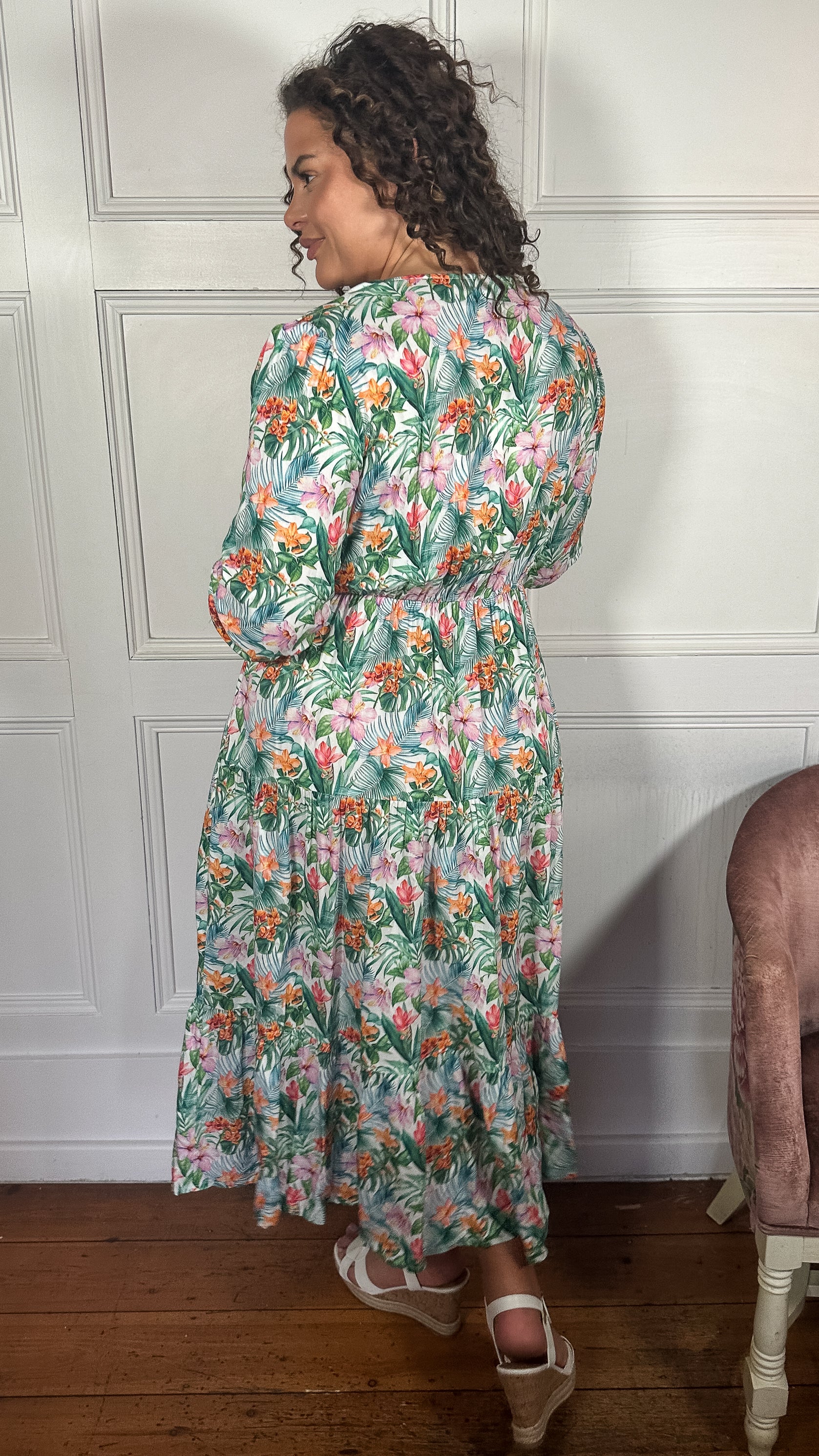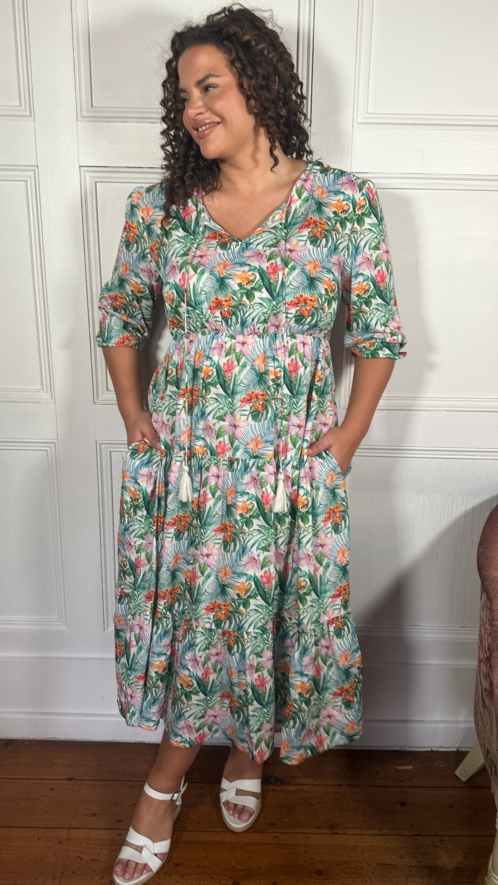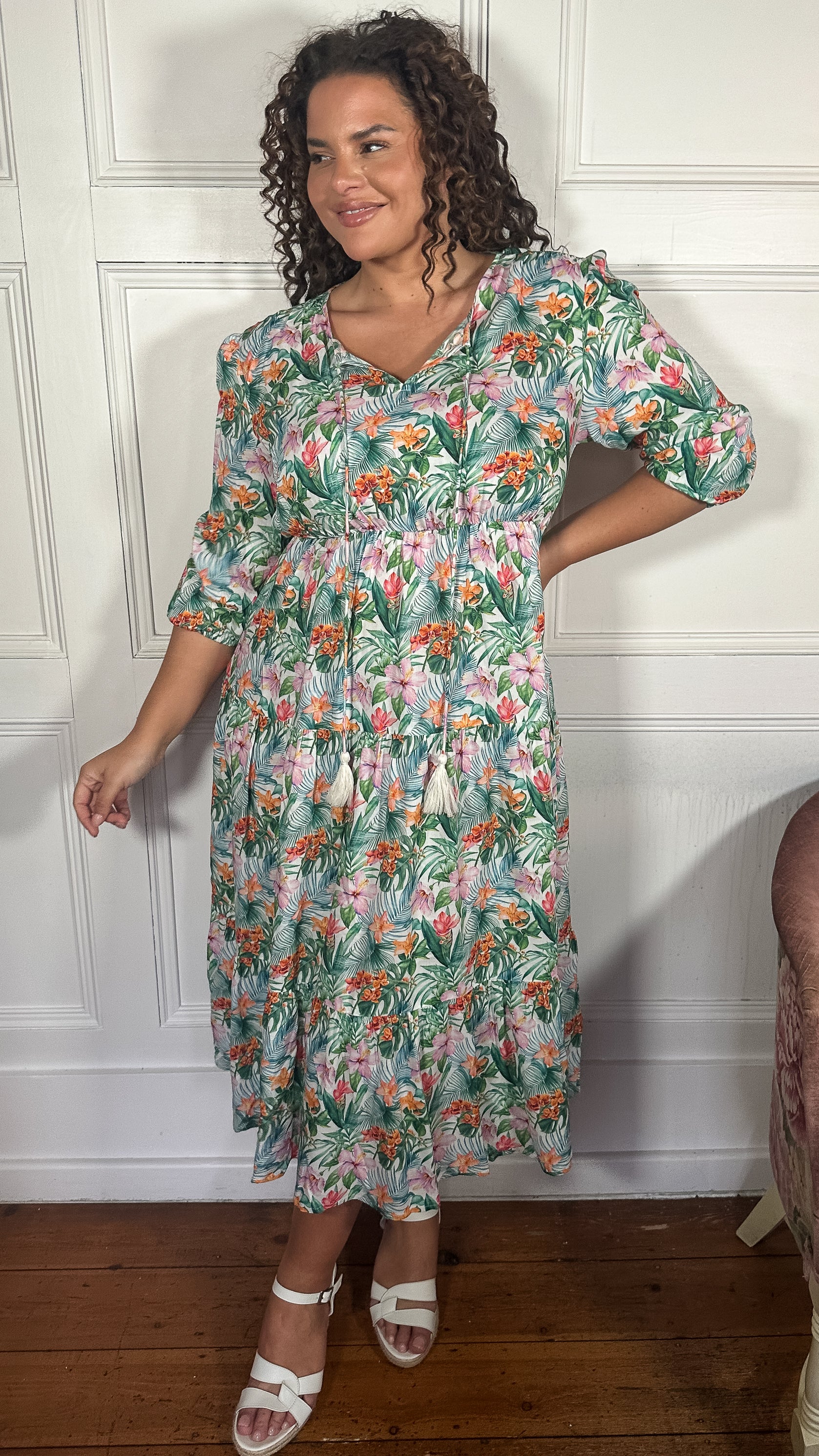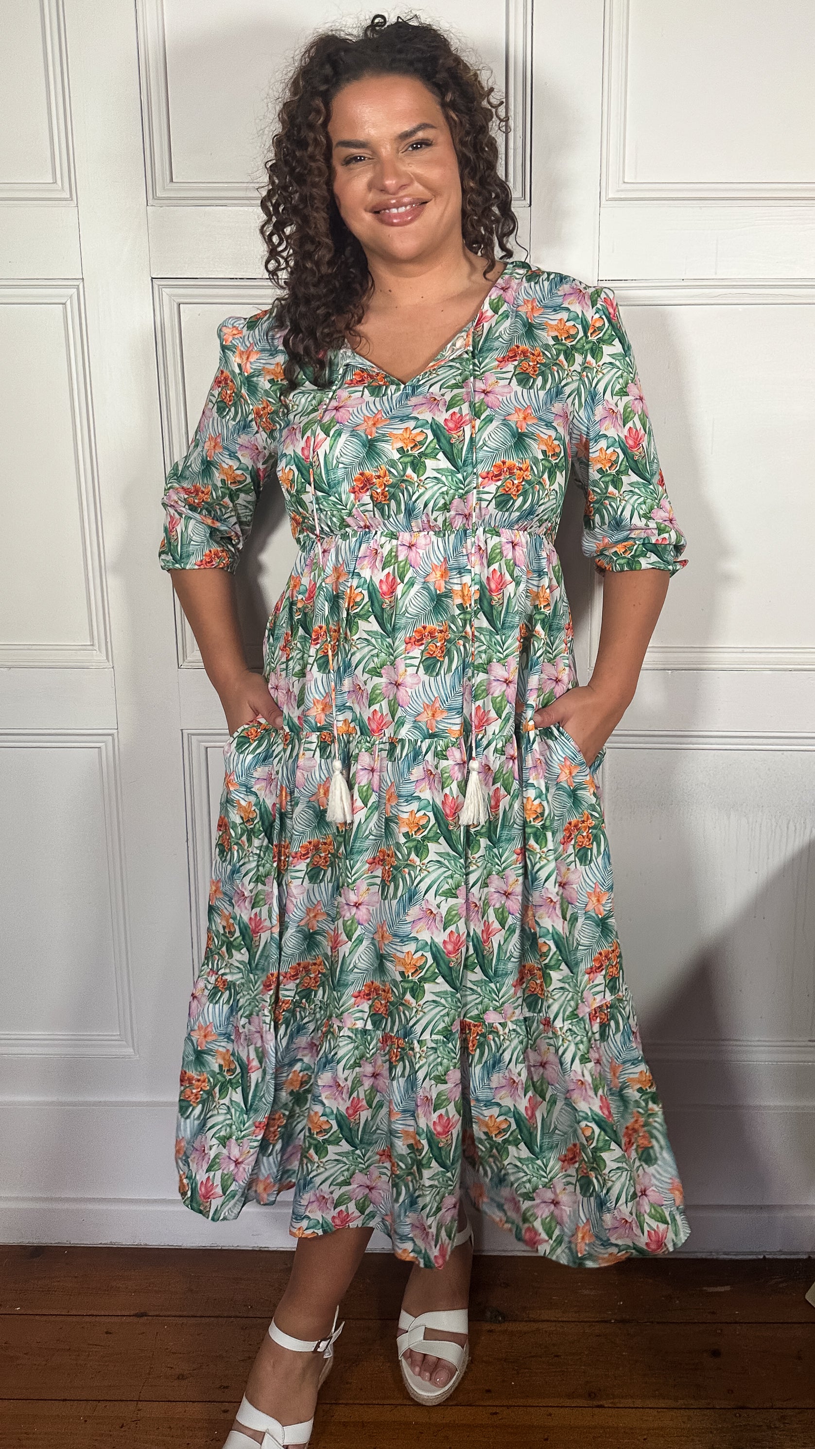 CurveWow Tassel Tie Tiered Maxi Dress White Floral
