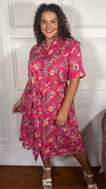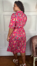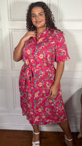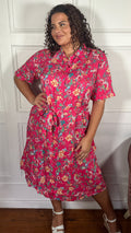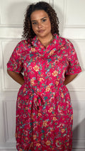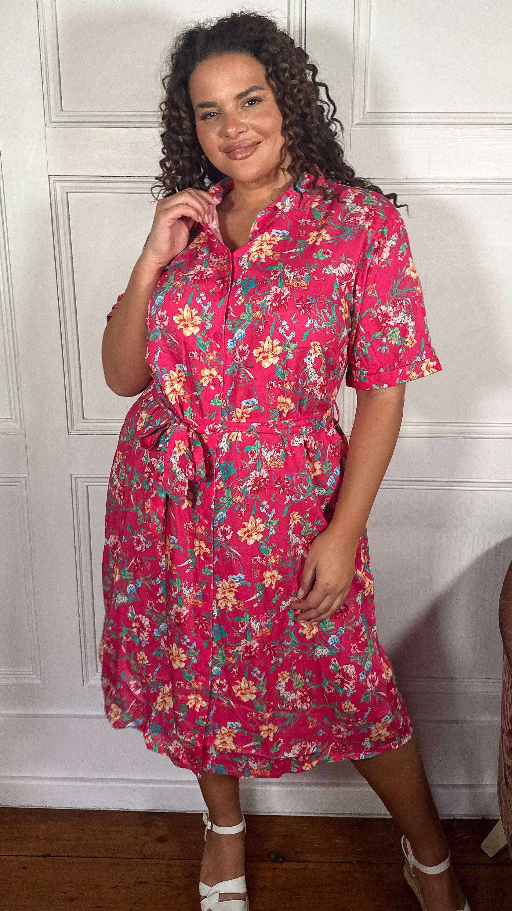 CurveWow Tie Waist Midi Shirt Dress Fuchsia Floral