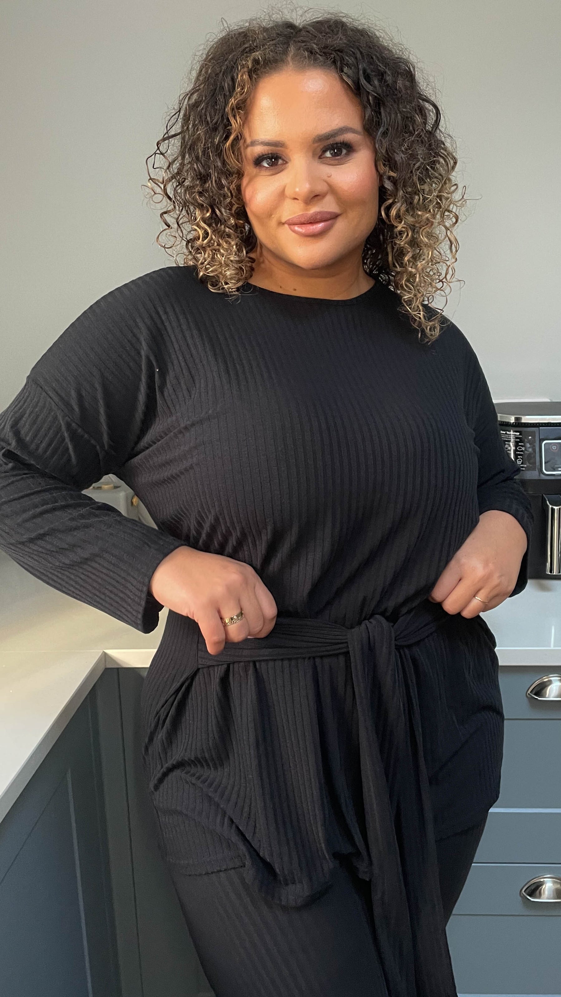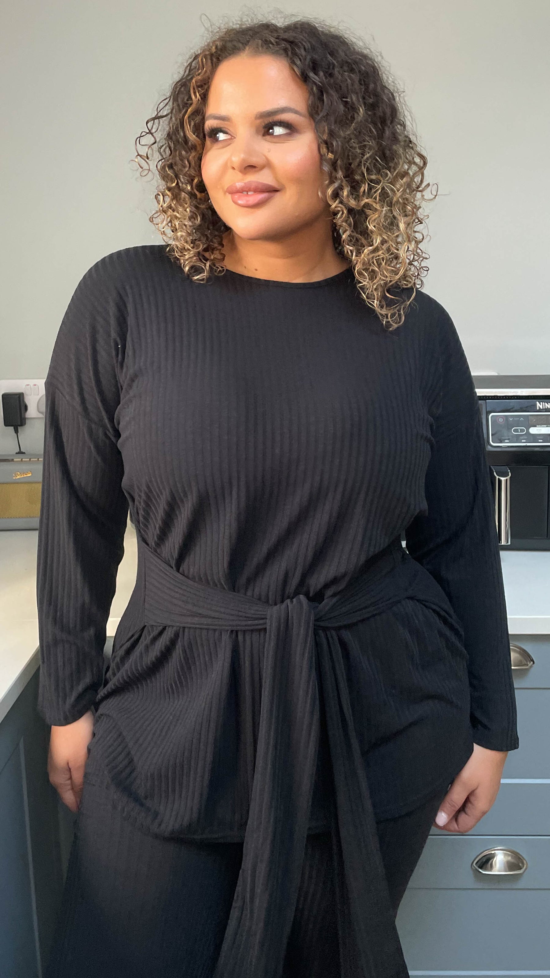 CurveWow Ribbed Tie Waist Lounge Top Black