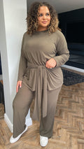 CurveWow Ribbed Tie Waist Lounge Top Khaki