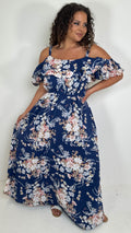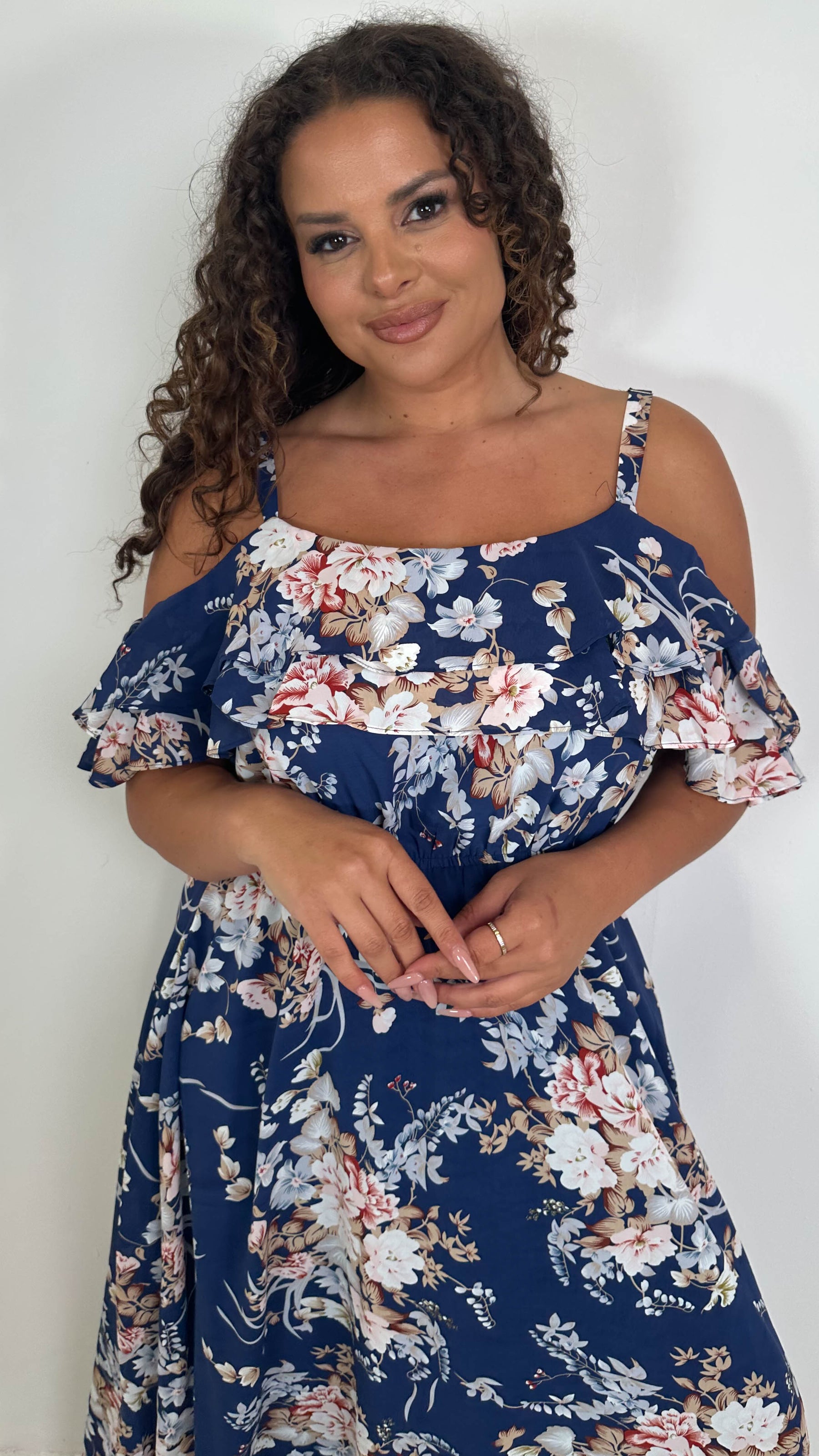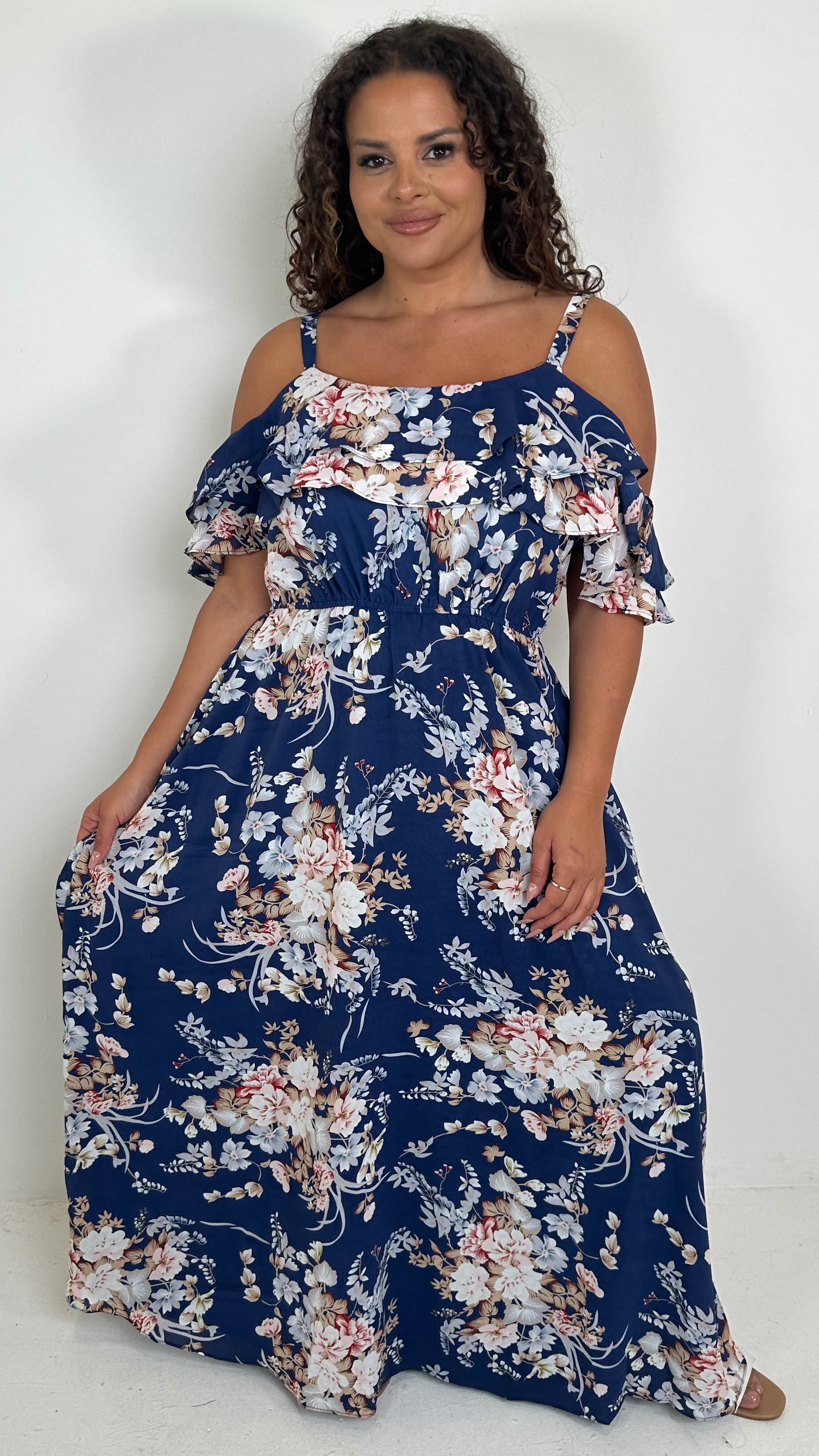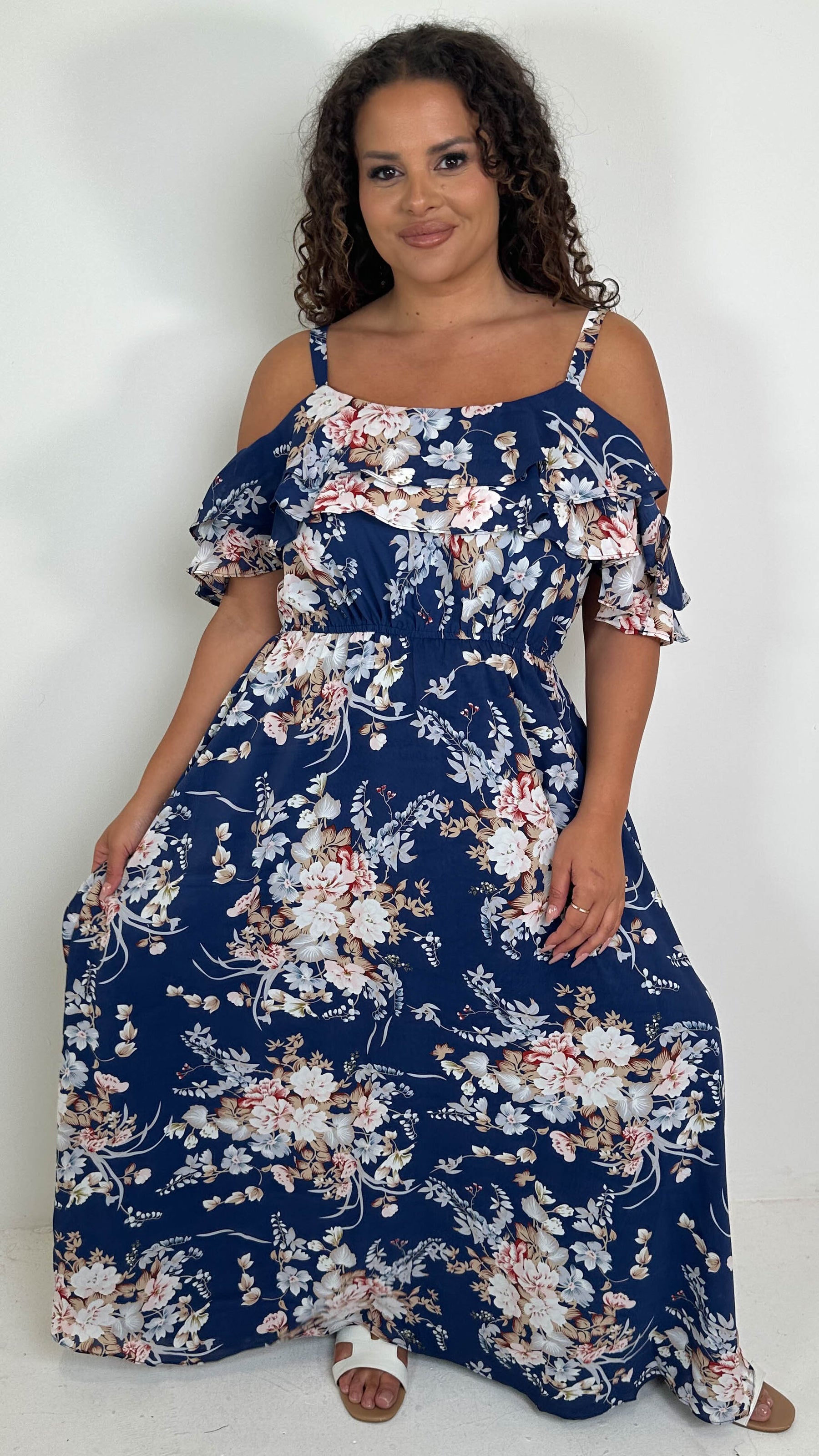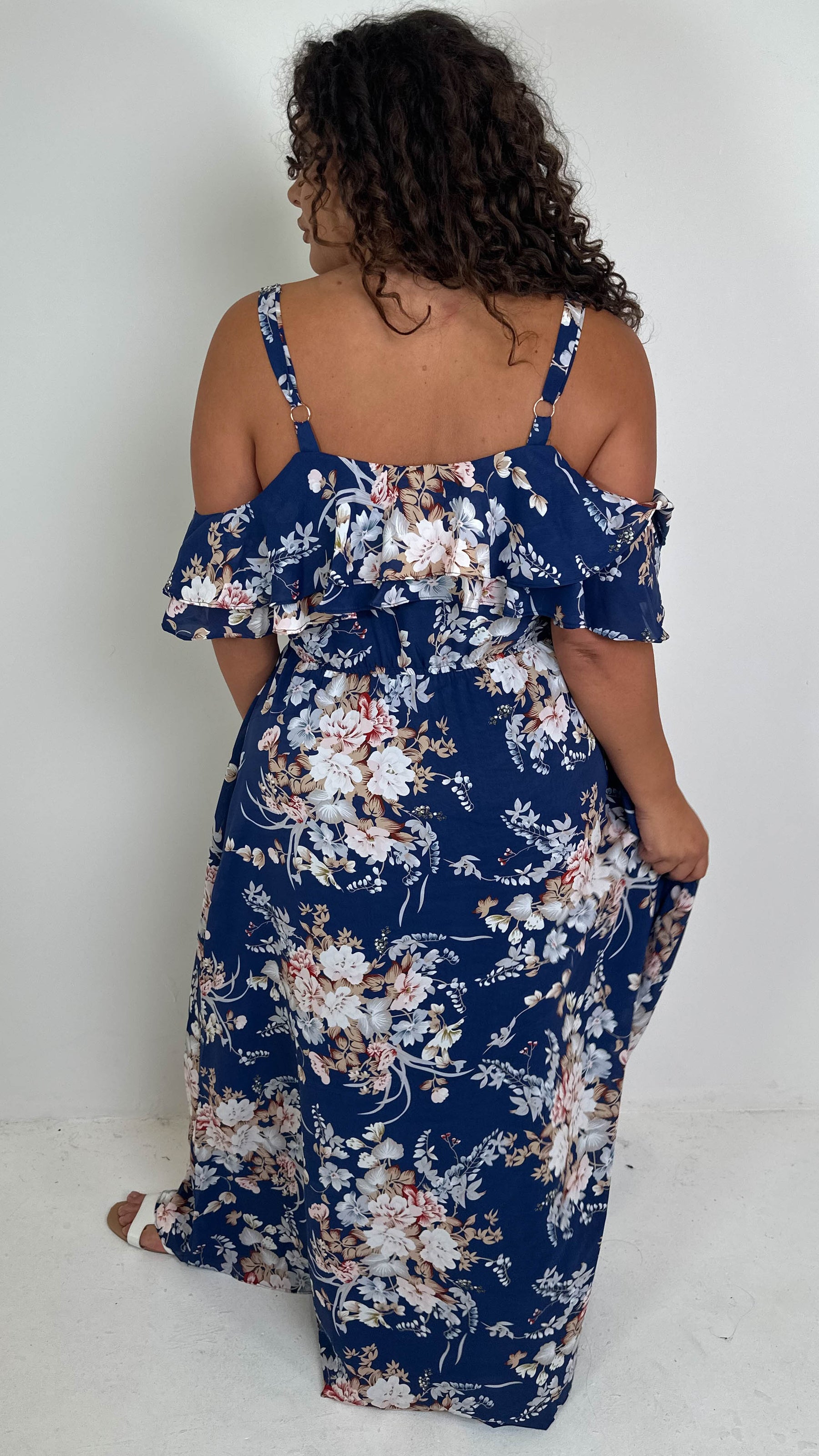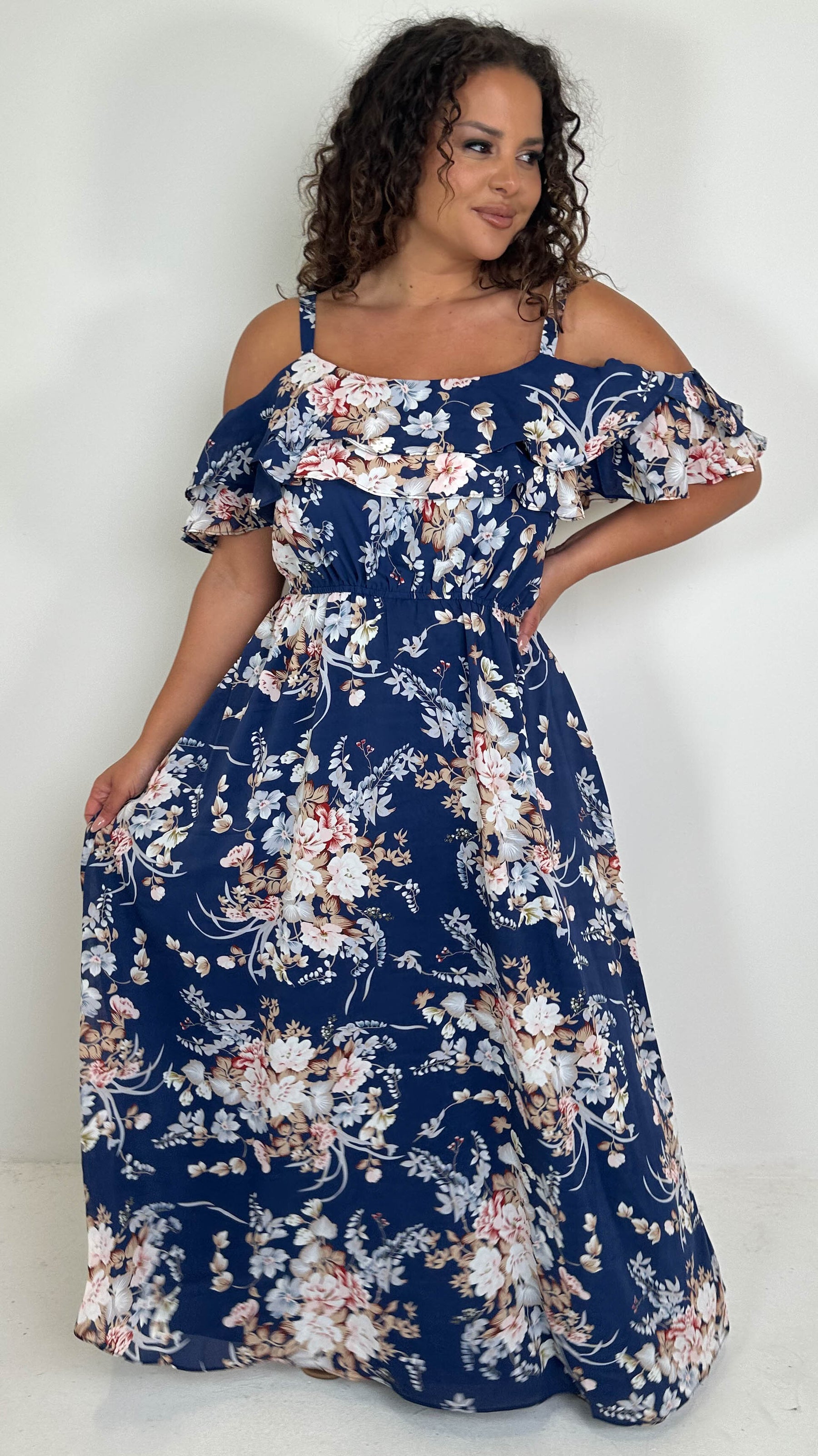 CurveWow Ruffle Cold Shoulder Maxi Dress Navy Floral