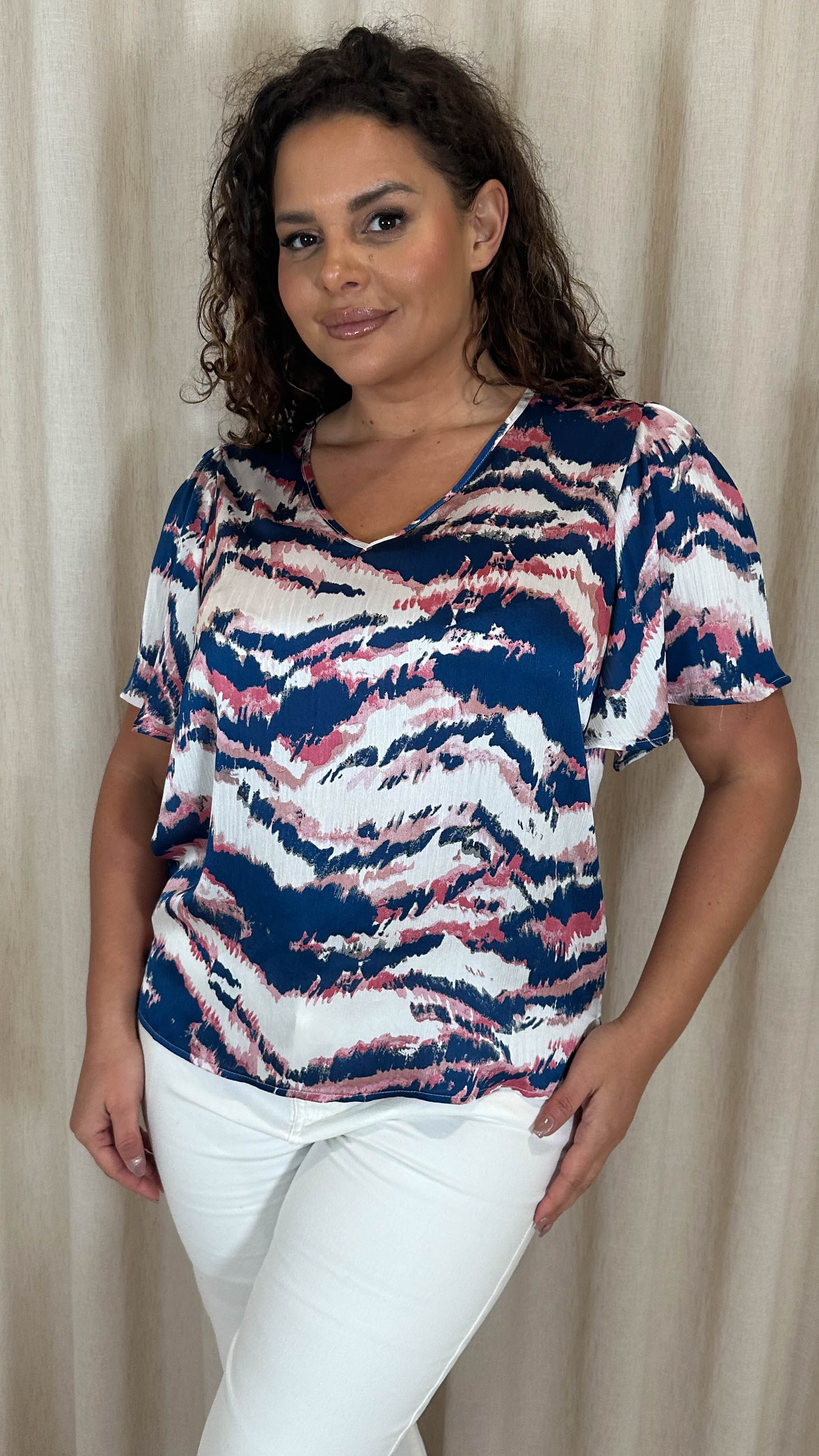 CurveWow Satin Angel Sleeve Top Blue Blurred Print