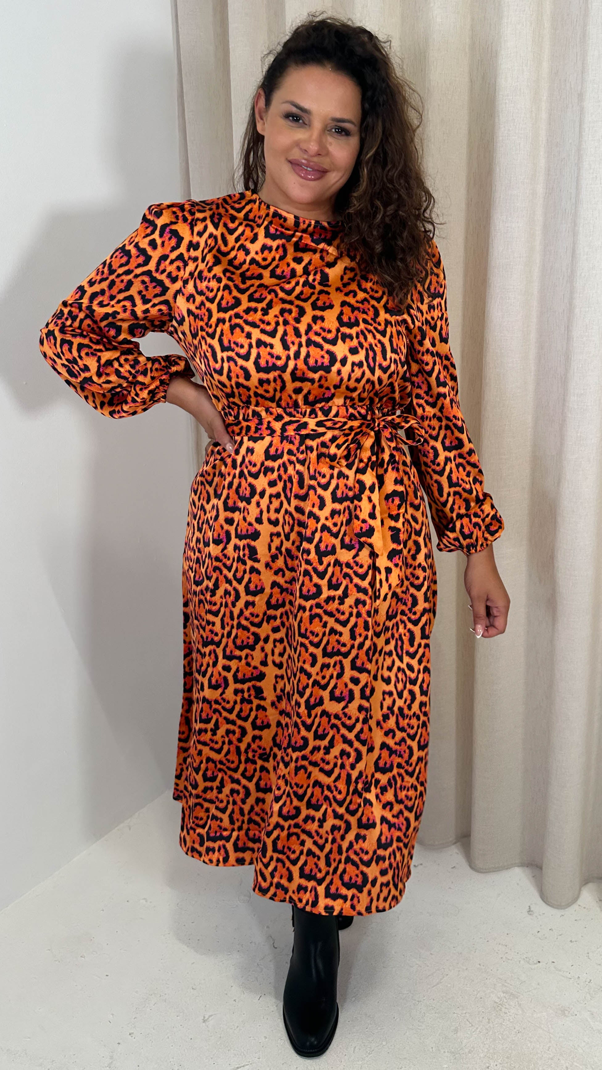 CurveWow Satin Tie Waist Midi Dress Orange Leopard