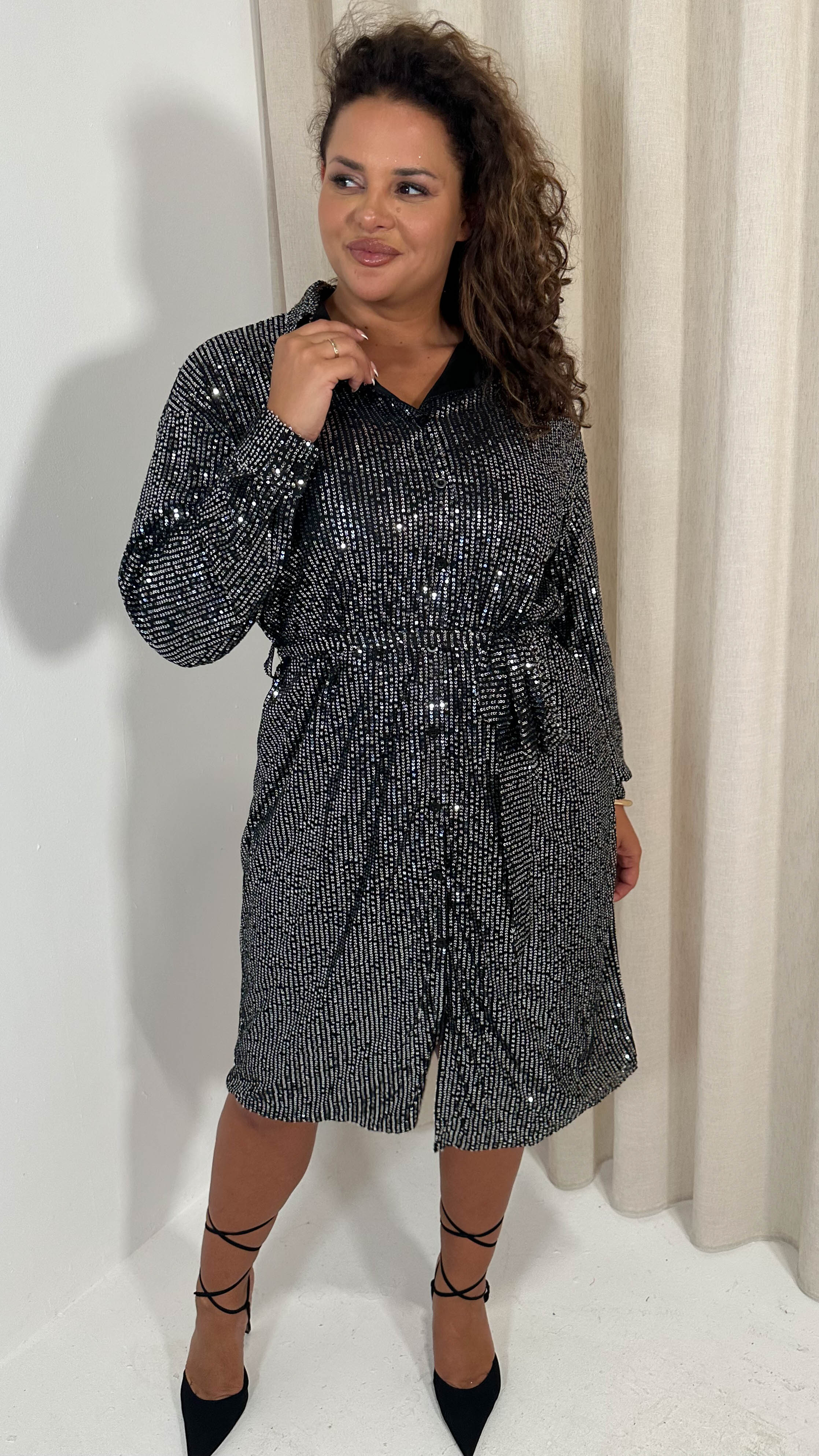 CurveWow Sequin Midi Tie Waist Shirt Dress Silver
