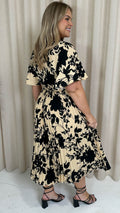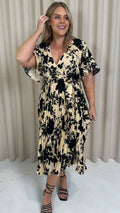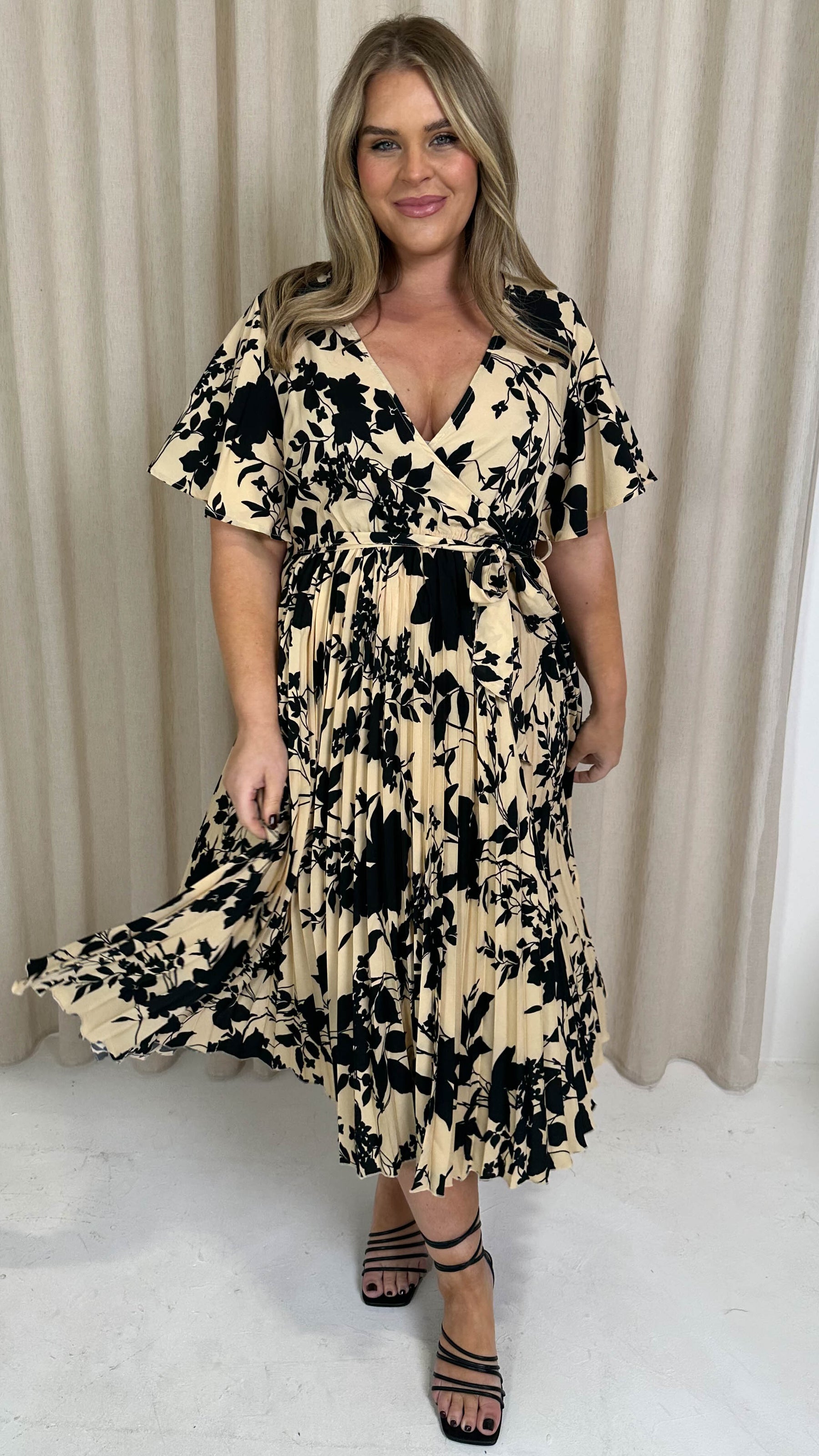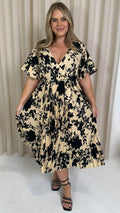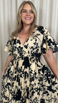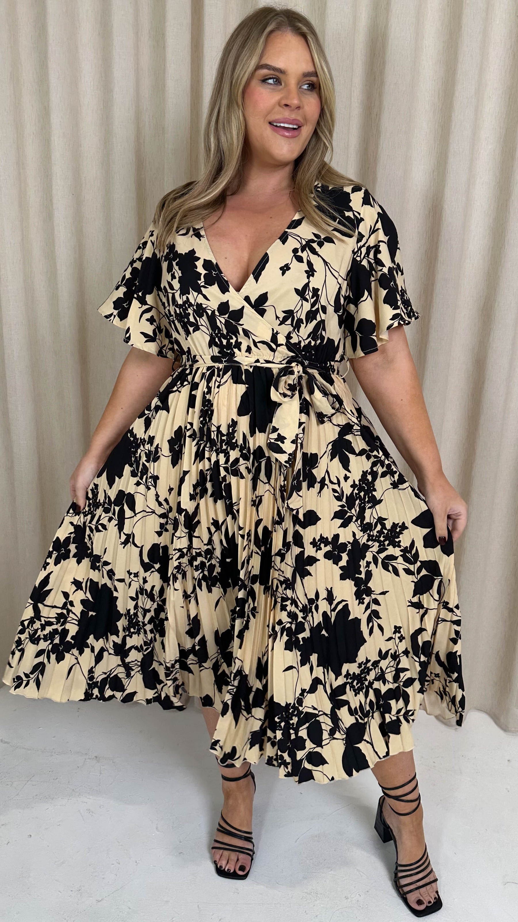 CurveWow Short Sleeve Pleated Midi Dress Nude/Black Floral