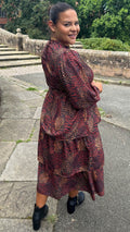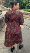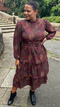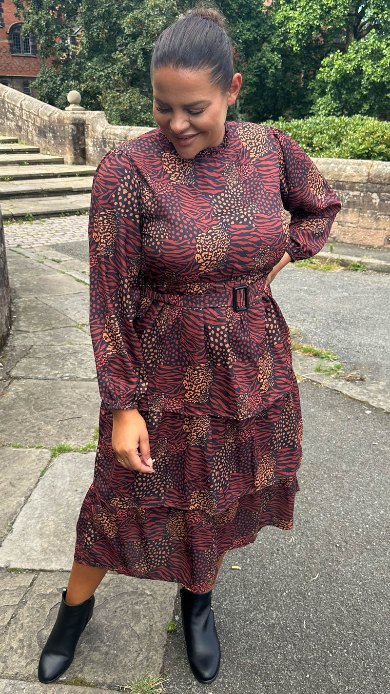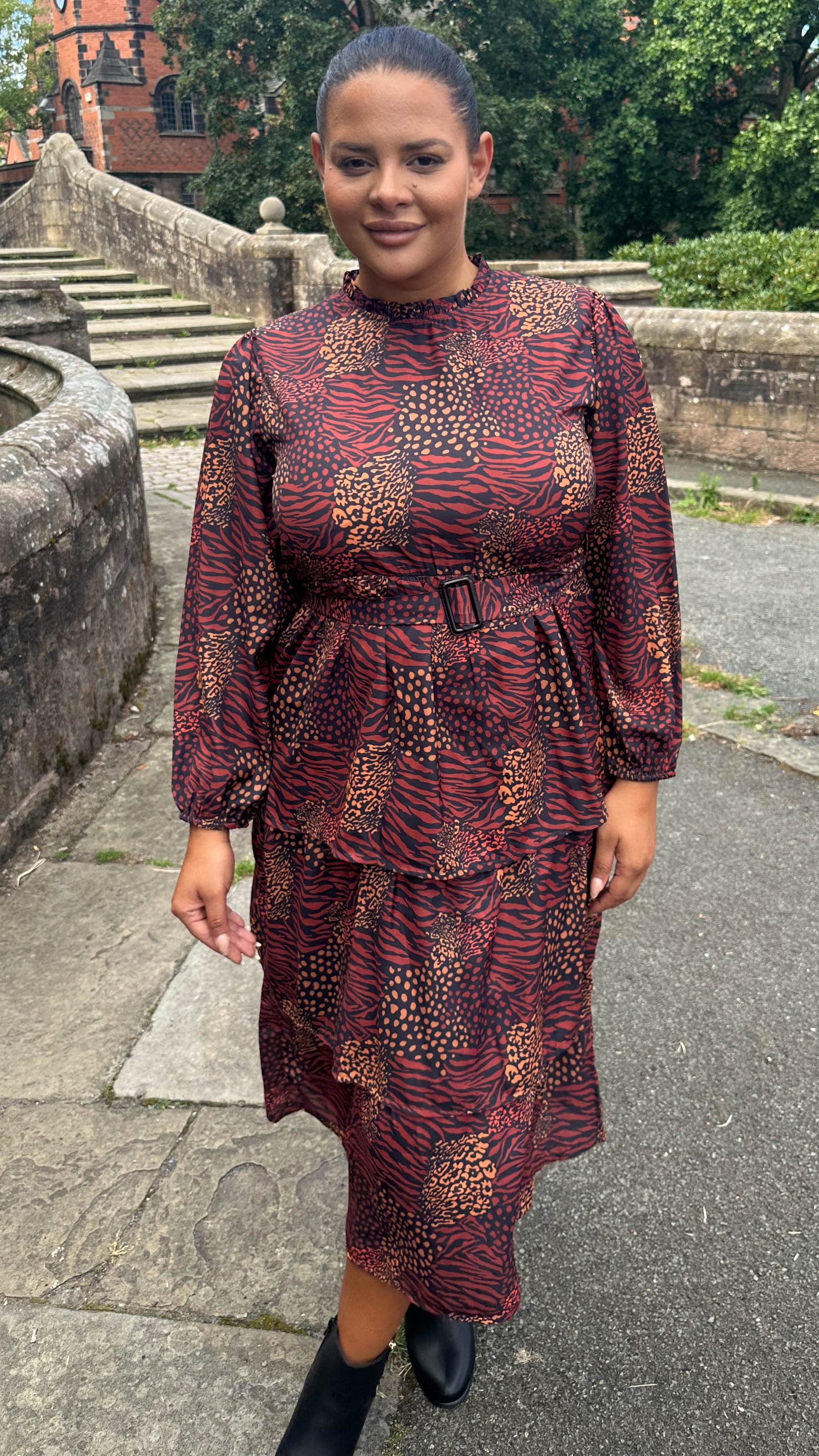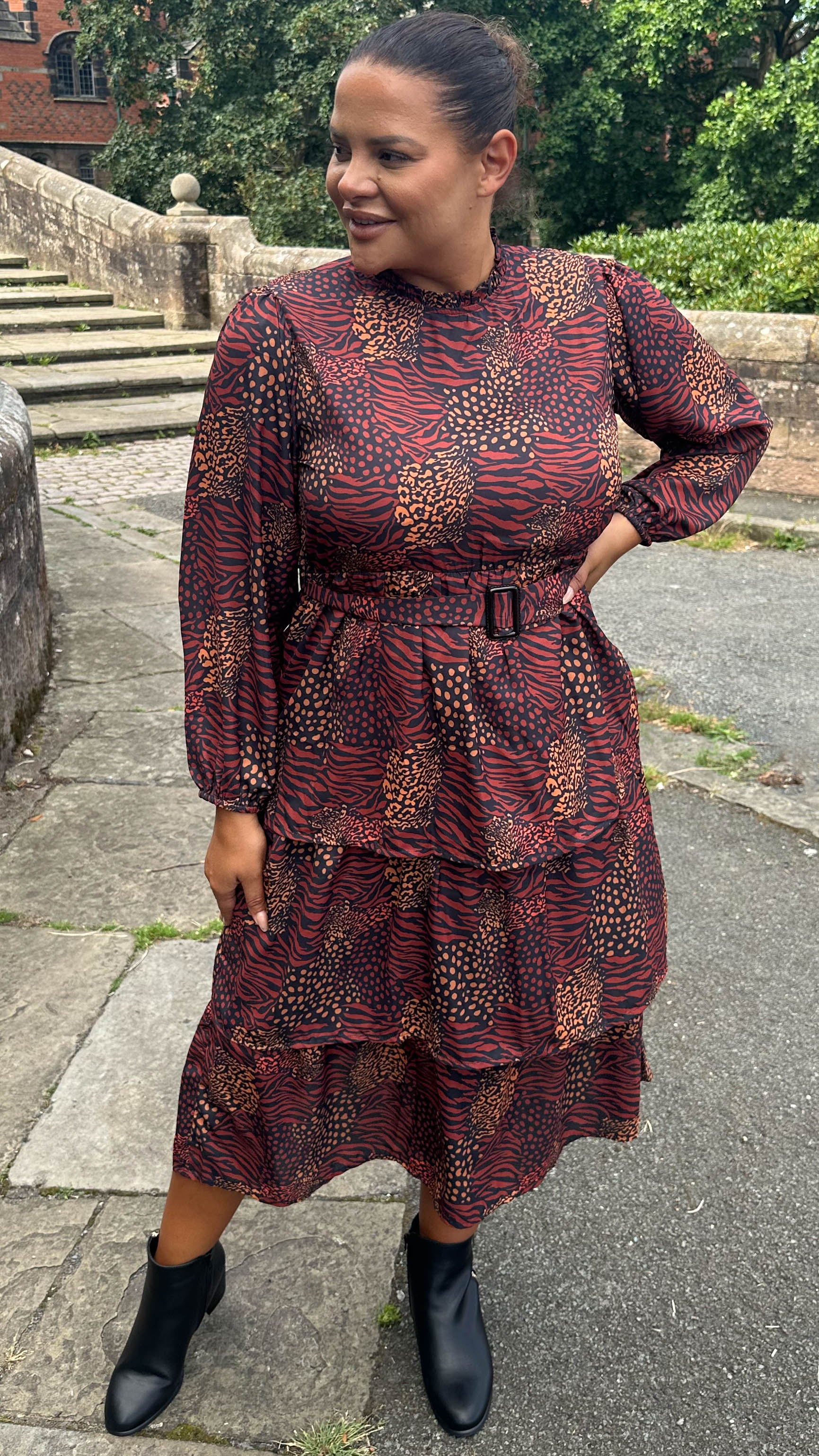CurveWow Tiered Belt Midi Dress Rust Mixed Animal