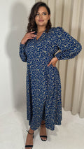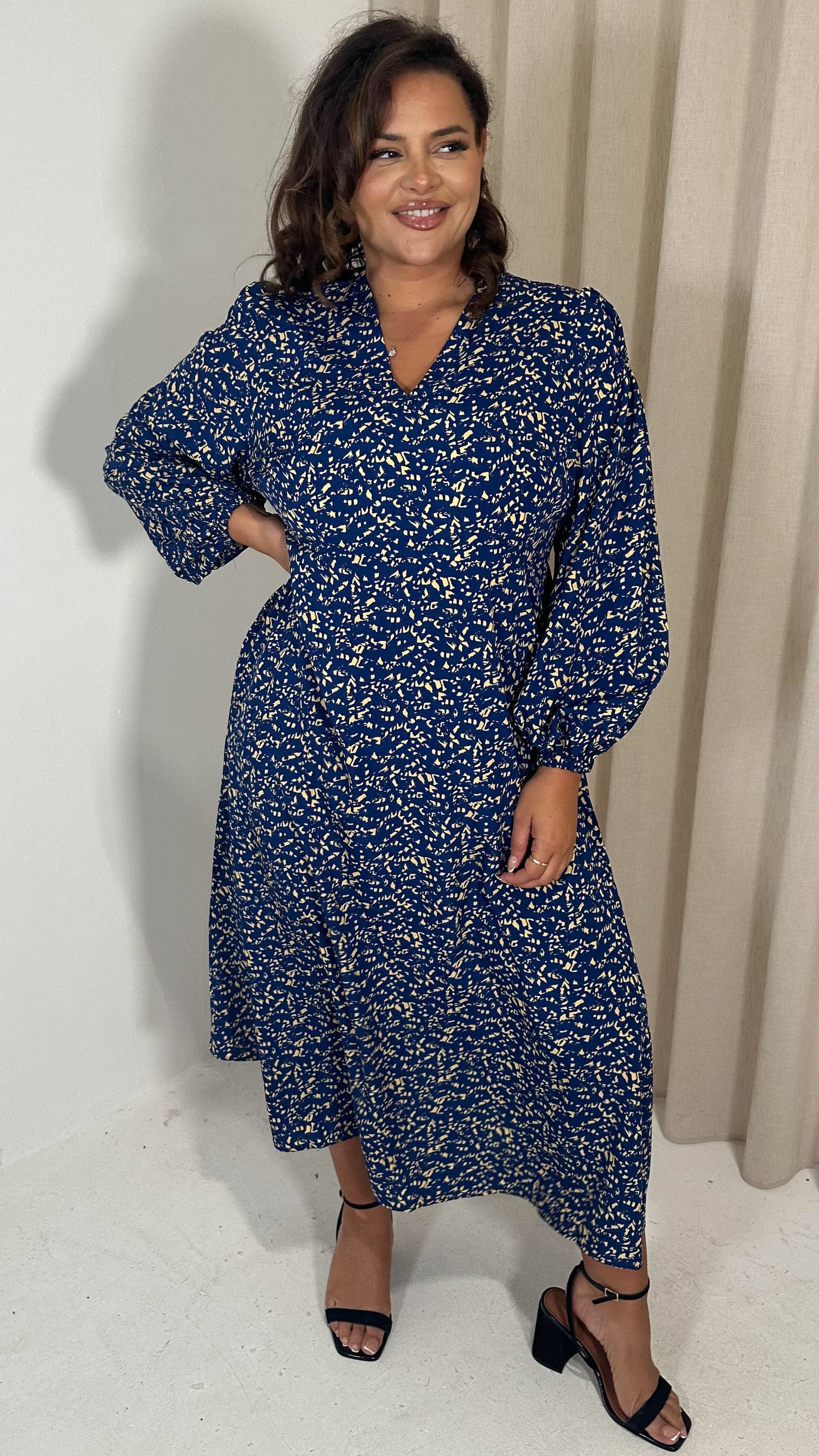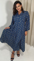 CurveWow V Neck Puff Sleeve Midaxi Dress Navy Animal