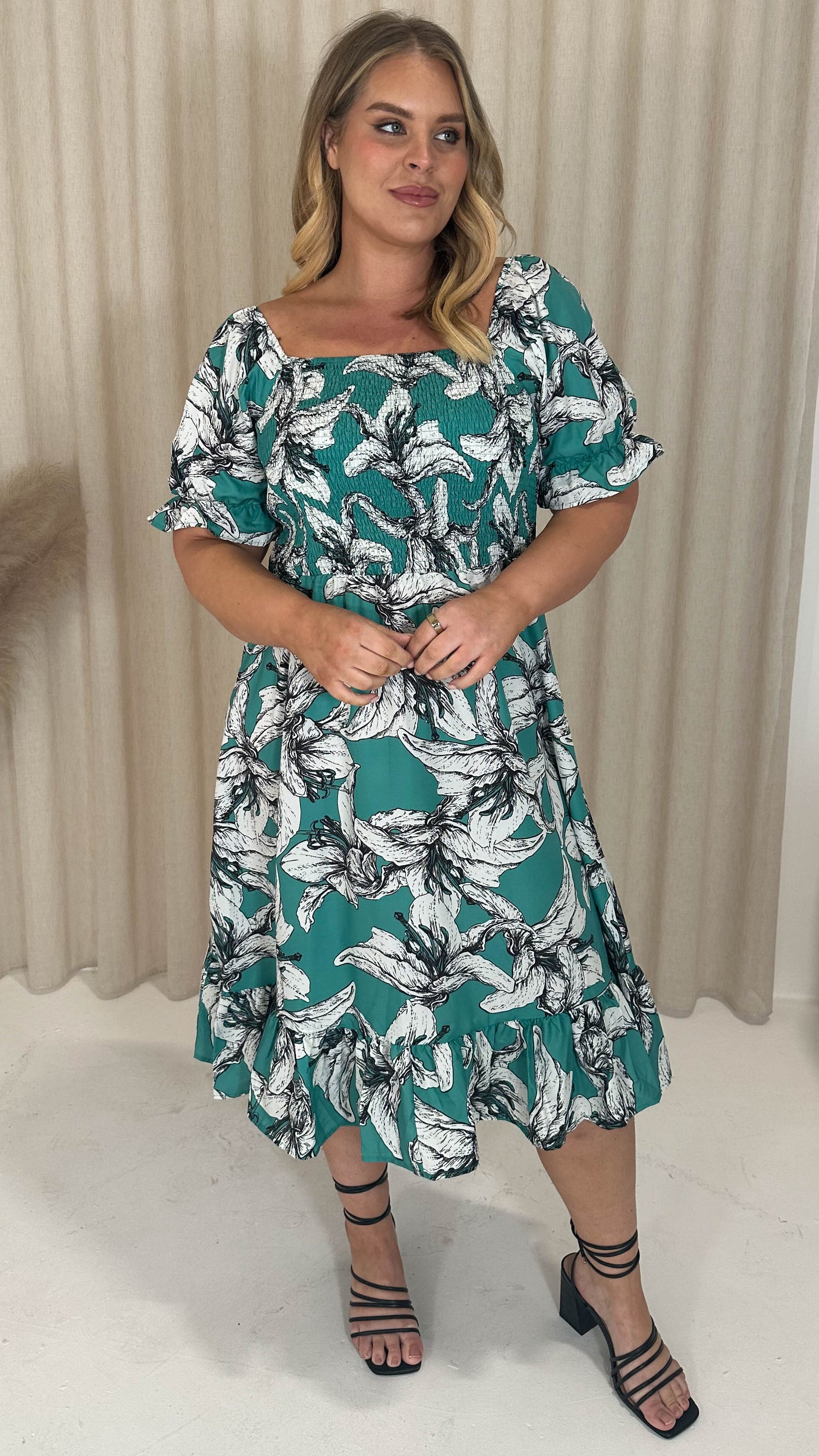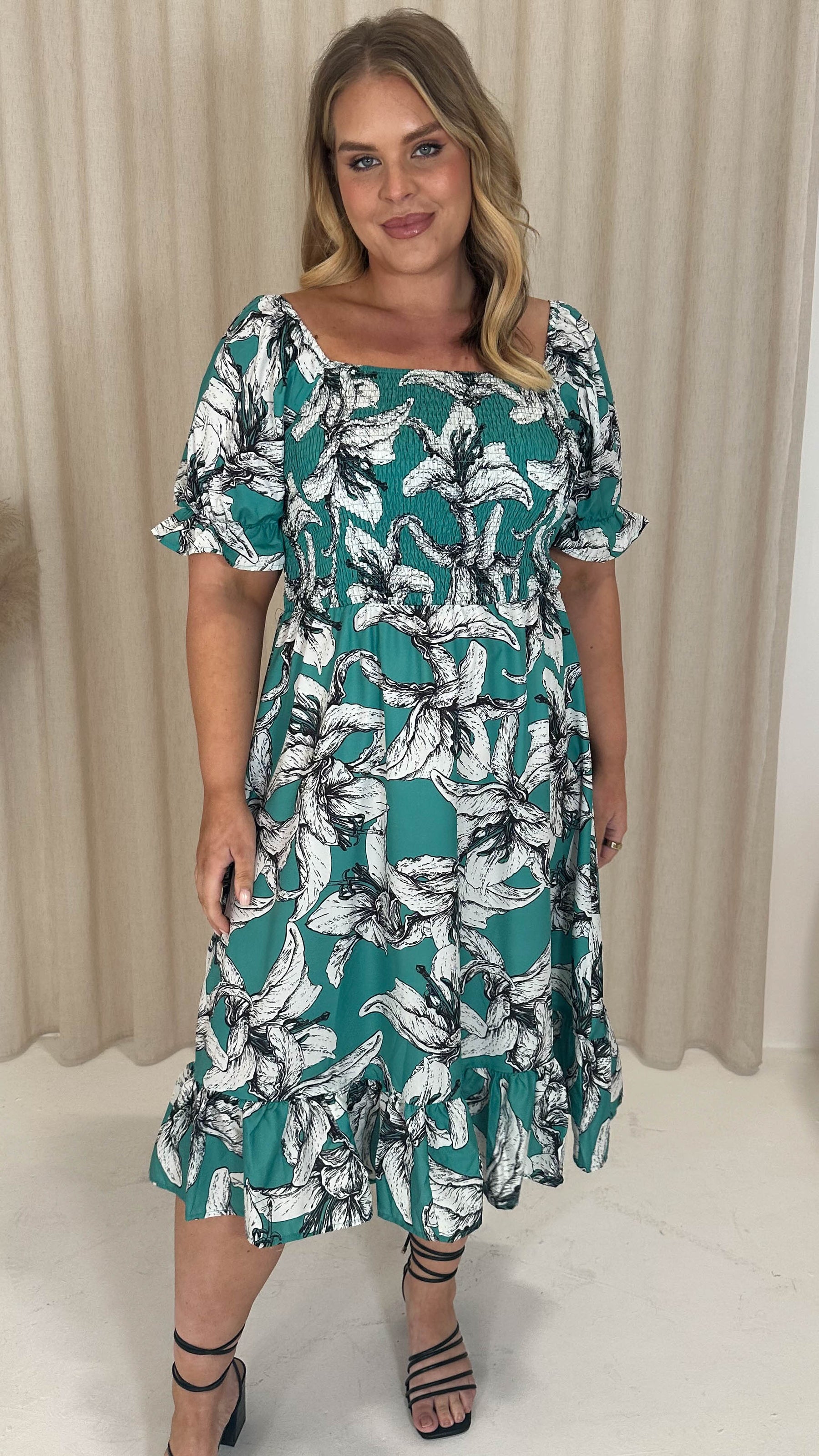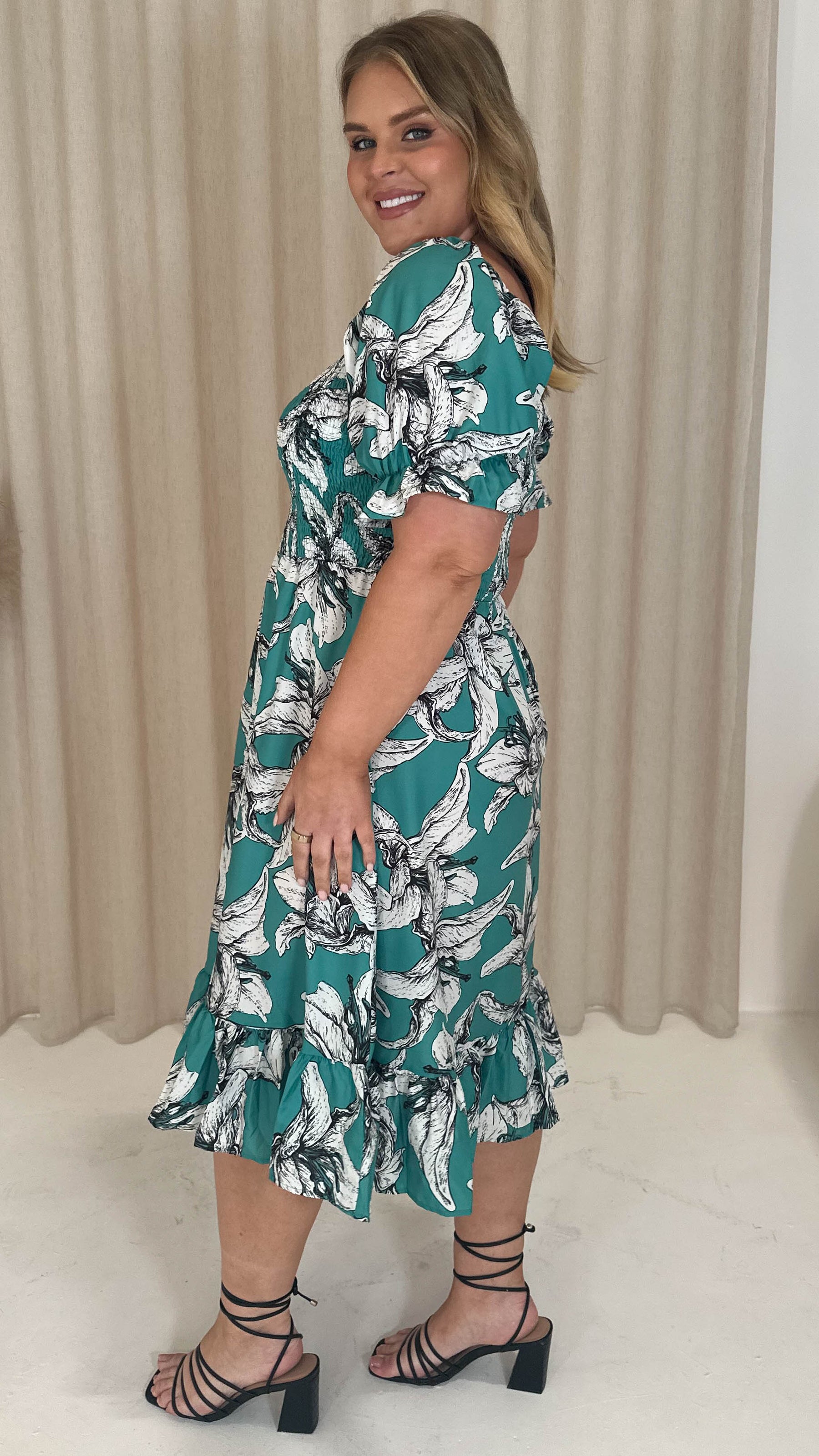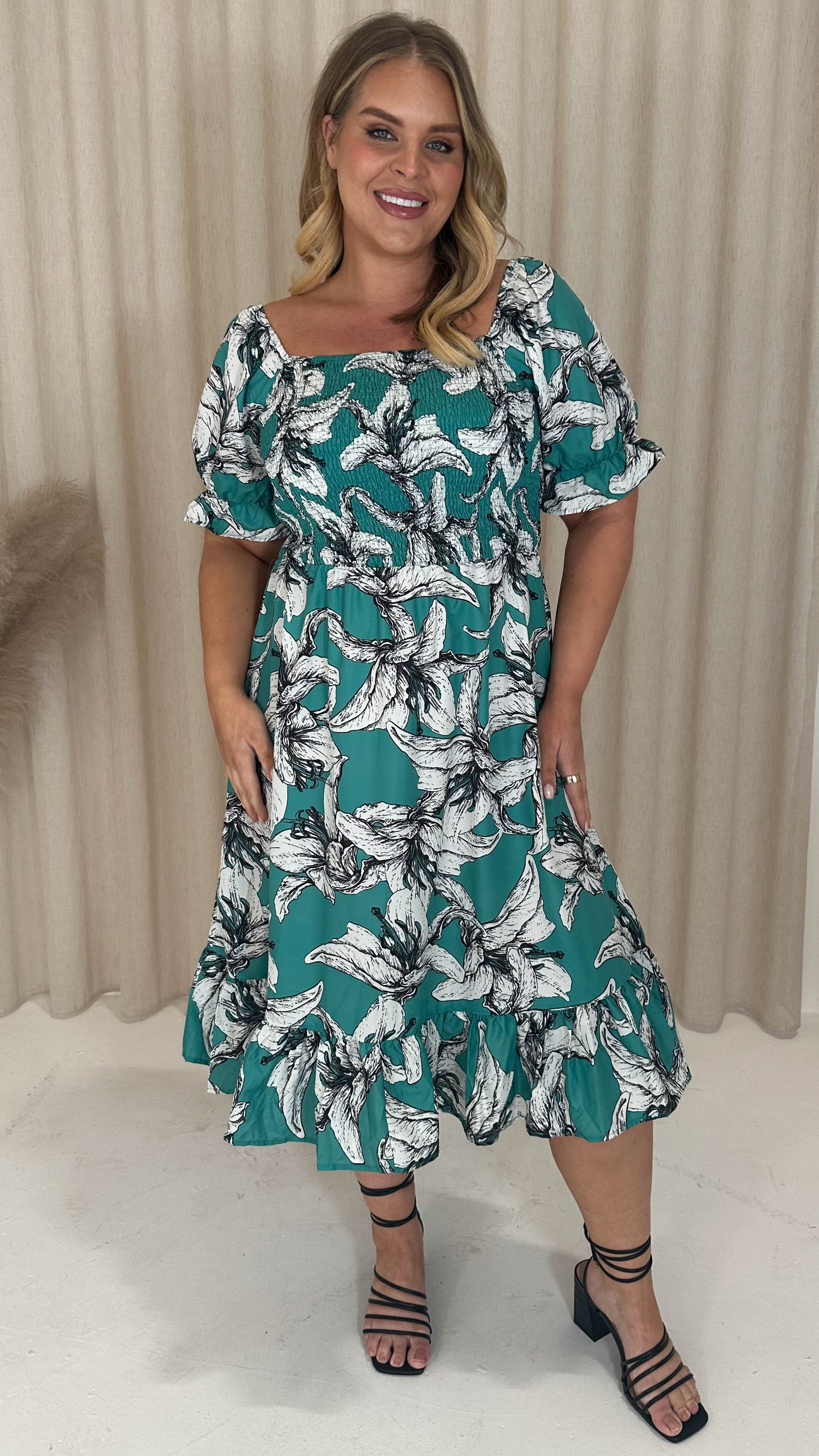 CurveWow Square Neck Shirred Midi Dress Turquoise Floral