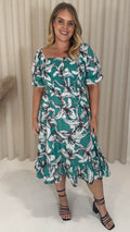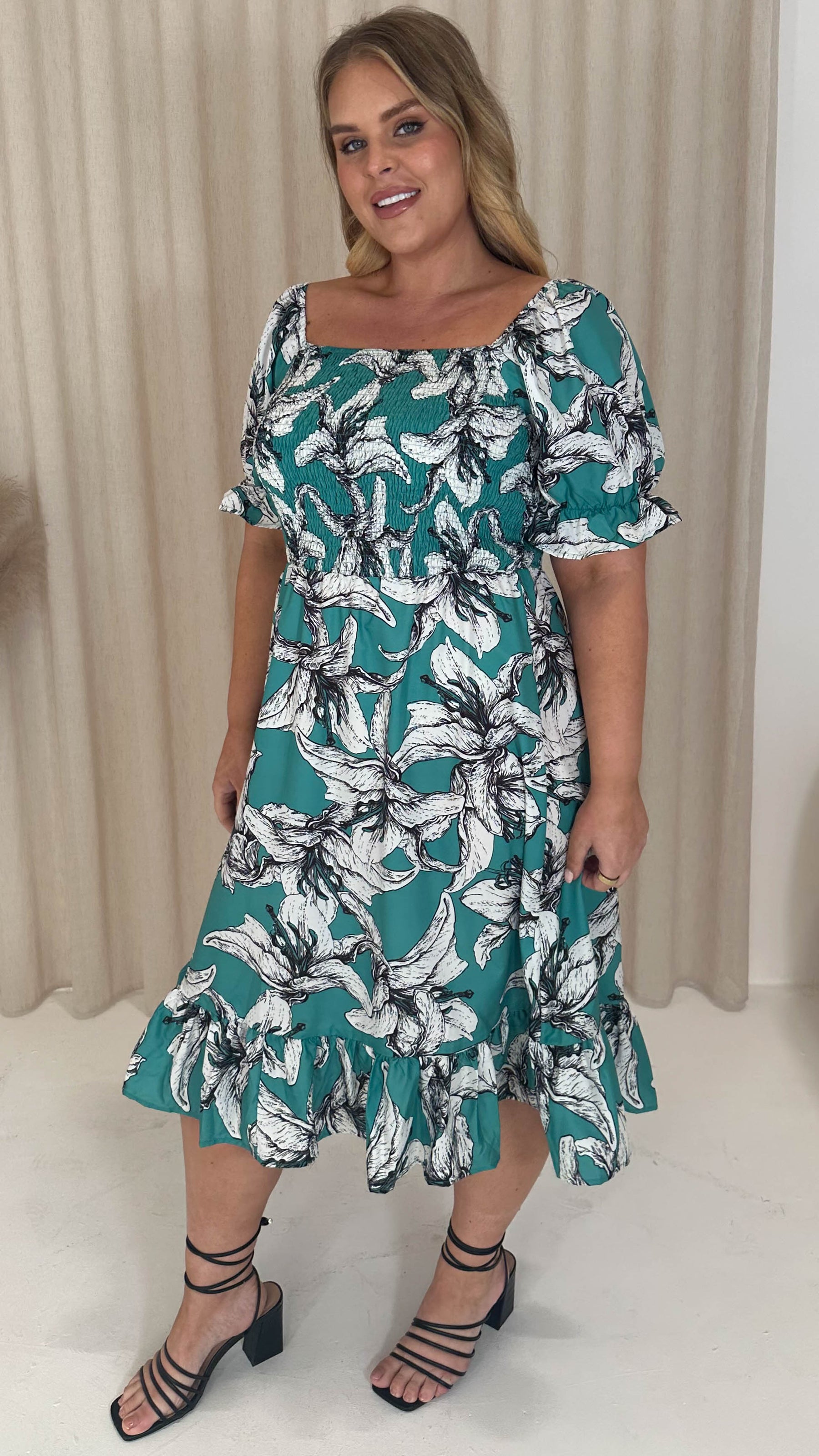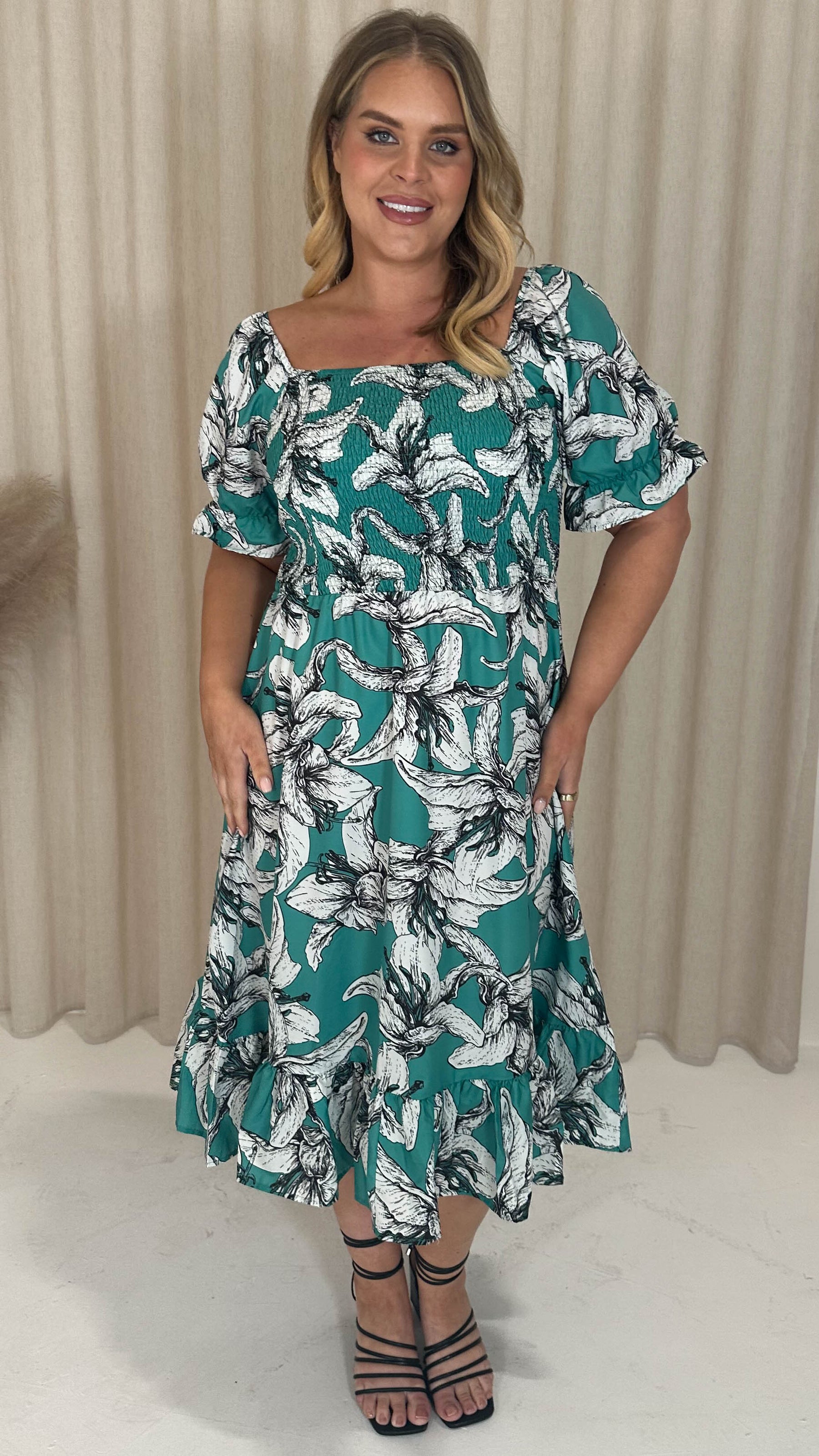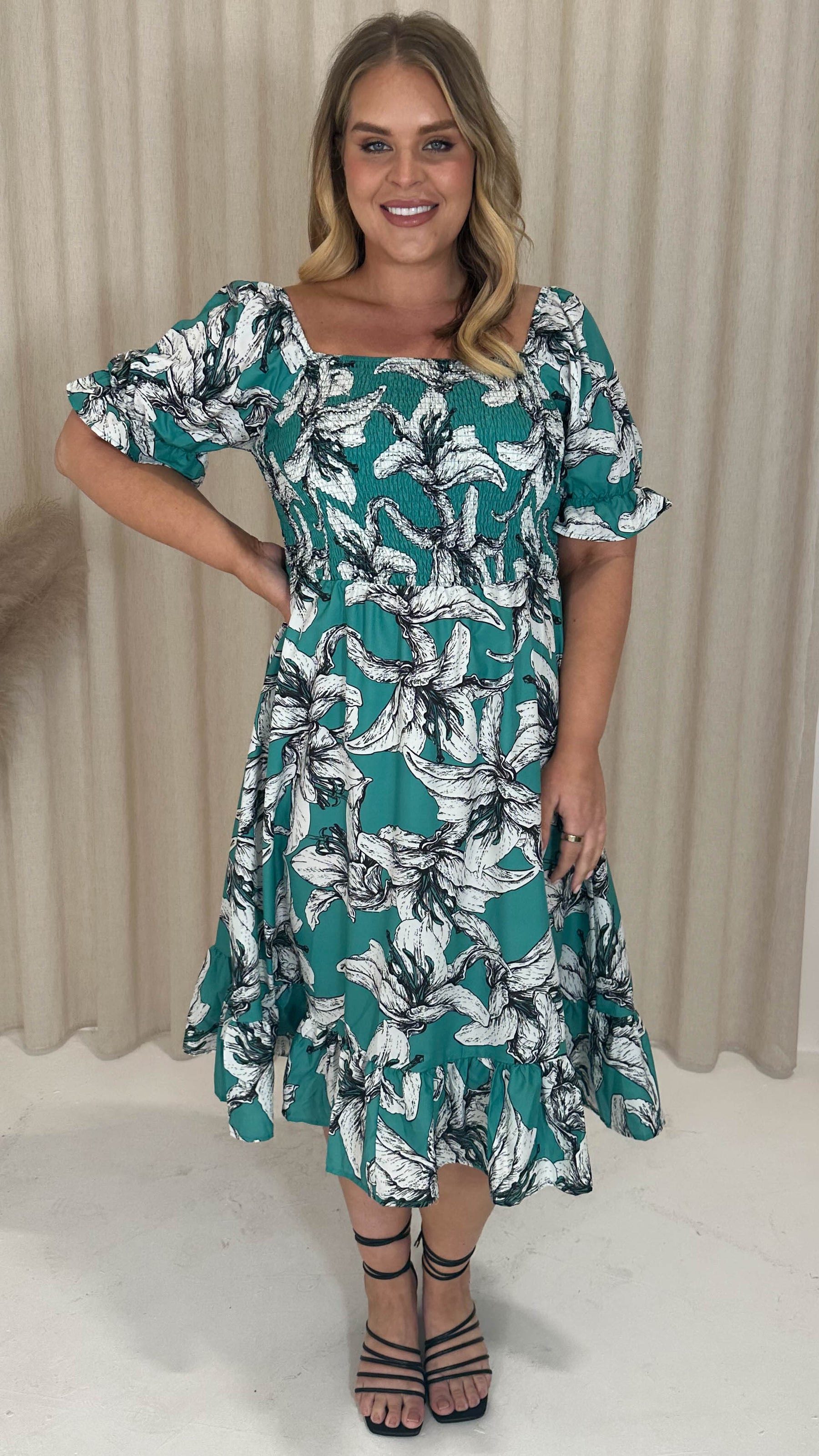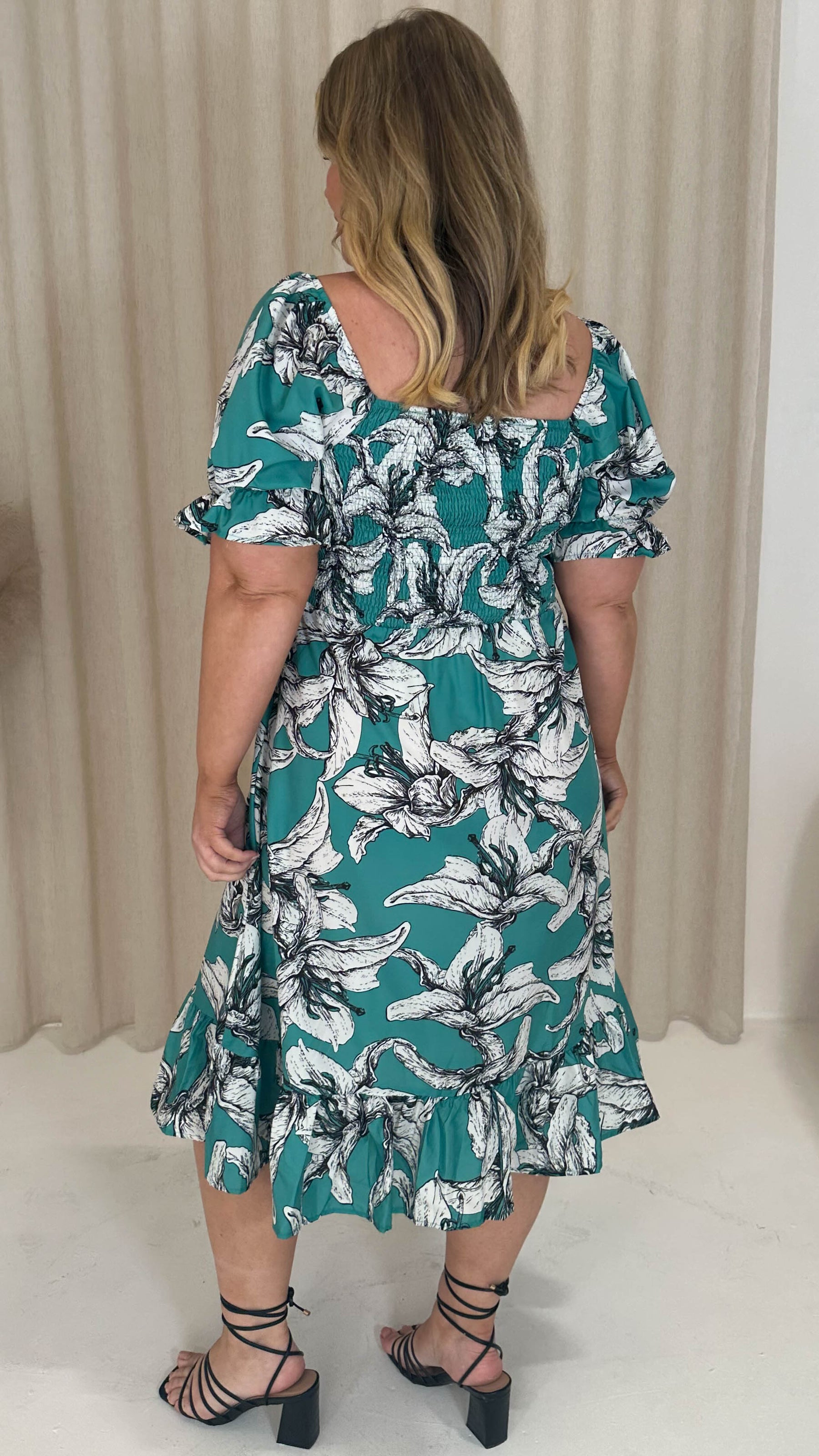 CurveWow Square Neck Shirred Midi Dress Turquoise Floral