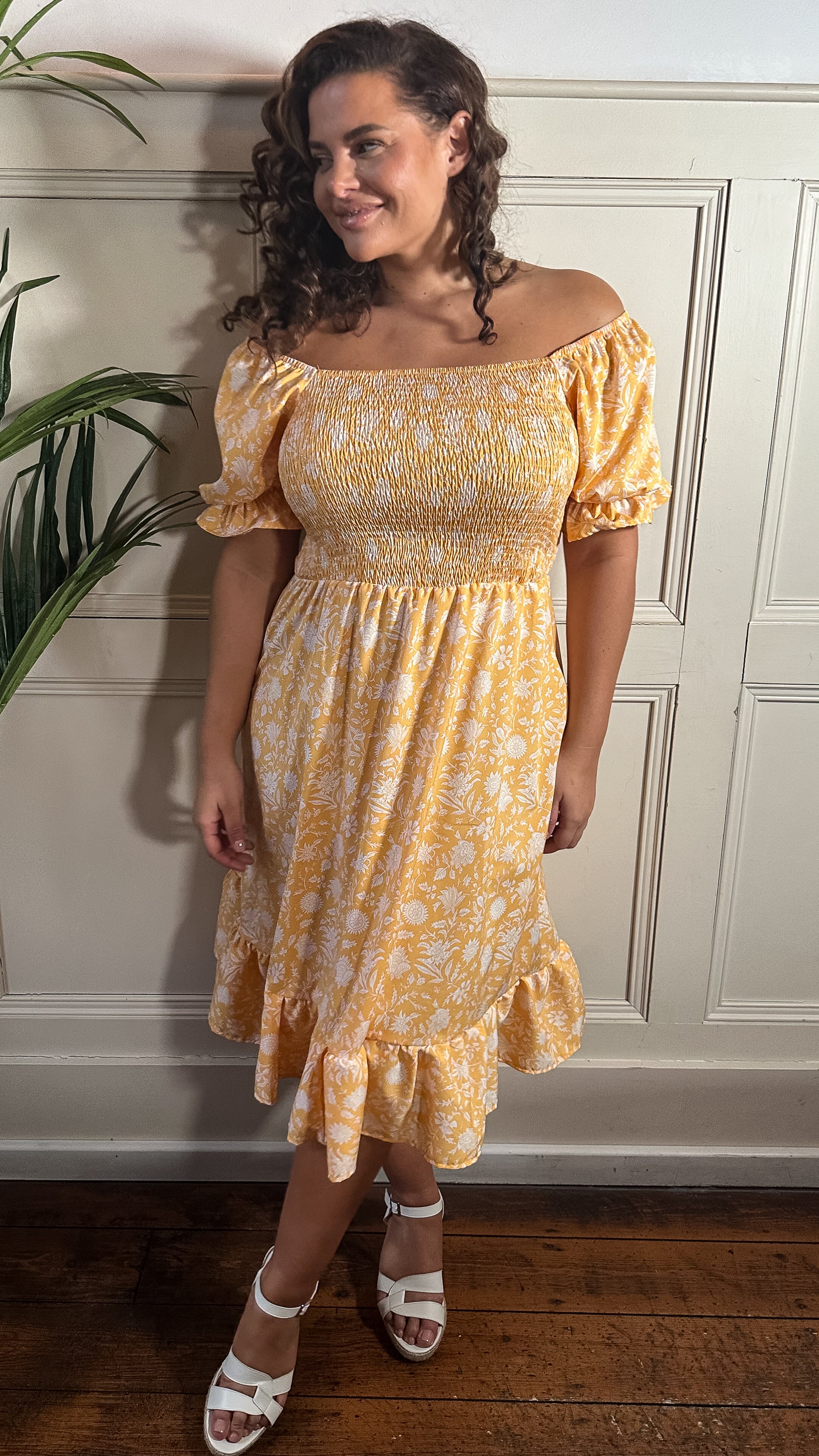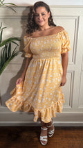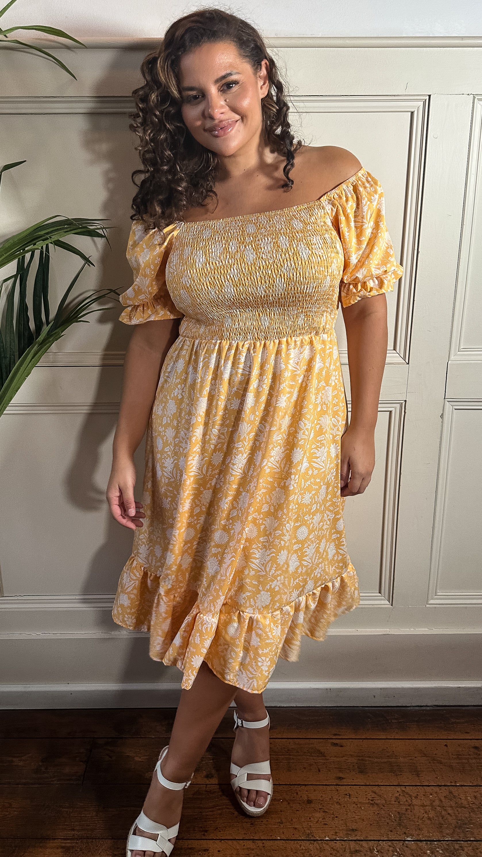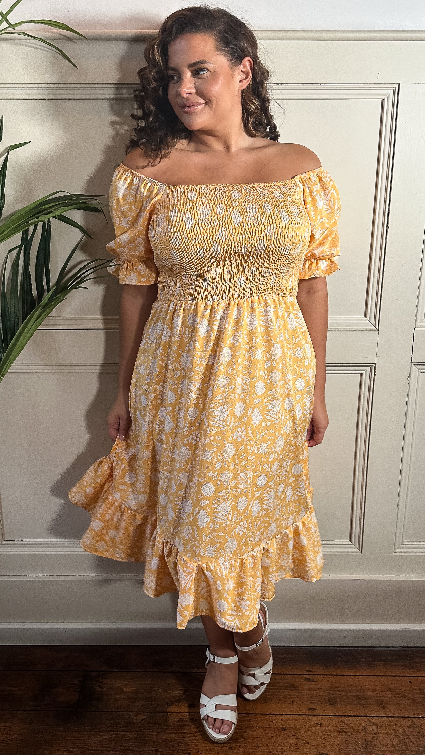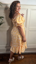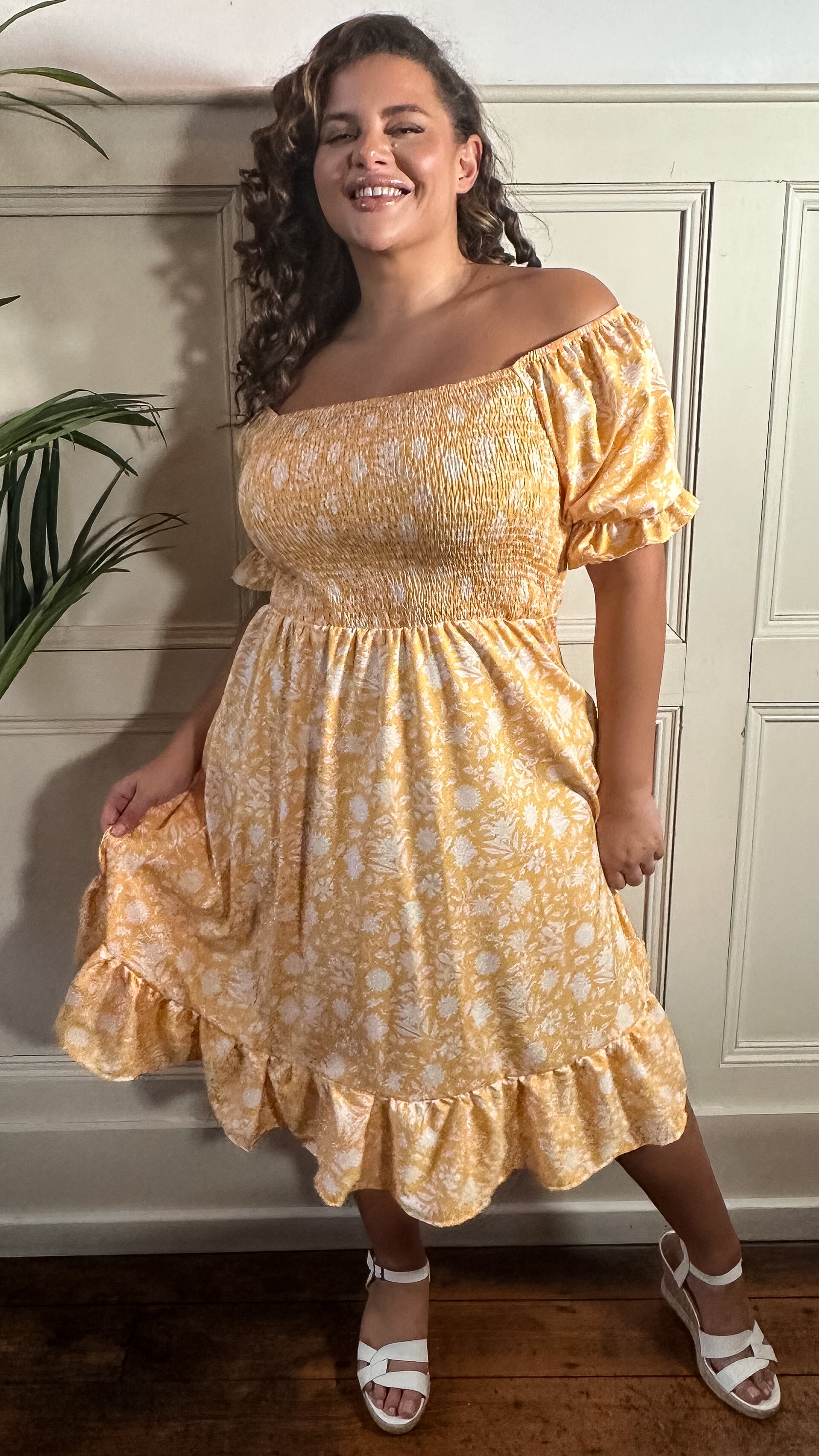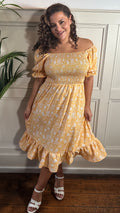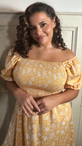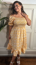 CurveWow Square Neck Shirred Midi Dress Yellow Floral