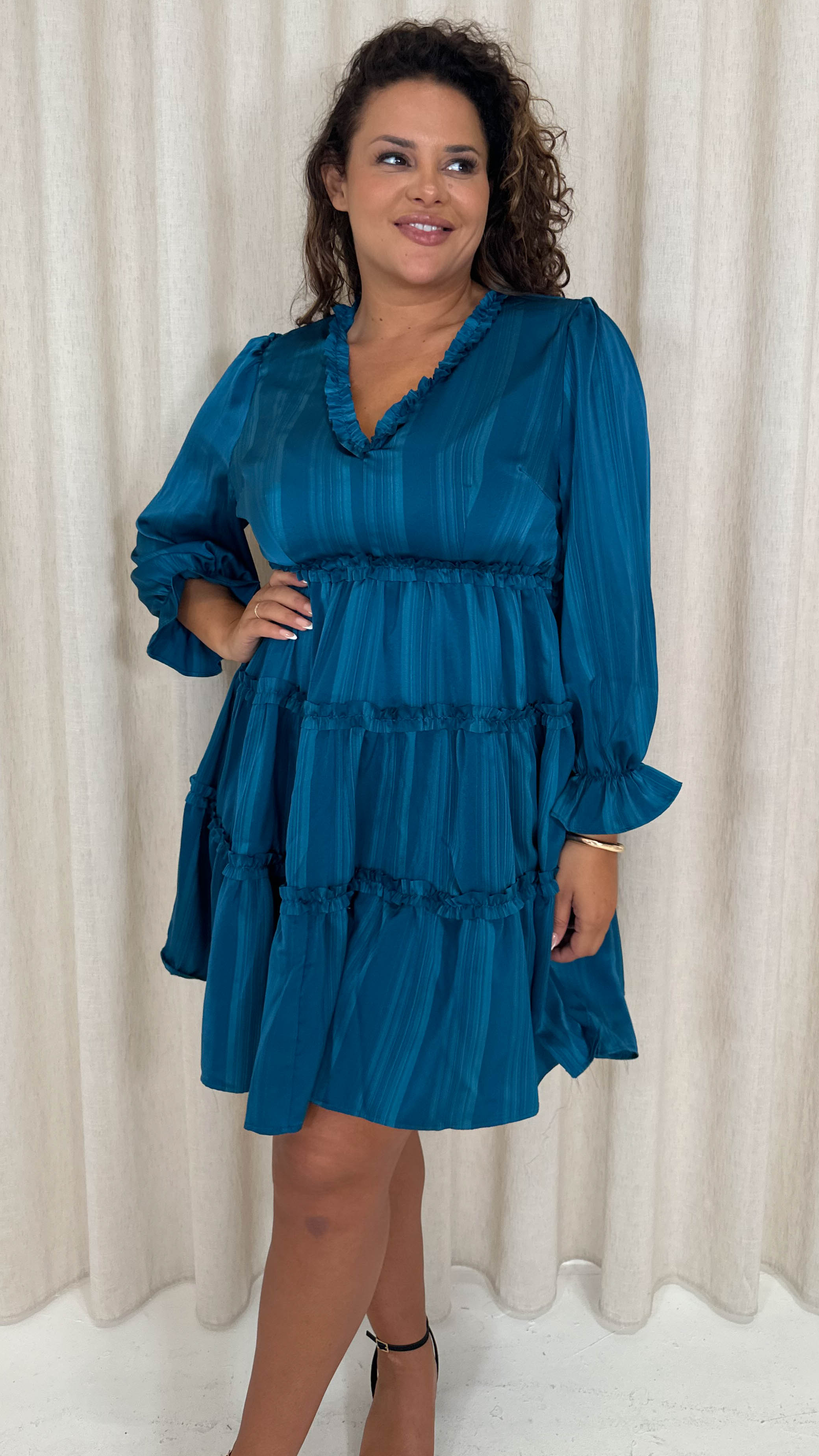 CurveWow Striped Satin Tiered Mini Dress Teal