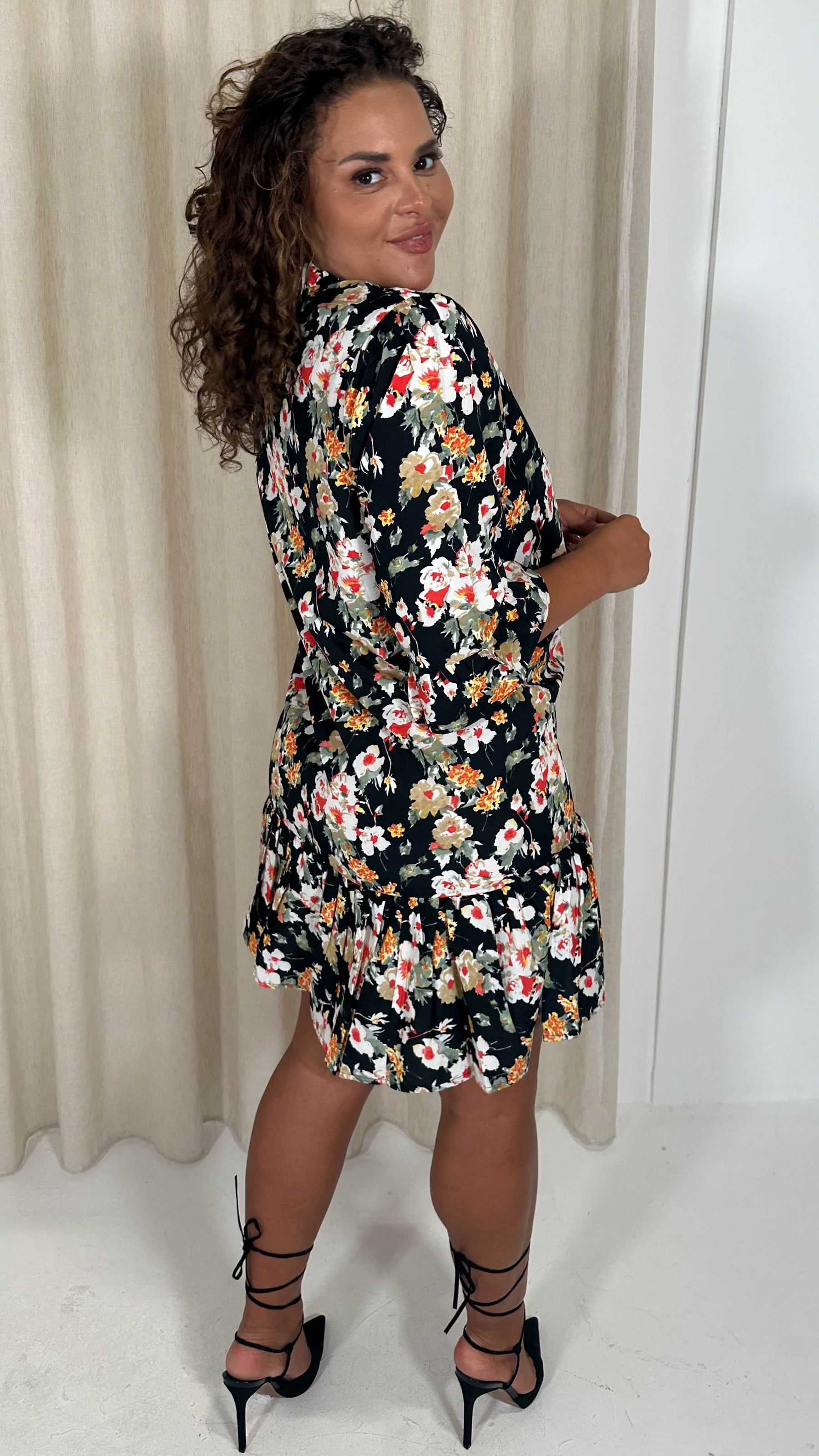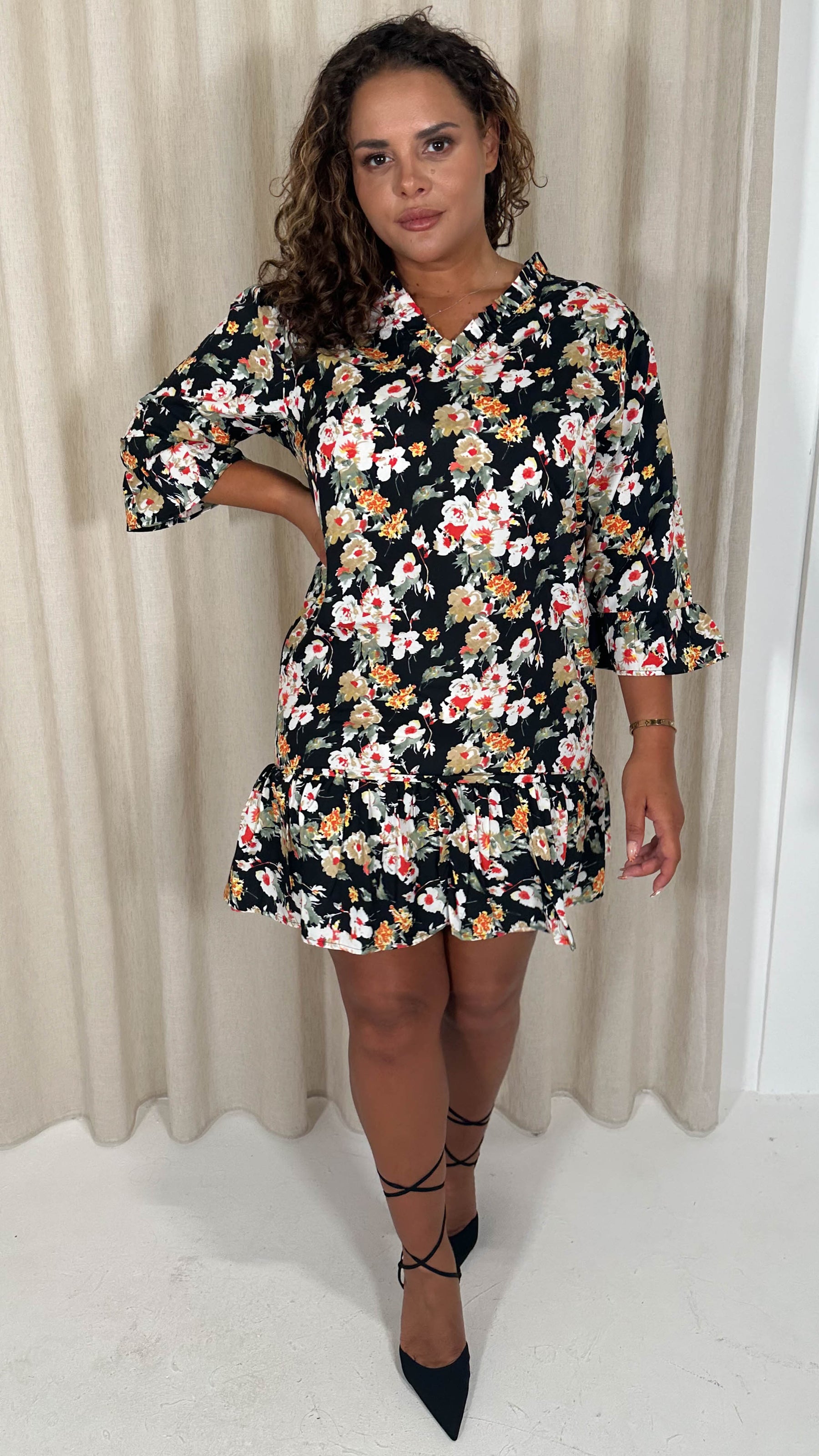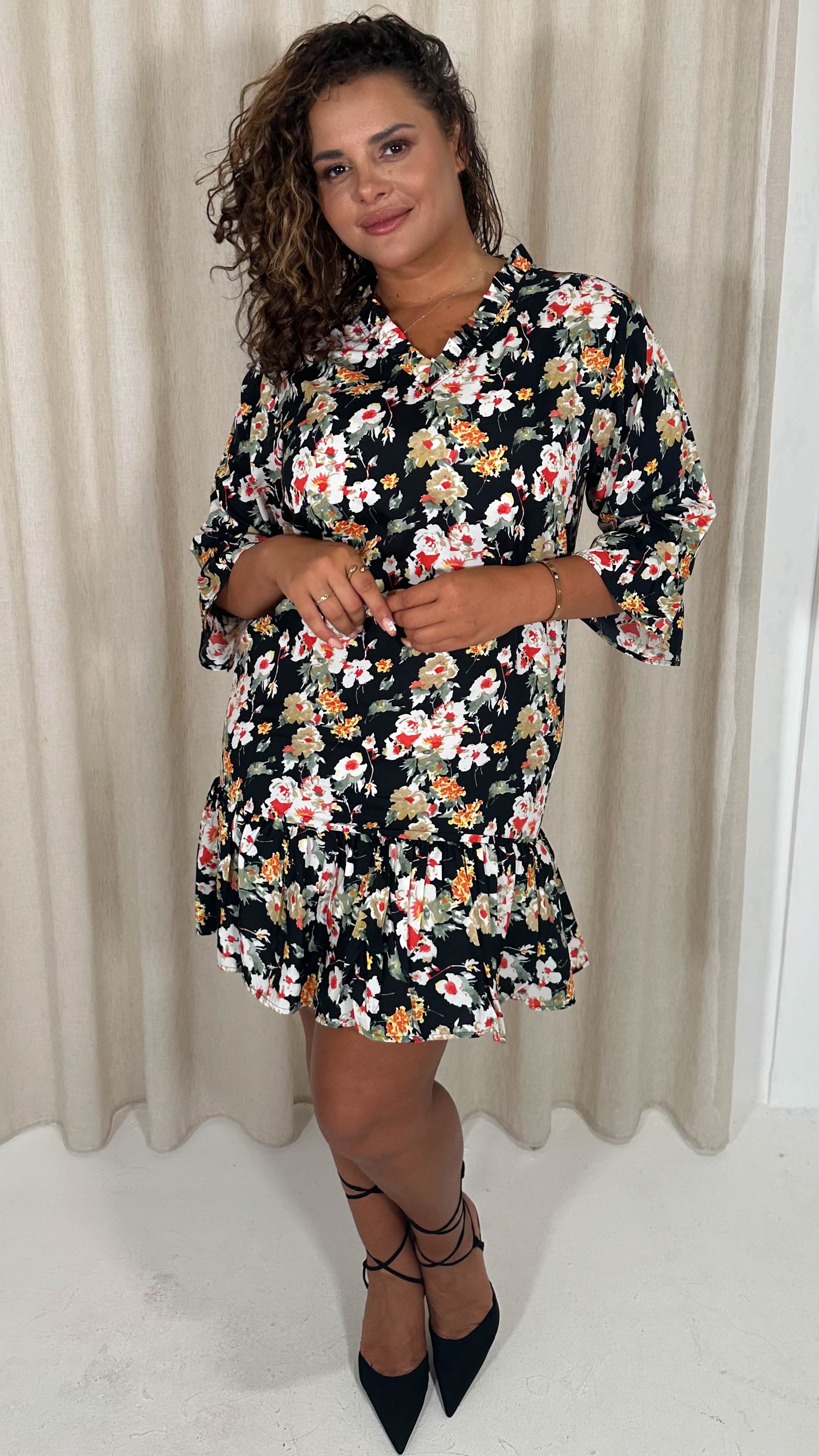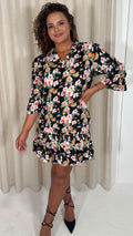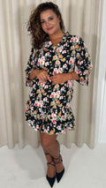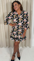 CurveWow Ruffle V Neck Smock Dress Black/Red Floral