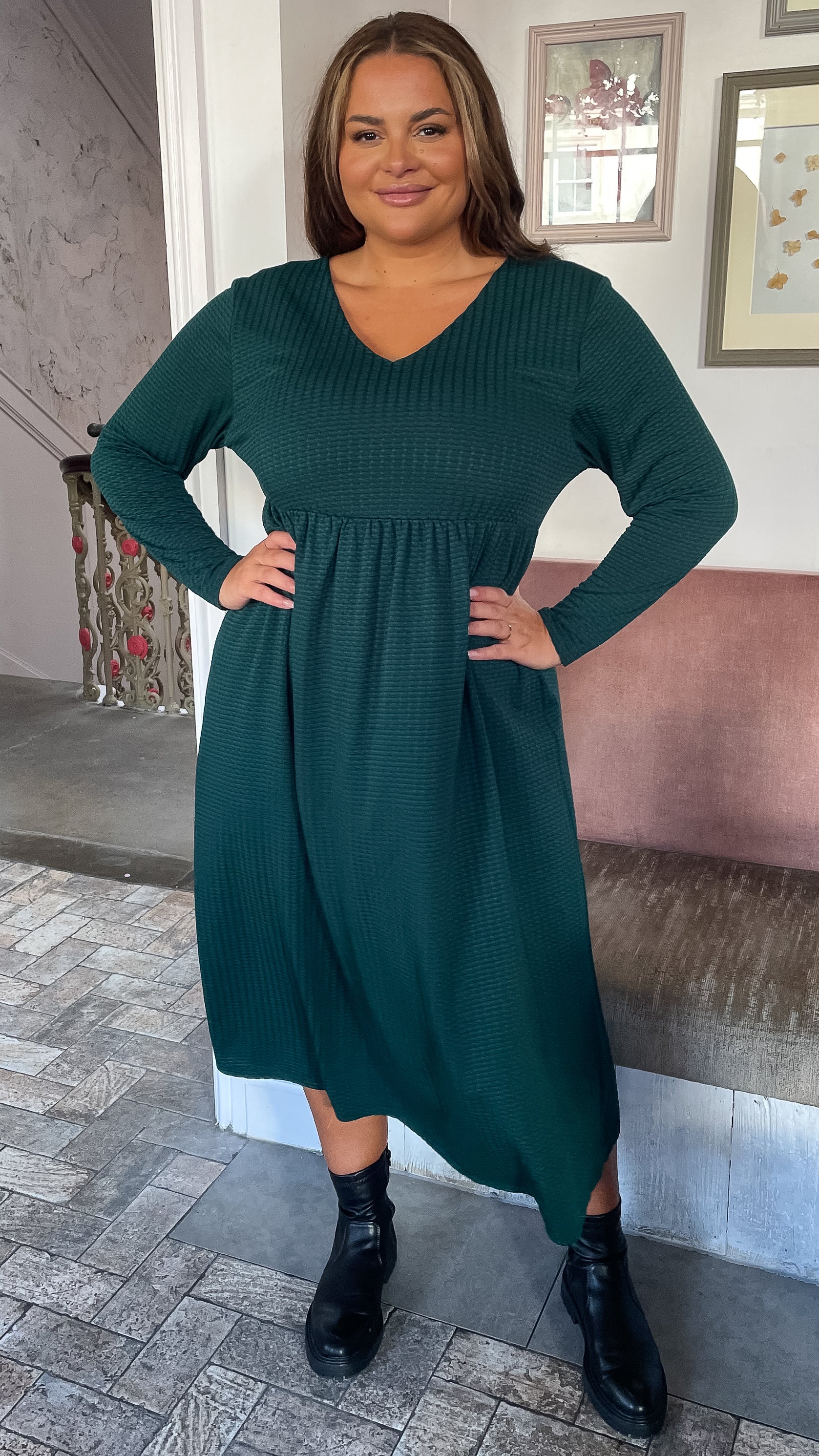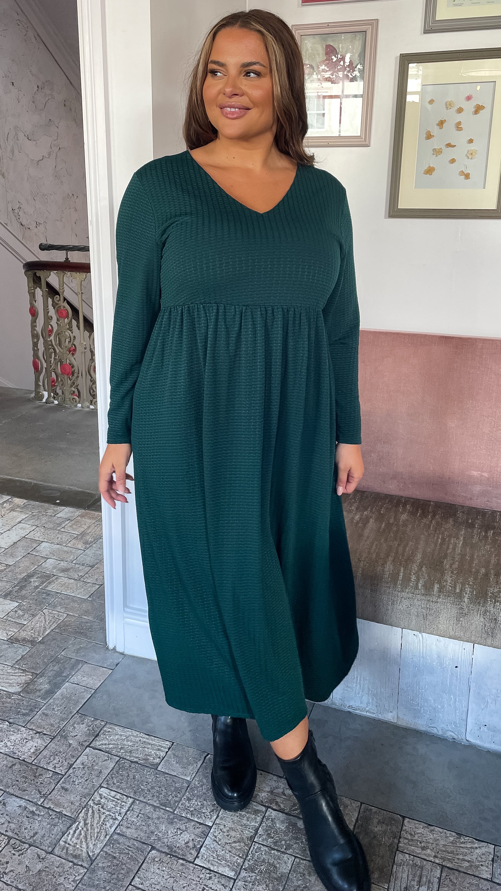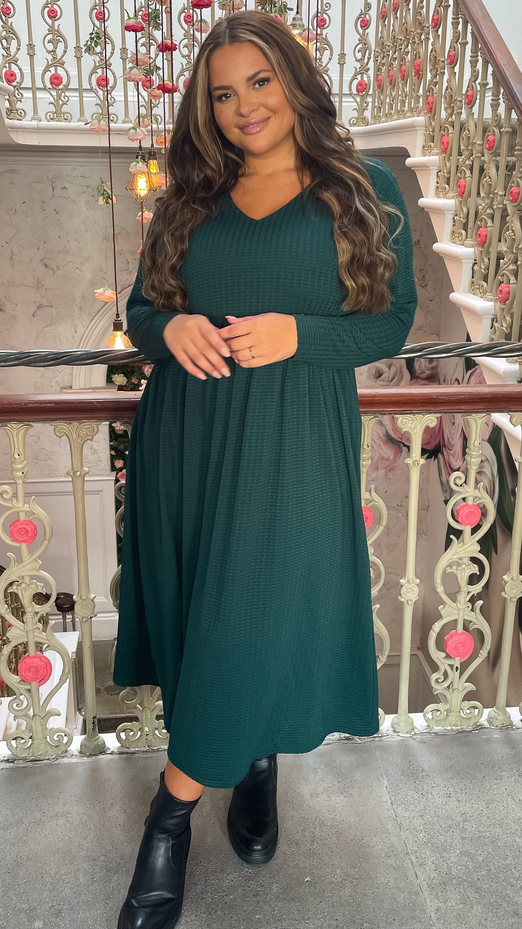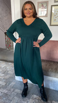 CurveWow Textured V Neck Long Sleeve Midi Dress Green