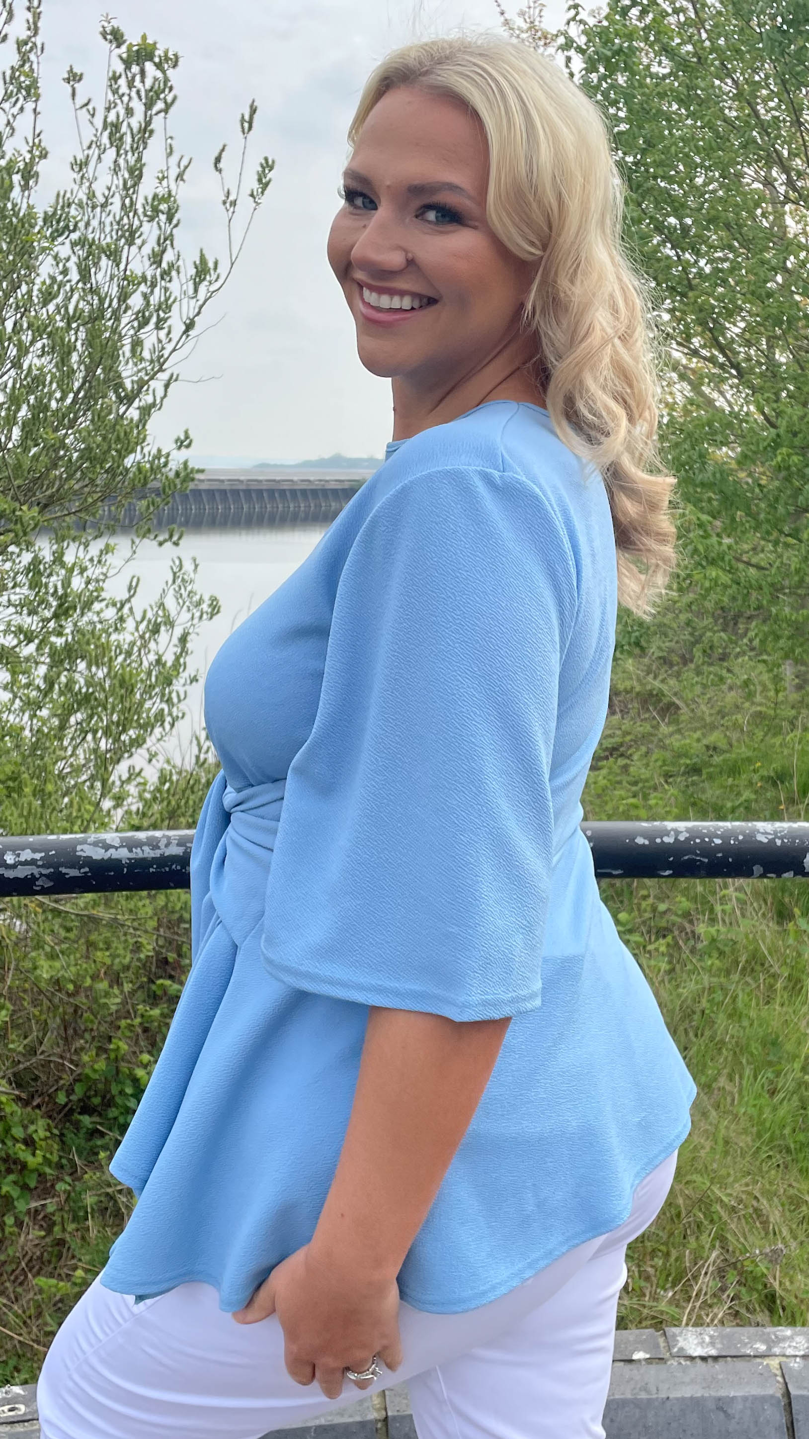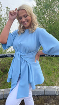 CurveWow Tie Waist Peplum Top Blue