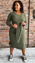 CurveWow Tie Waist Ribbed Midi Dress Khaki
