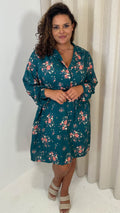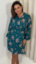 CurveWow Tie Waist Shirt Mini Dress Teal Floral