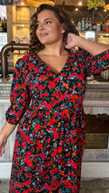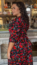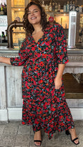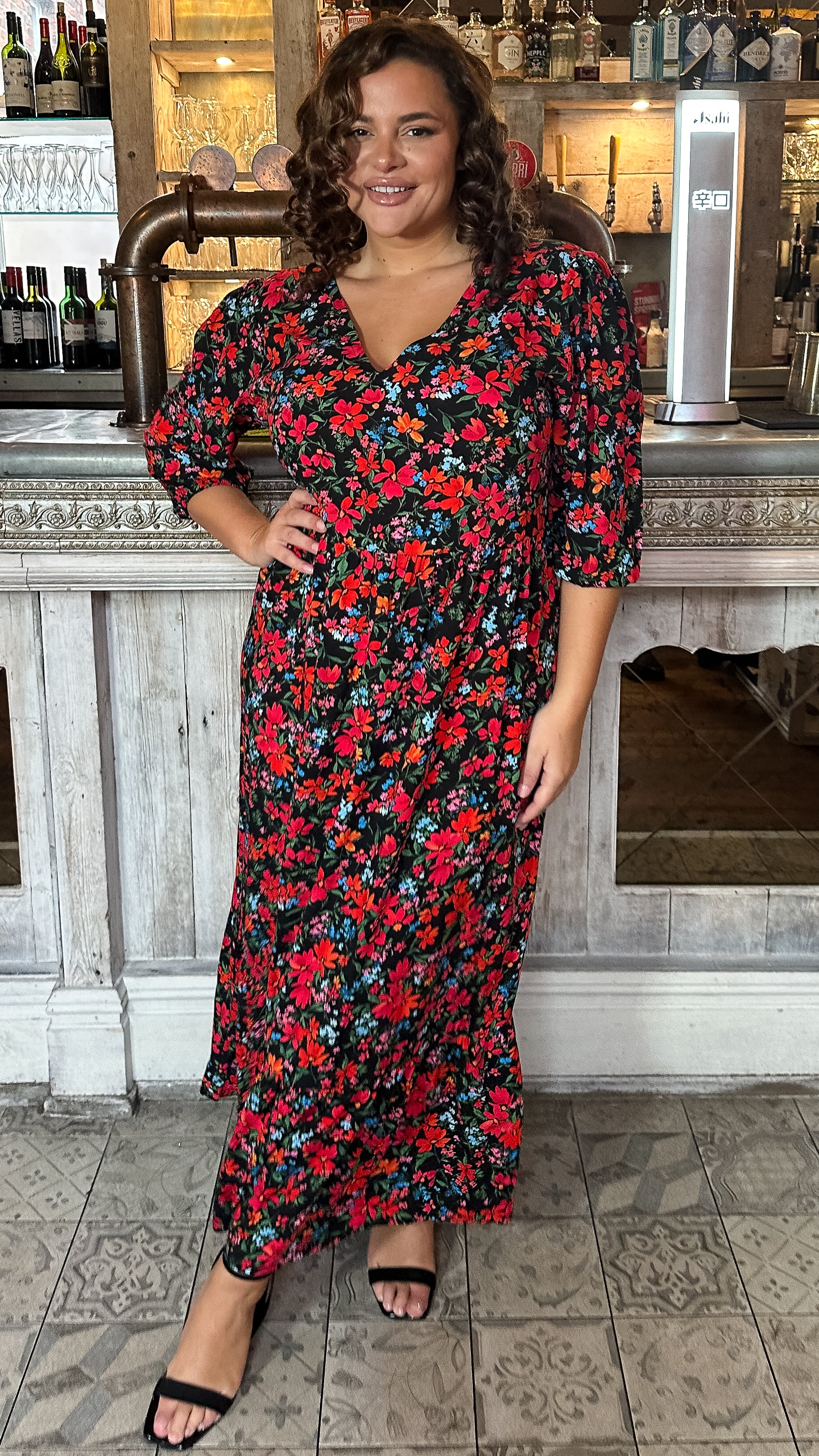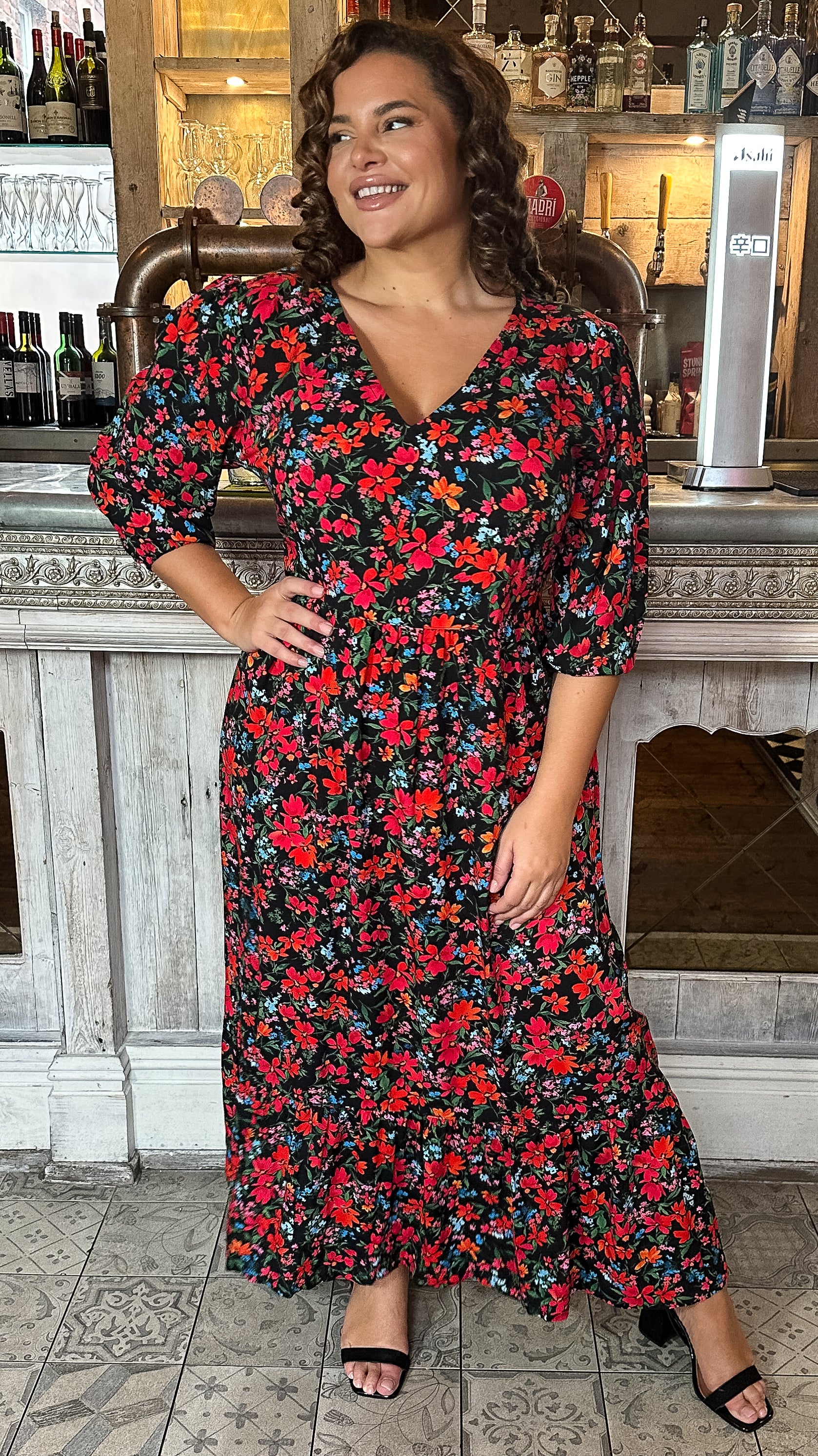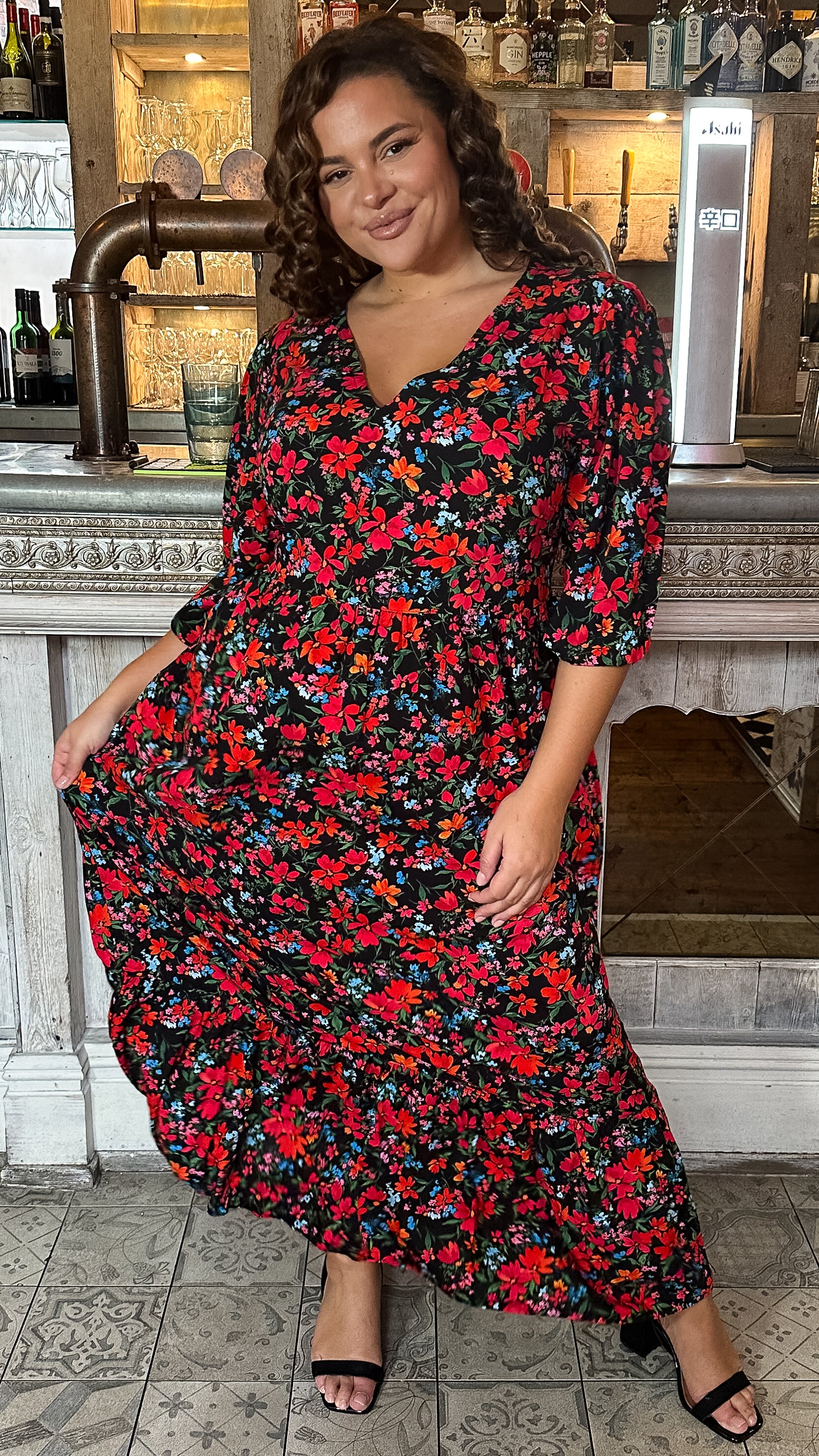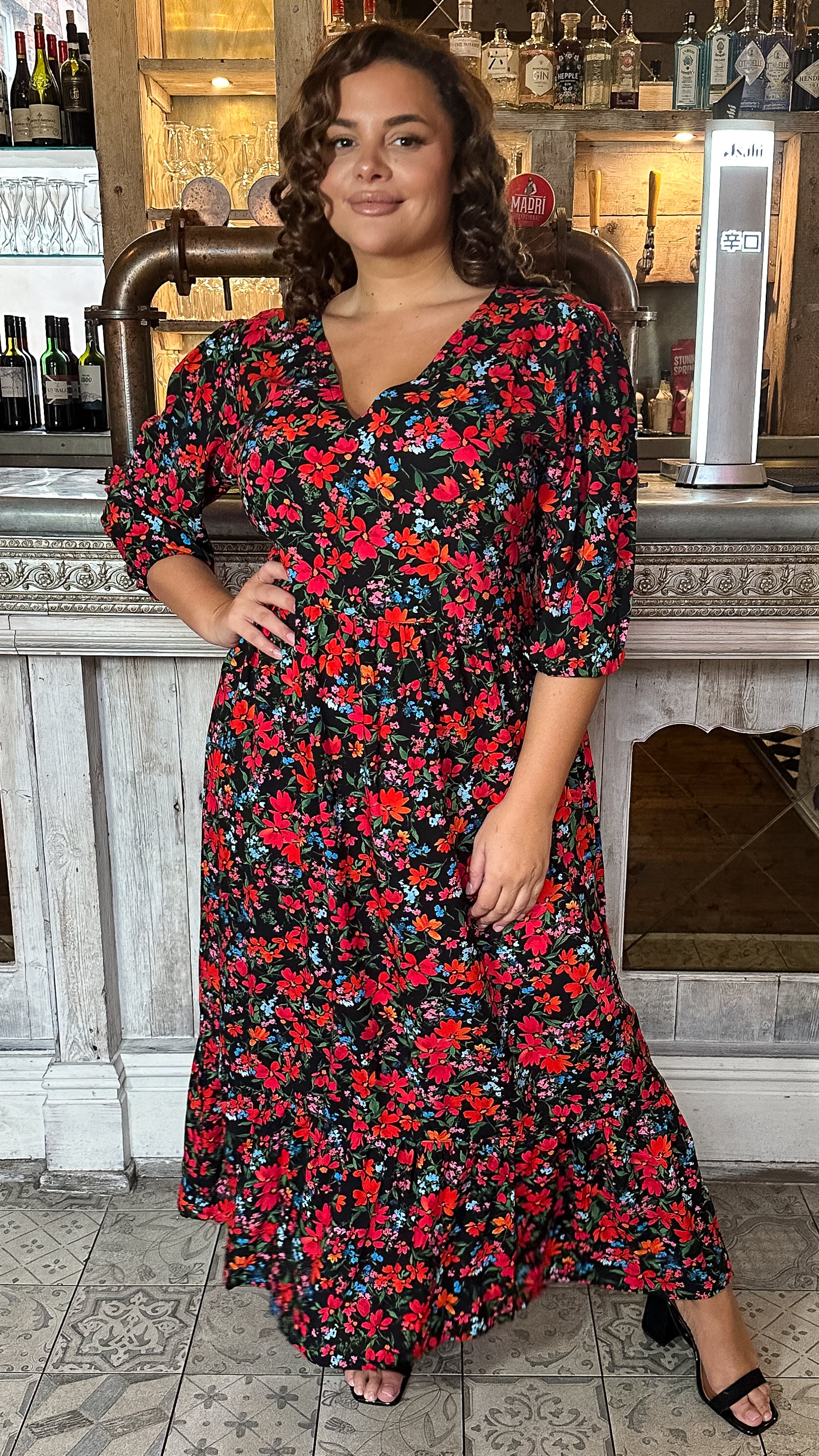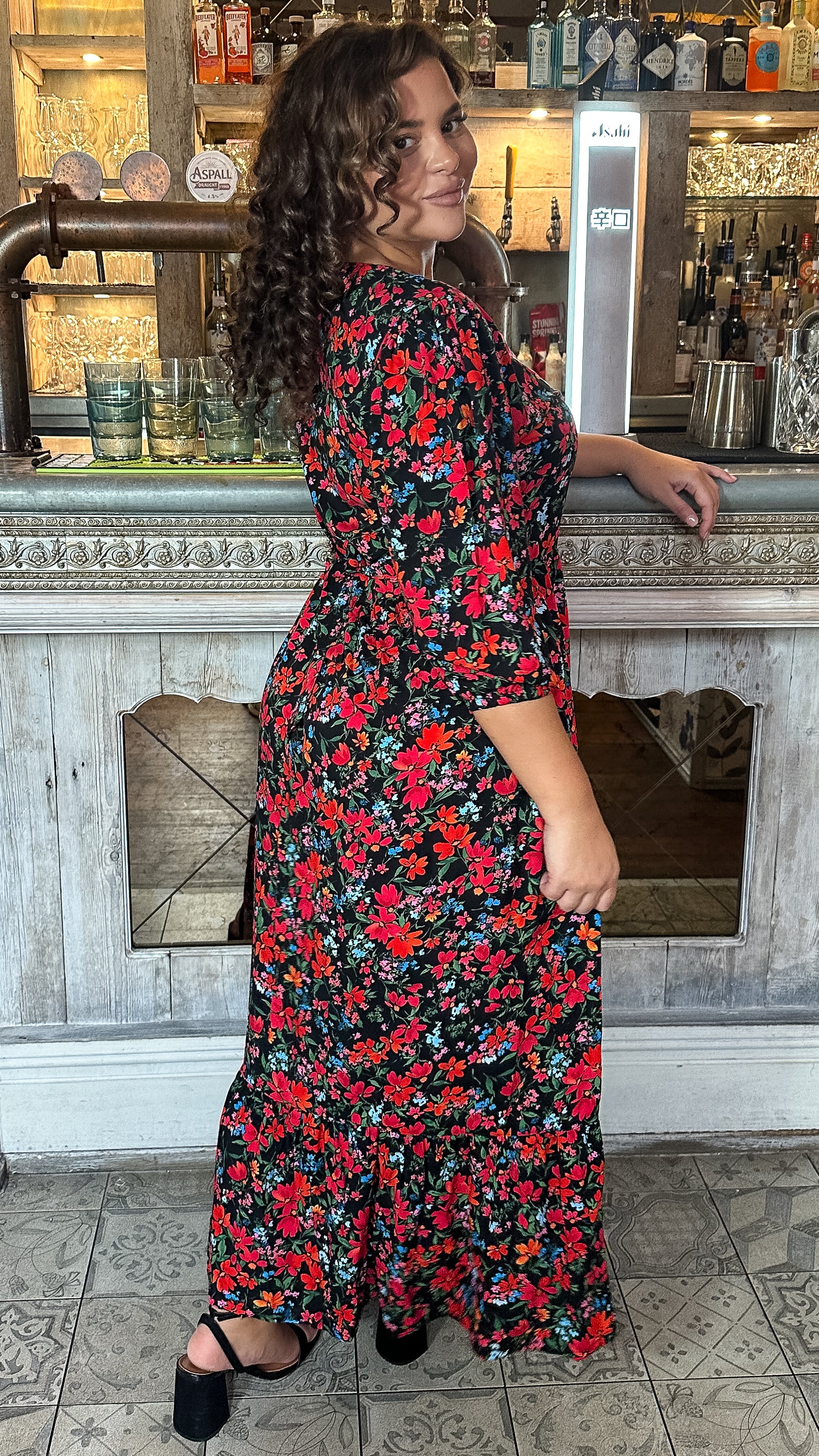 CurveWow Tiered Vneck Balloon Sleeve Maxi Dress Black Multi
