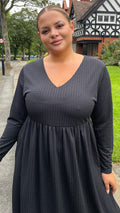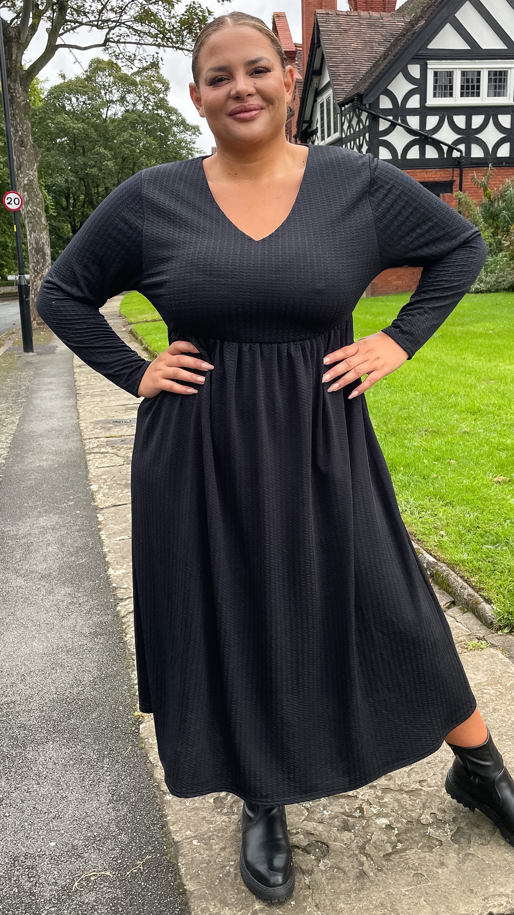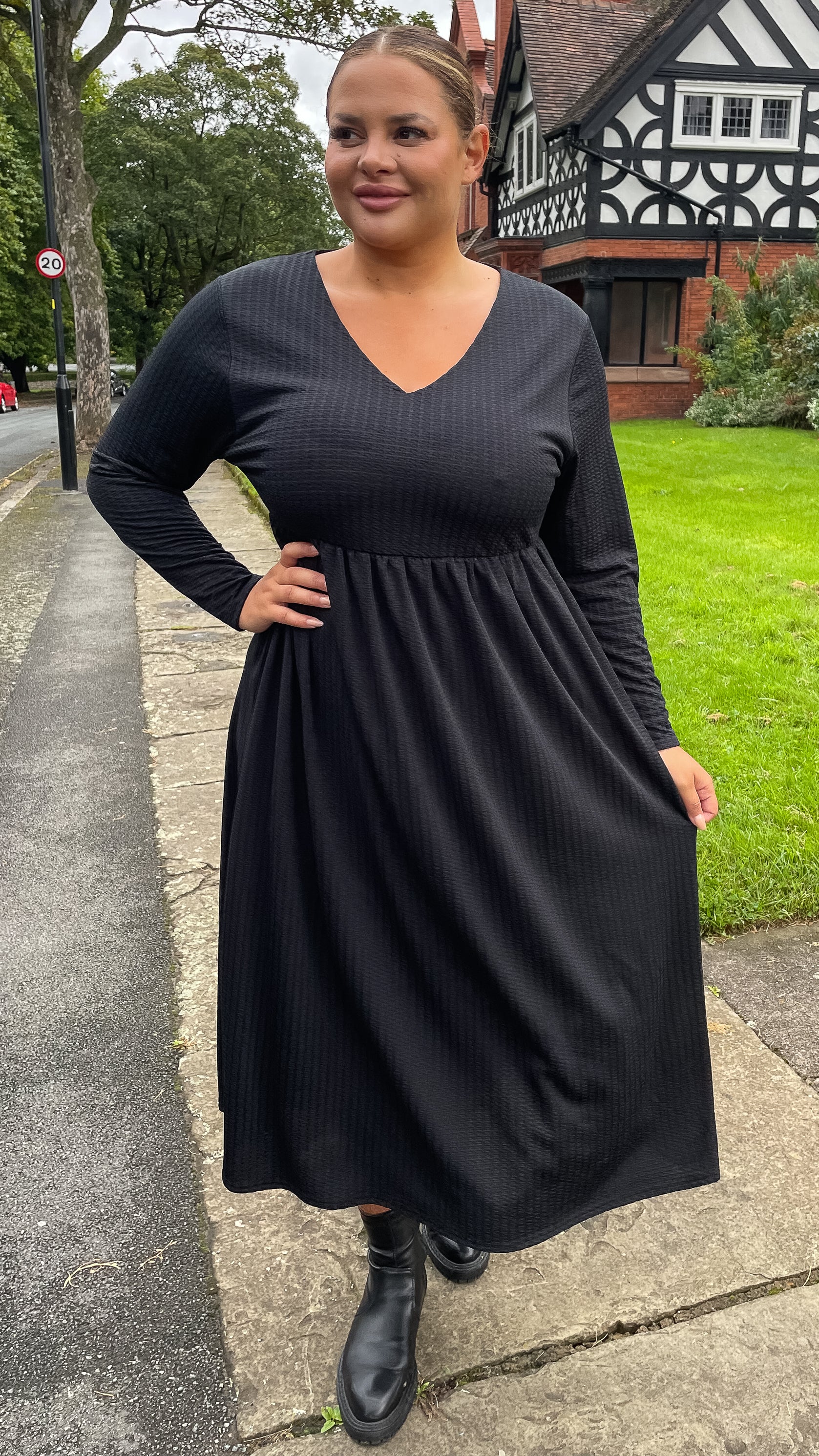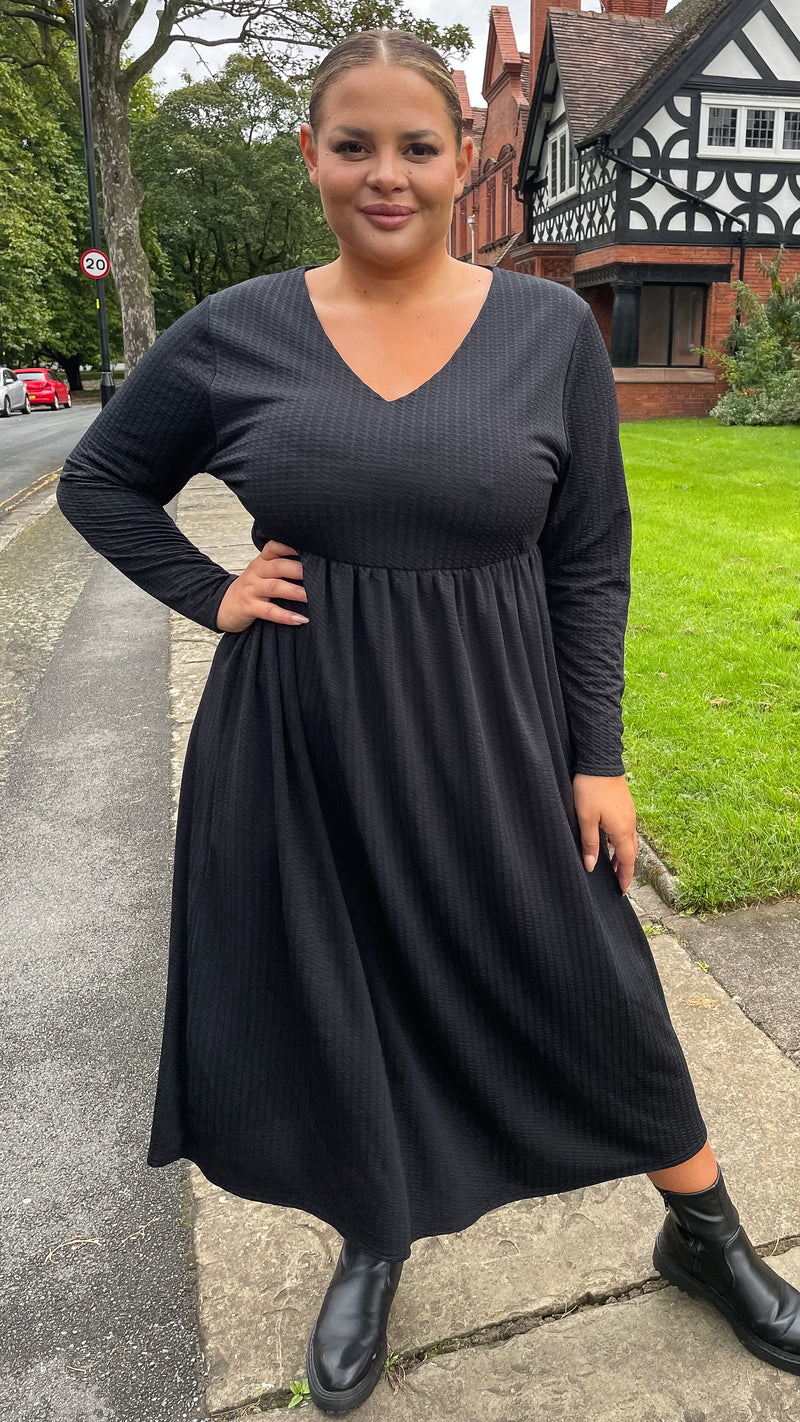 CurveWow Textured V Neck Long Sleeve Midi Dress Black