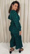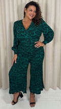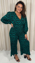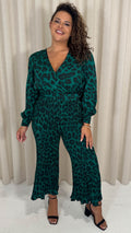 CurveWow V Neck Pleated Jumpsuit Green Animal