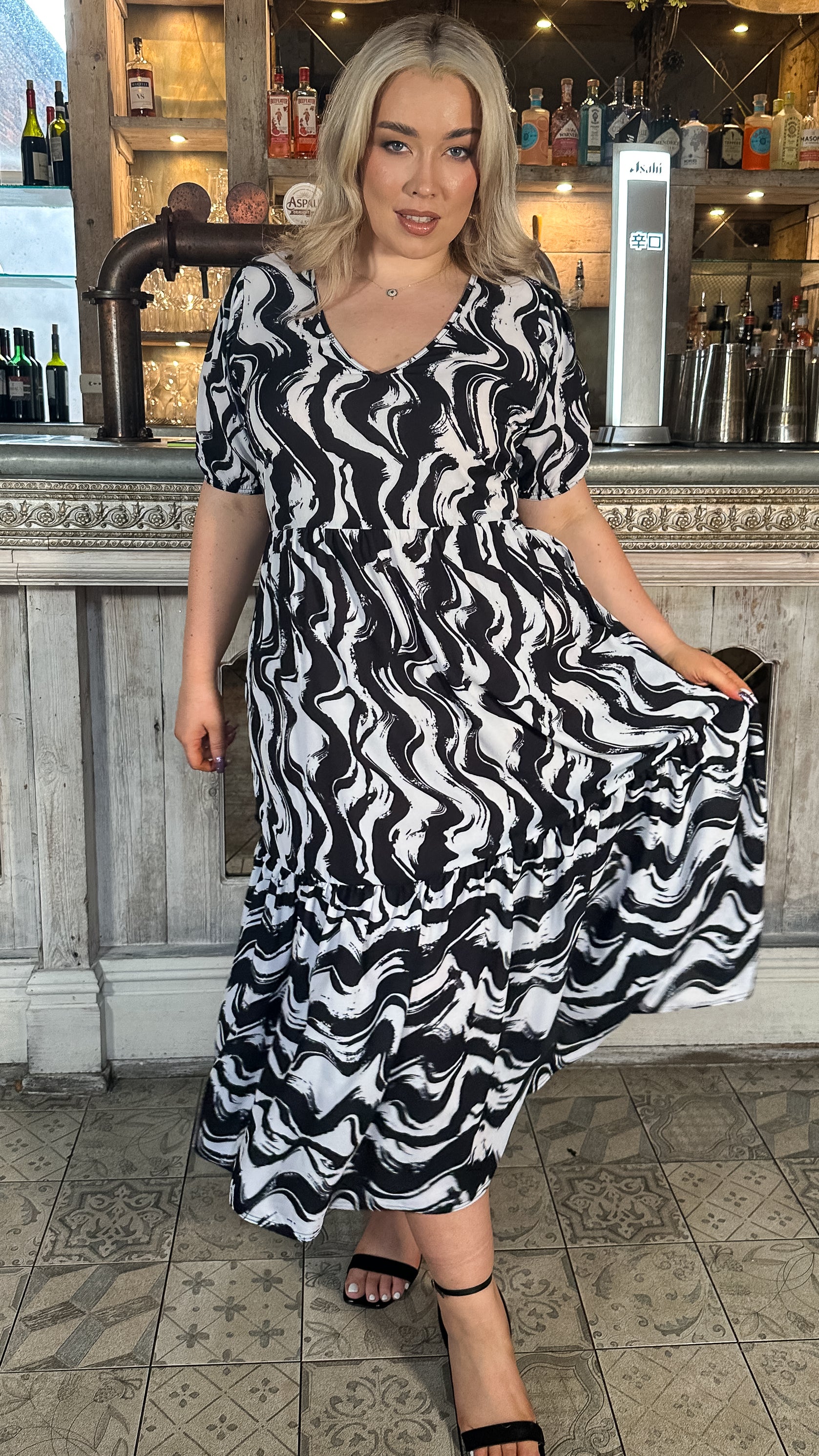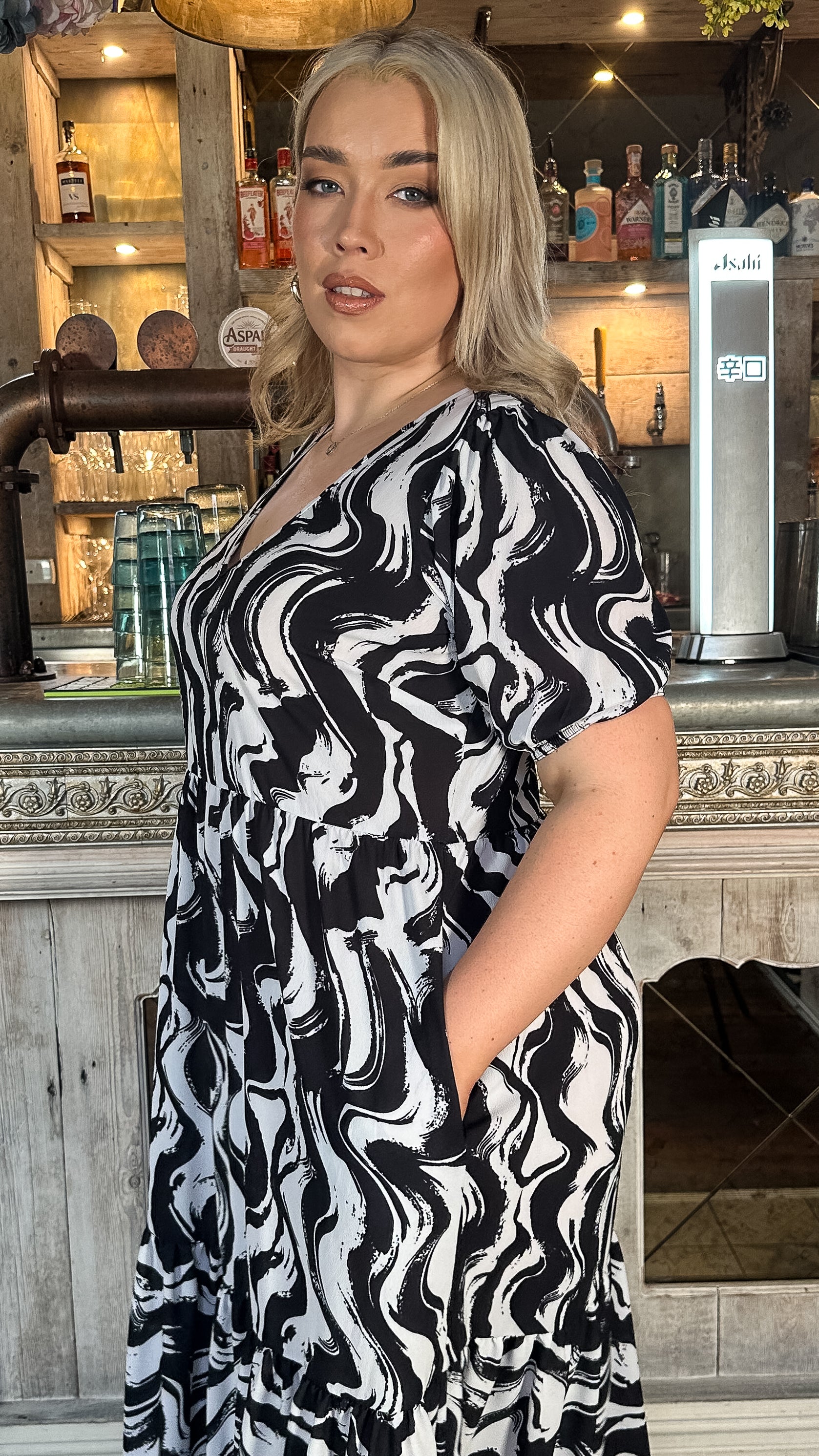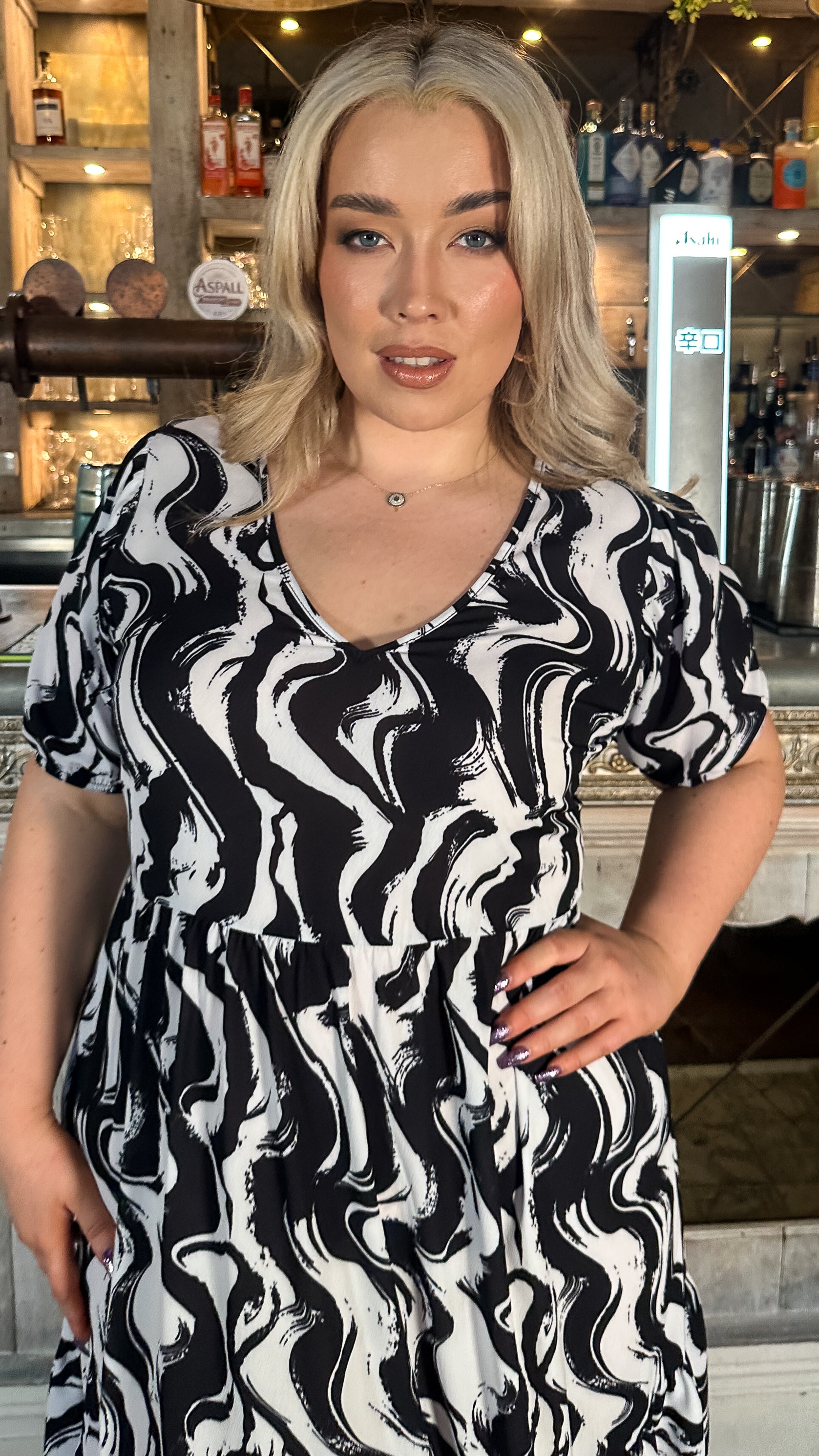 CurveWow VNeck Puff Sleeve Pocket Midi Dress Mono