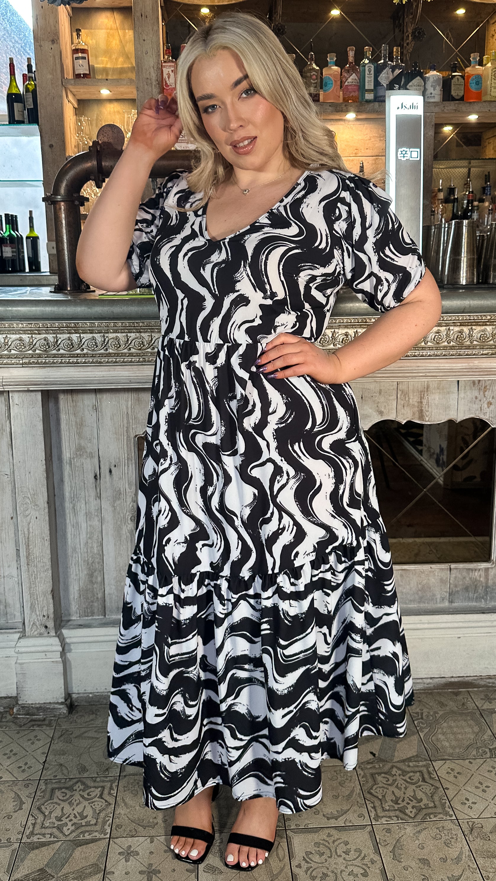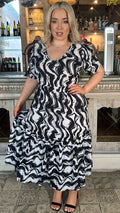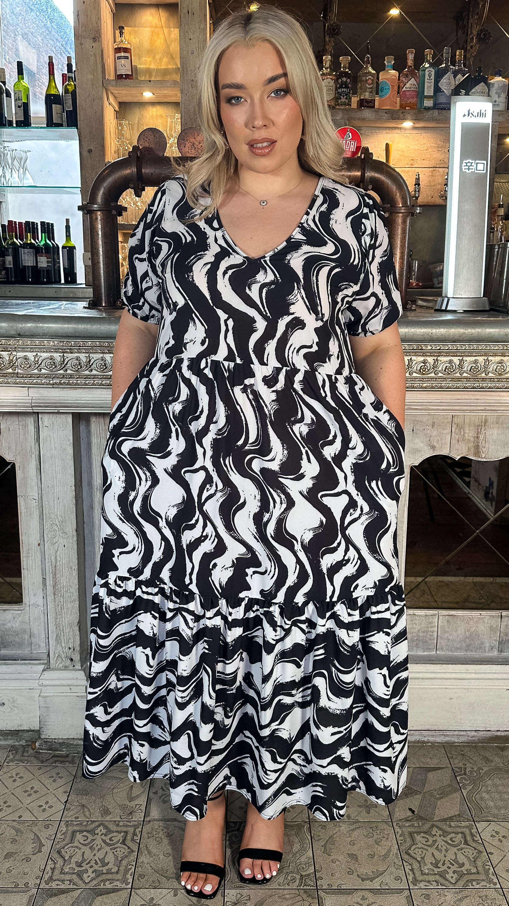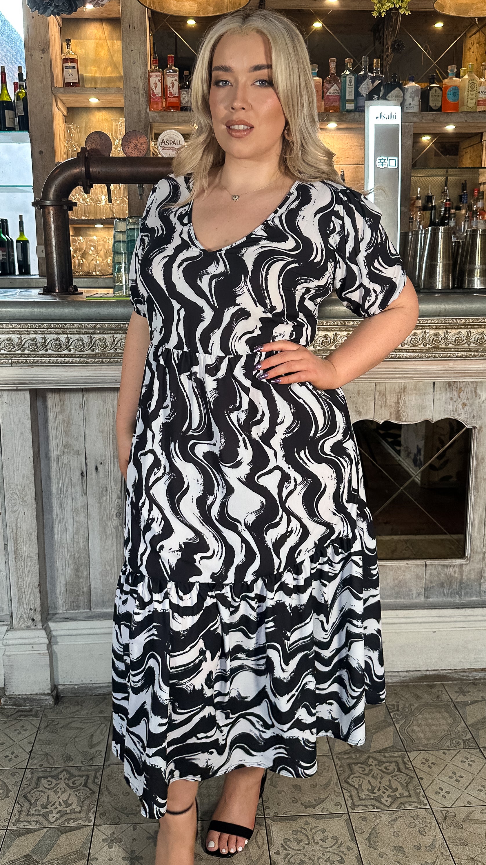 CurveWow VNeck Puff Sleeve Pocket Midi Dress Mono