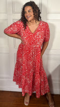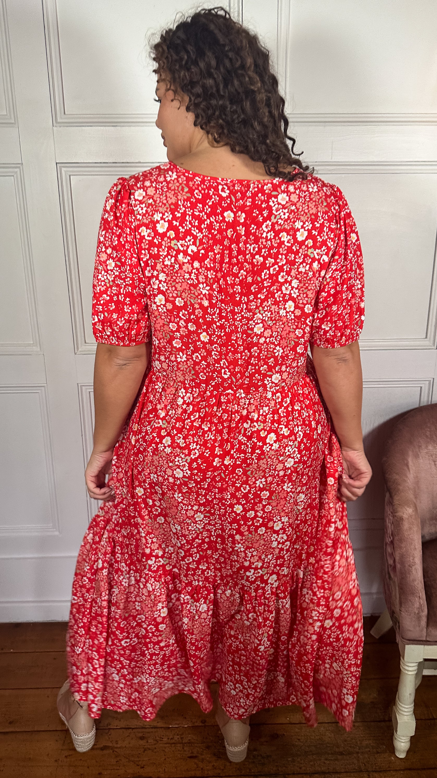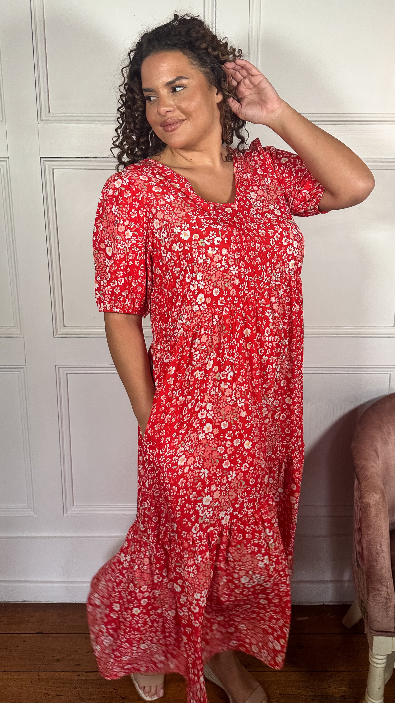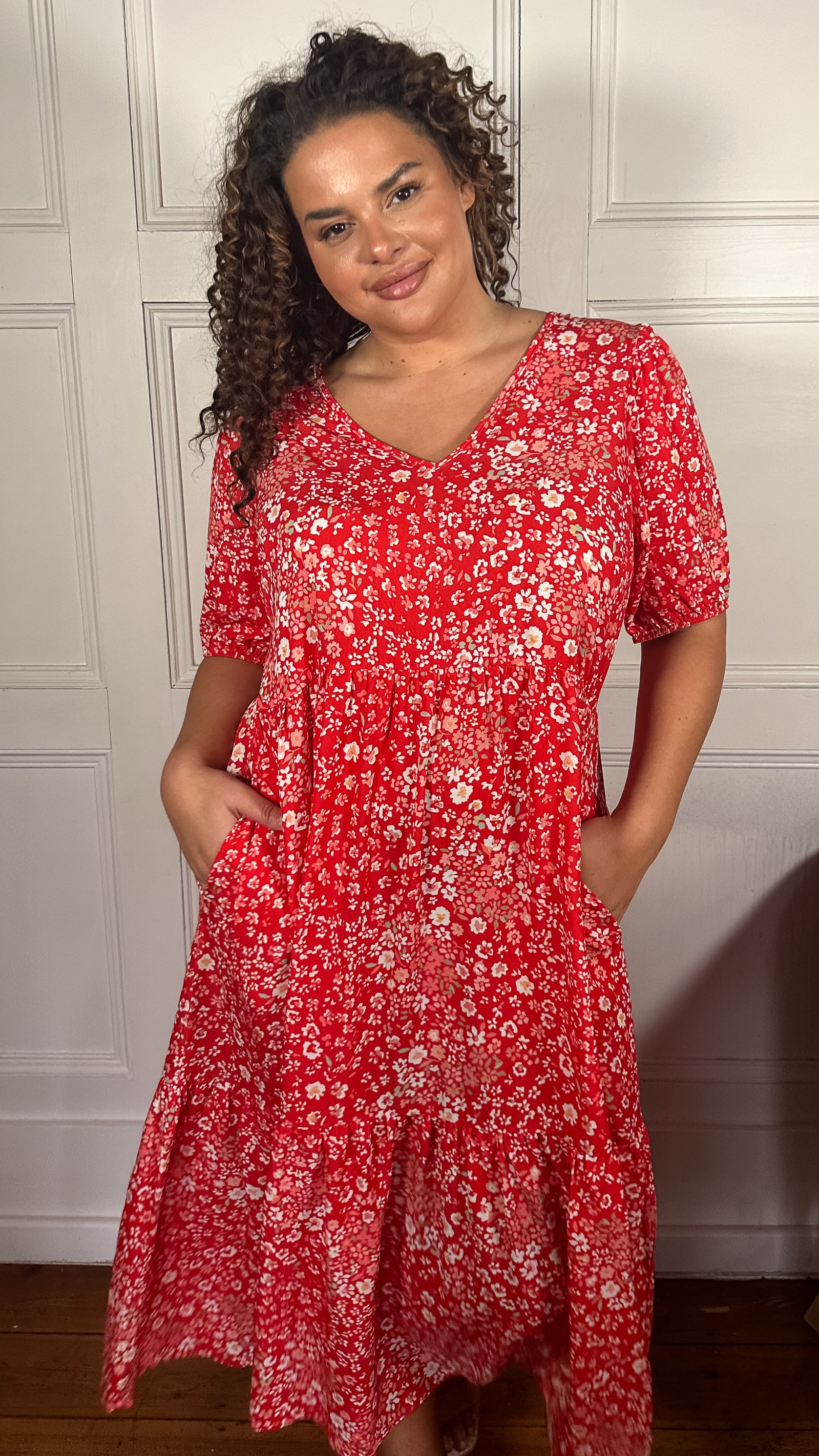 CurveWow VNeck Puff Sleeve Pocket Midi Dress Red Floral