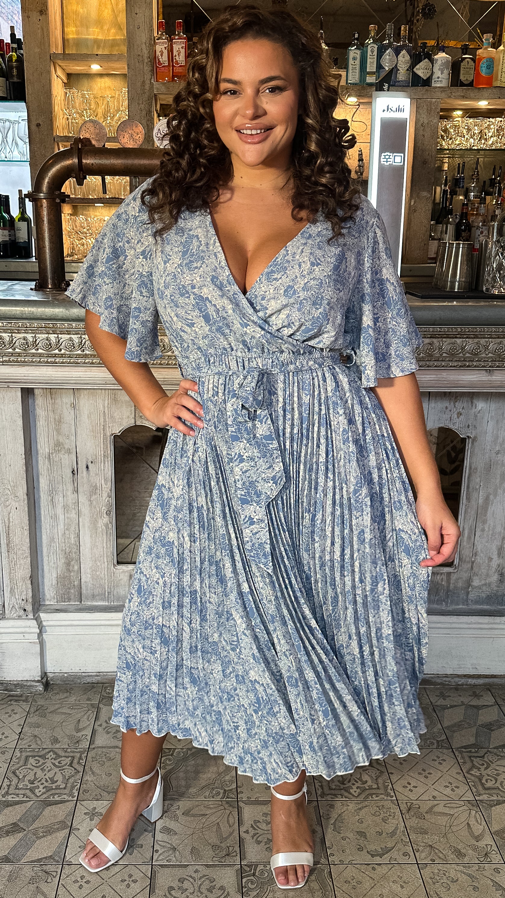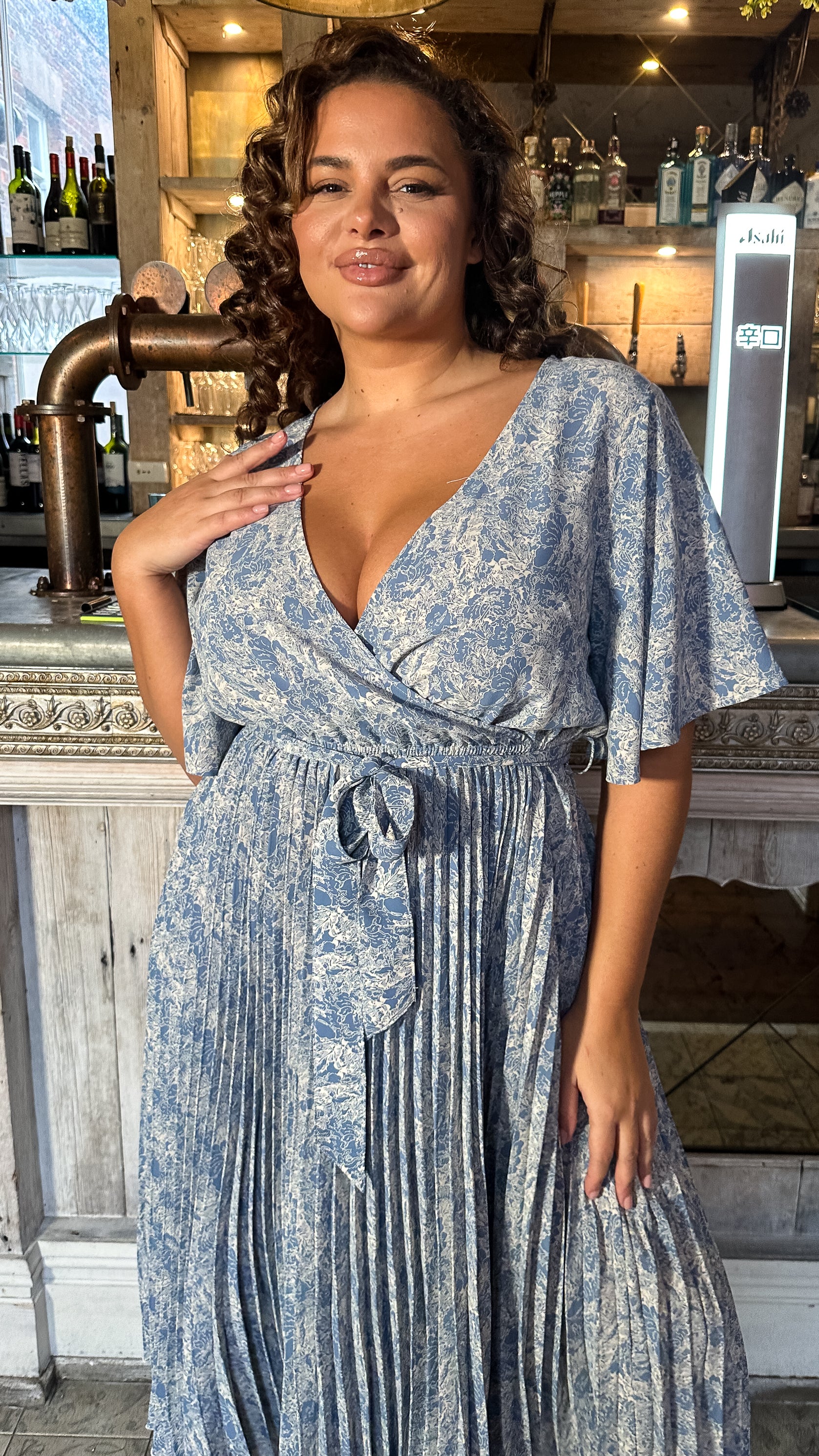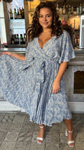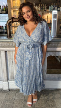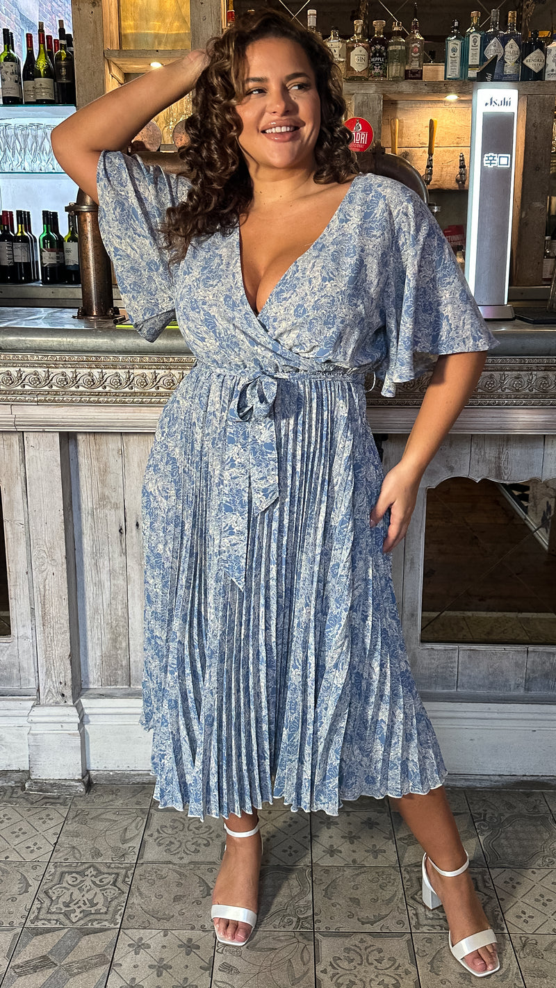 CurveWow Wrap Angel Sleeve Pleated Midi Dress Blue