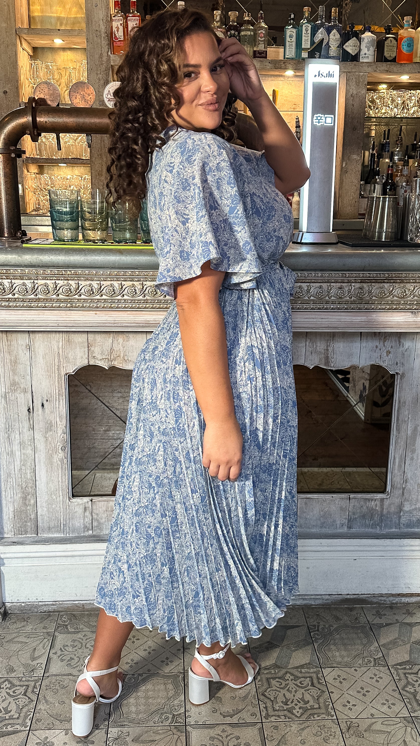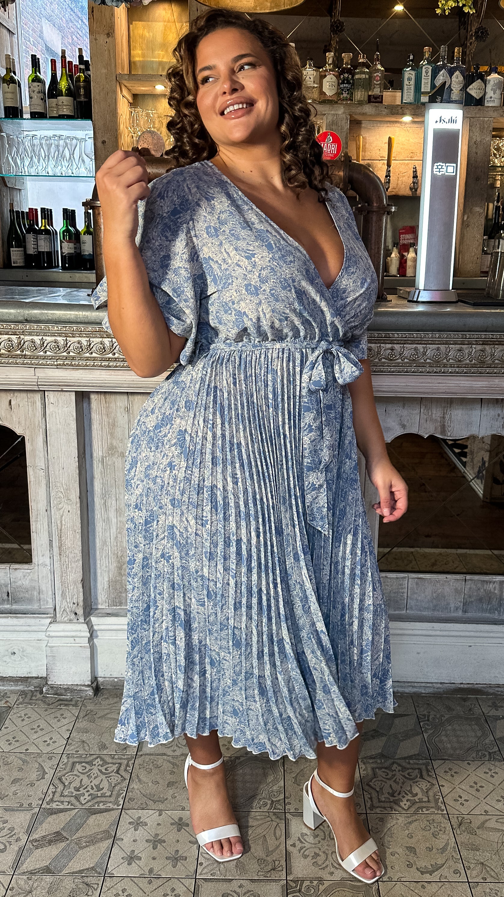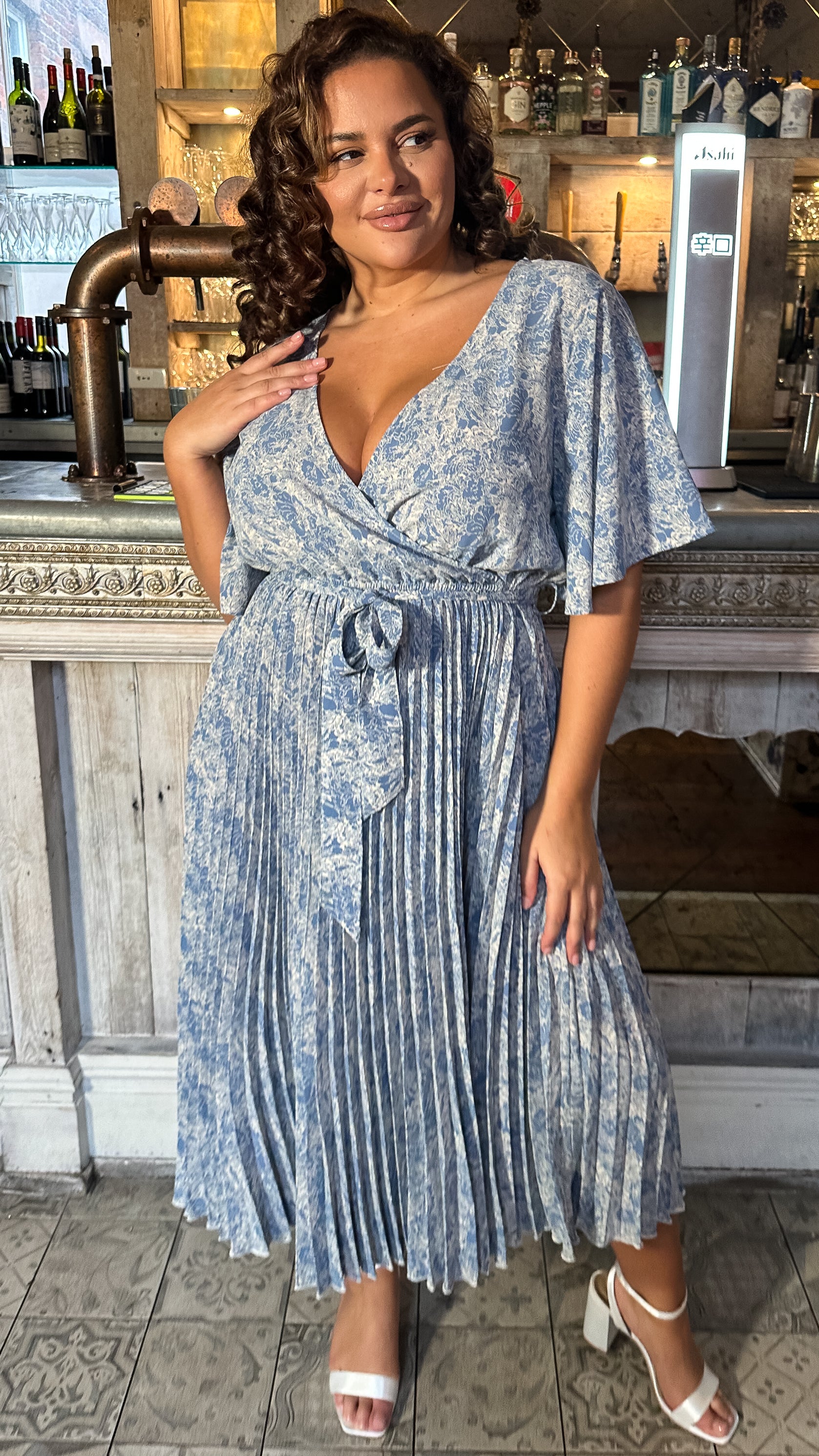 CurveWow Wrap Angel Sleeve Pleated Midi Dress Blue