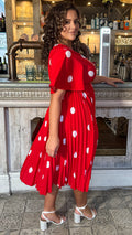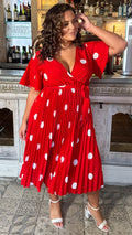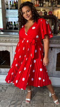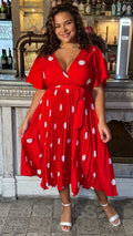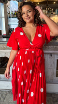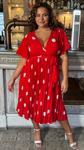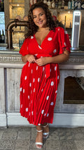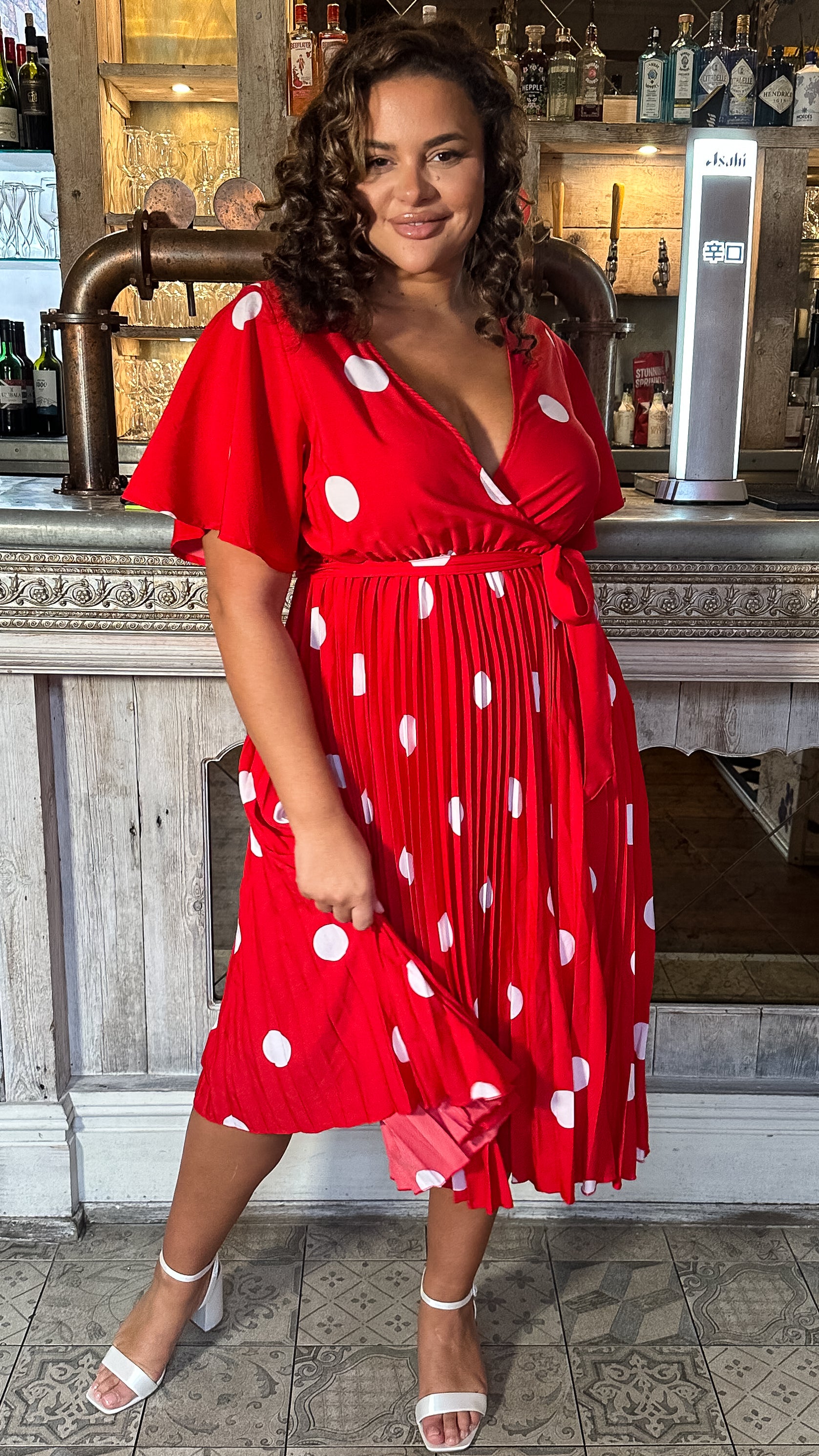 CurveWow Wrap Angel Sleeve Pleated Midi Dress Red Polka Dots