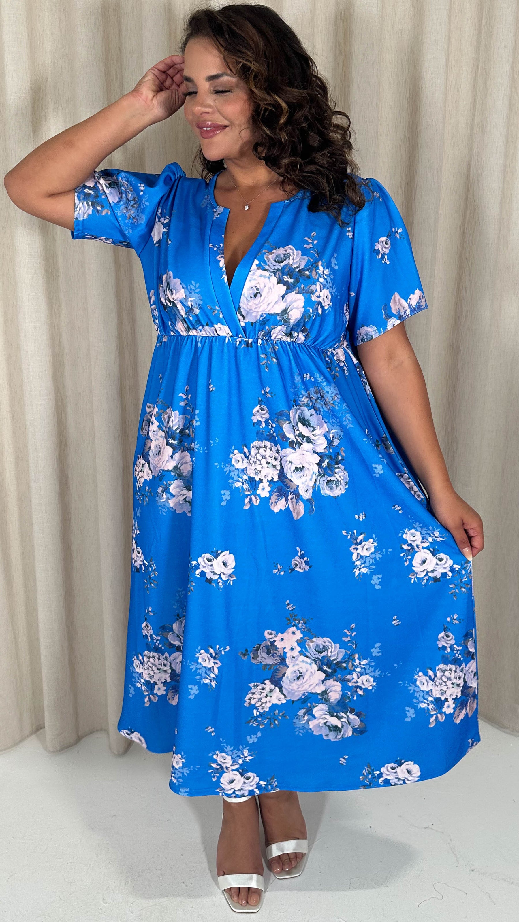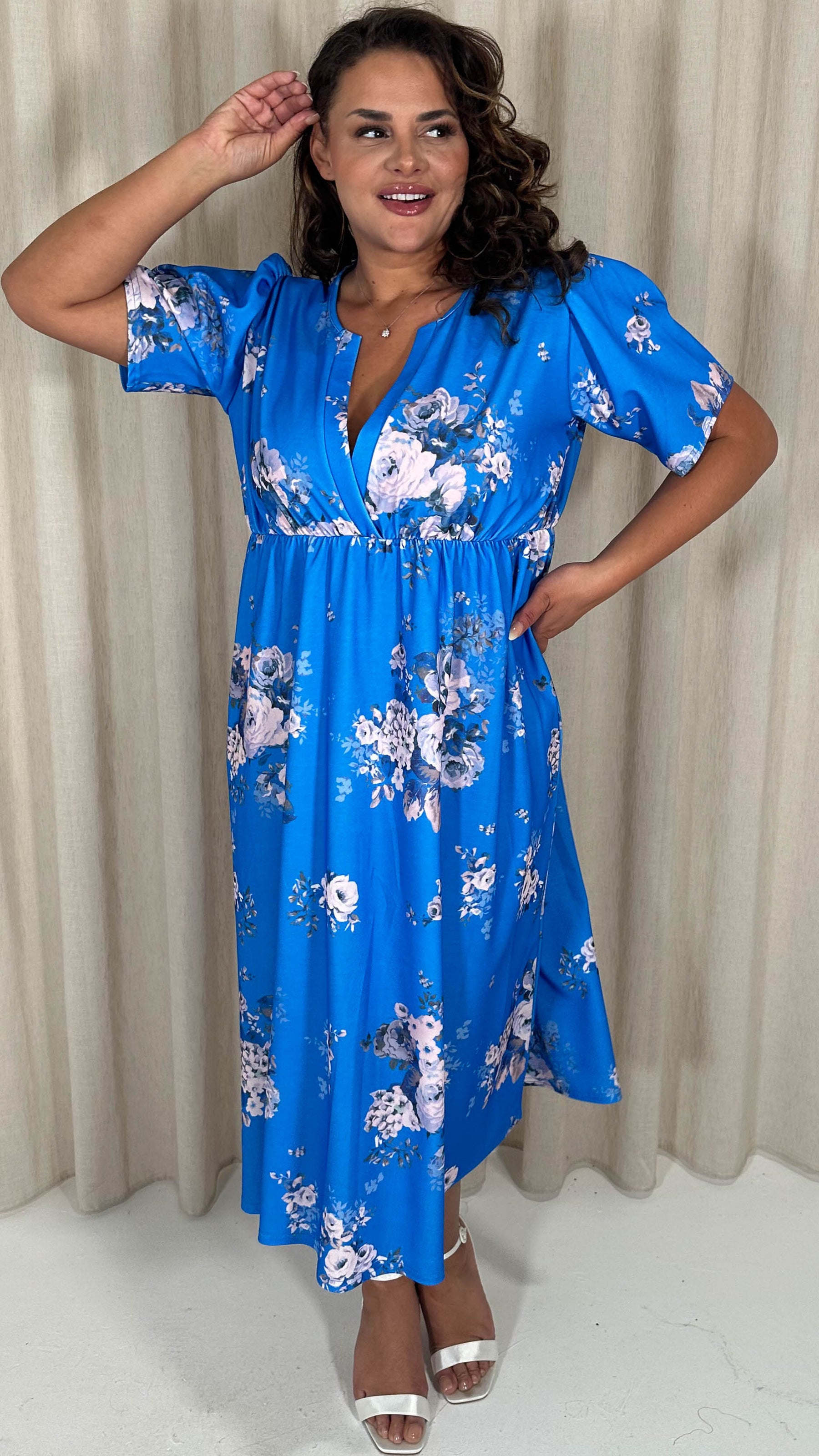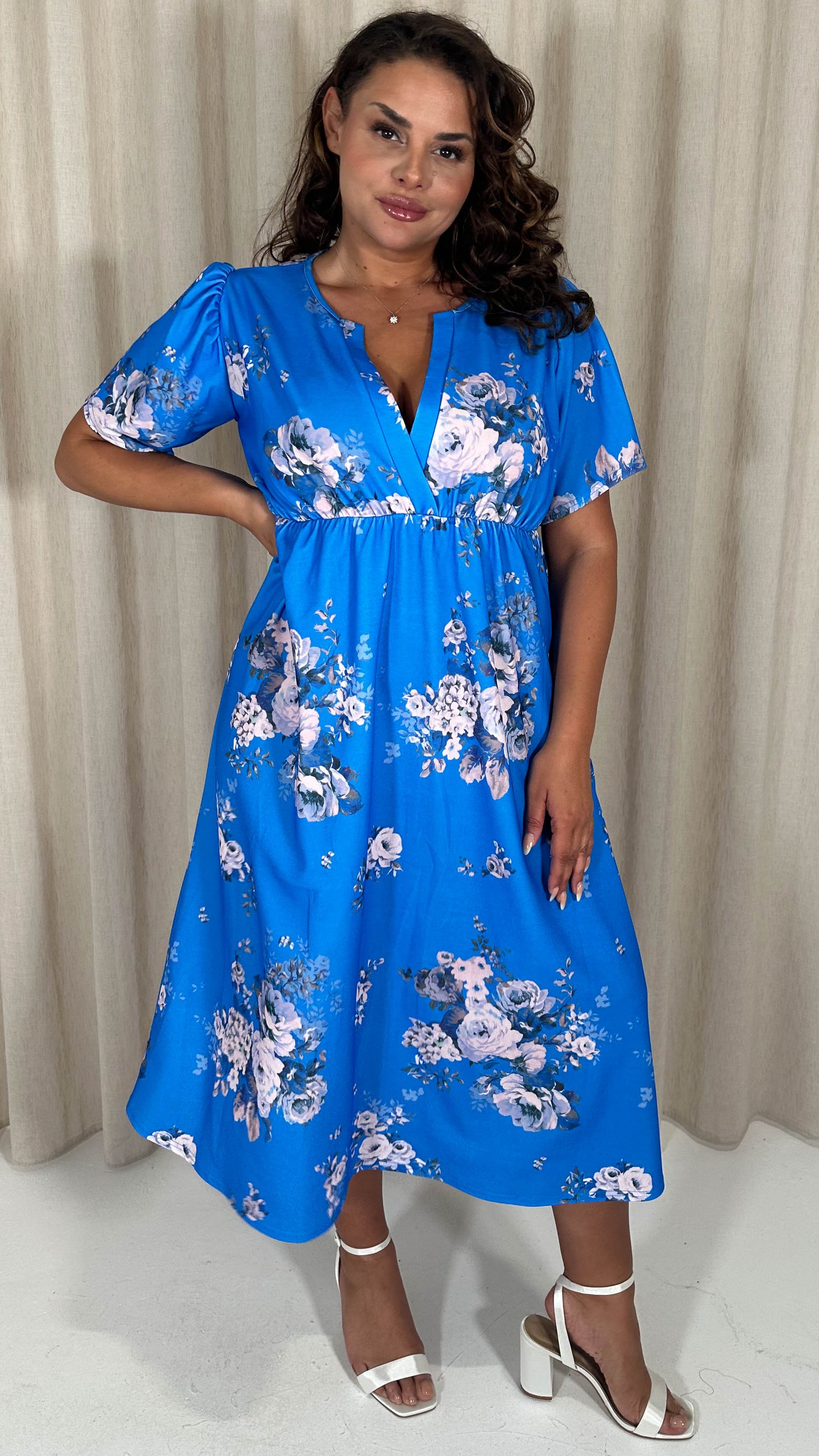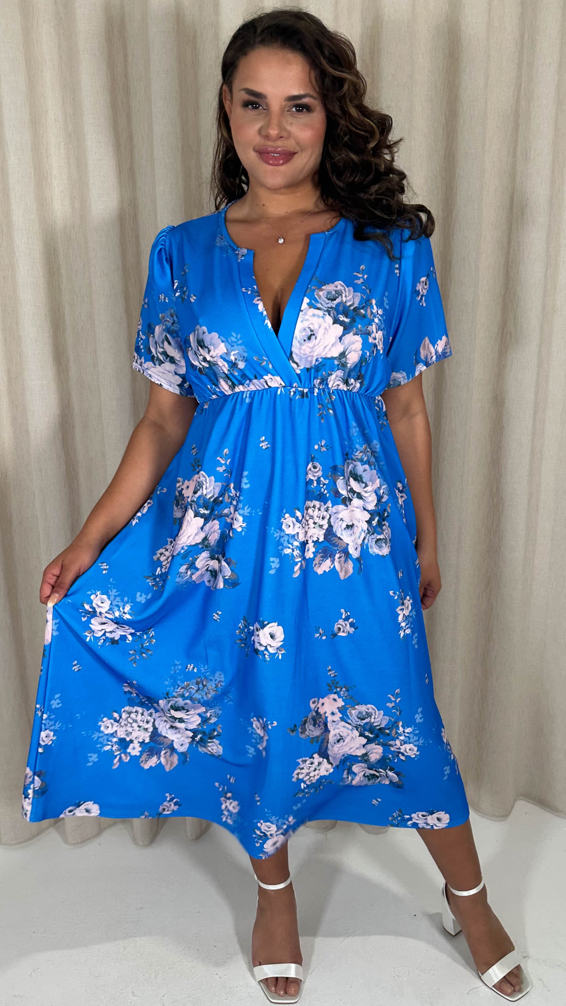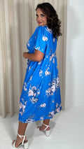 CurveWow Wrap Notch Neck Midi Dress Blue Floral