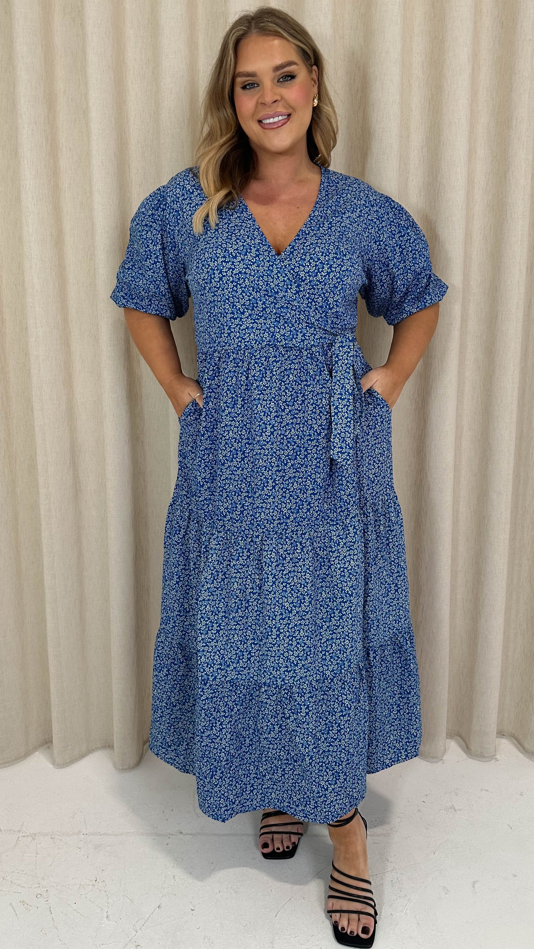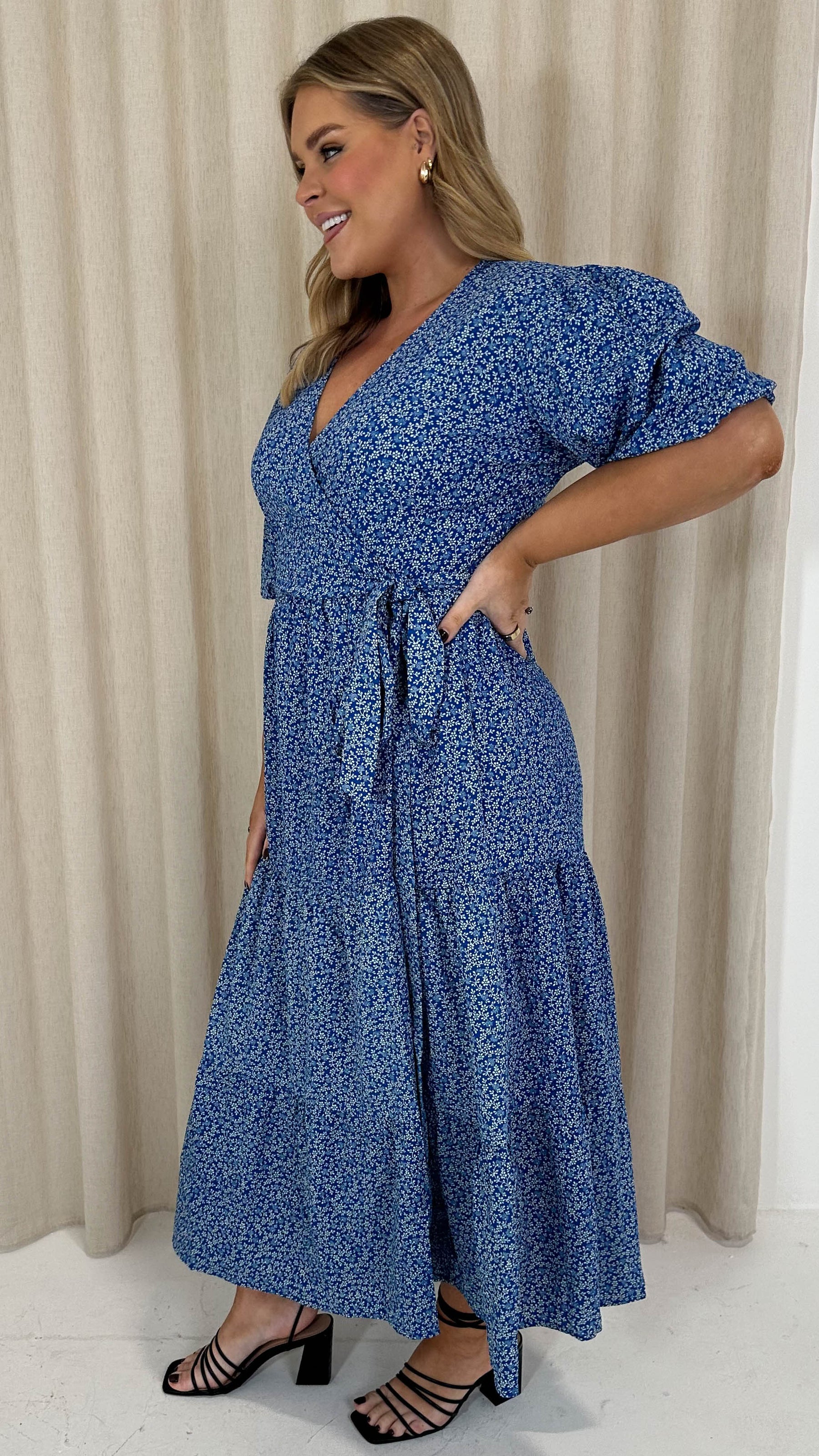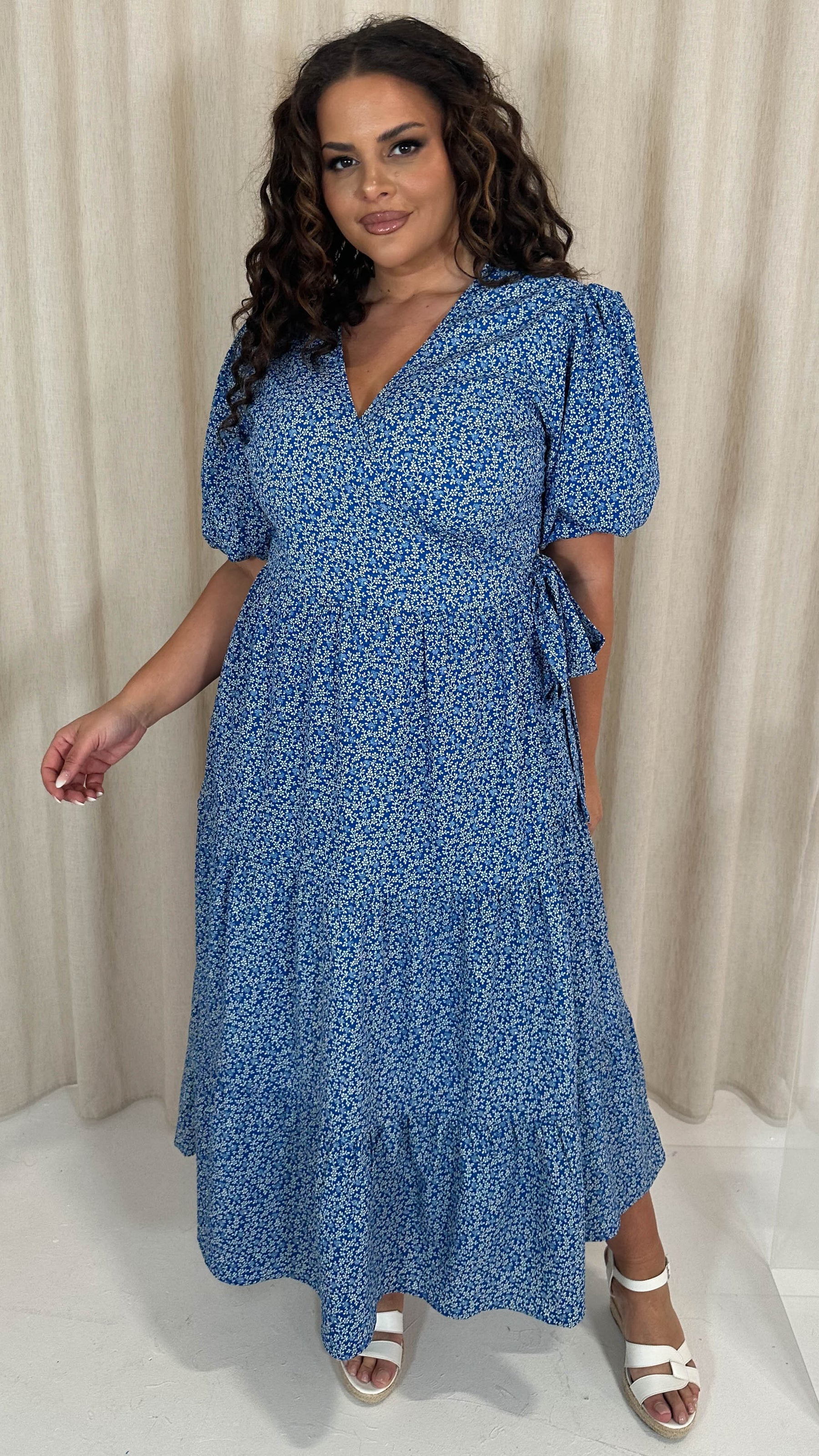 CurveWow Wrap Puff Sleeve Tiered Wrap Dress Blue Floral