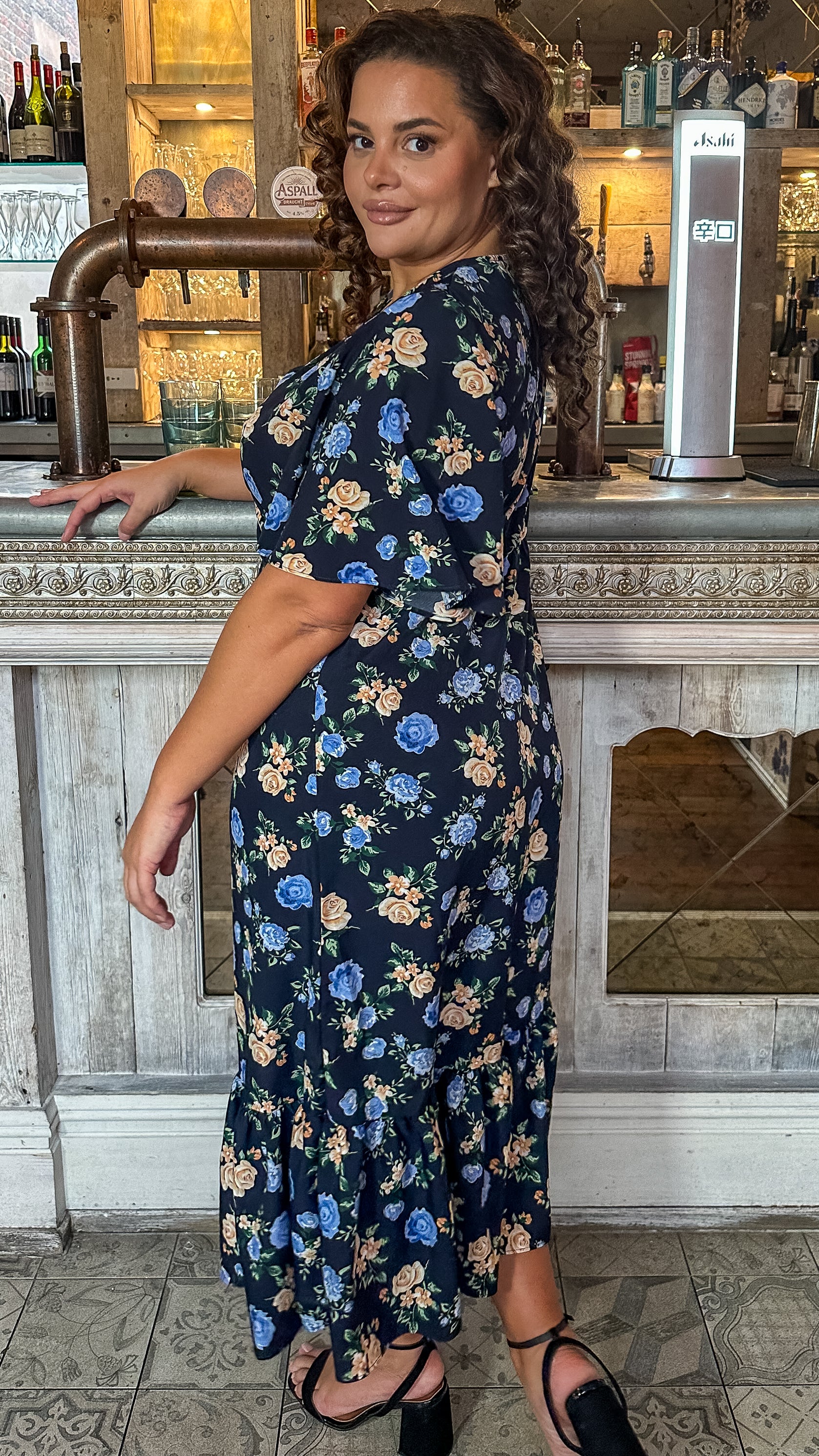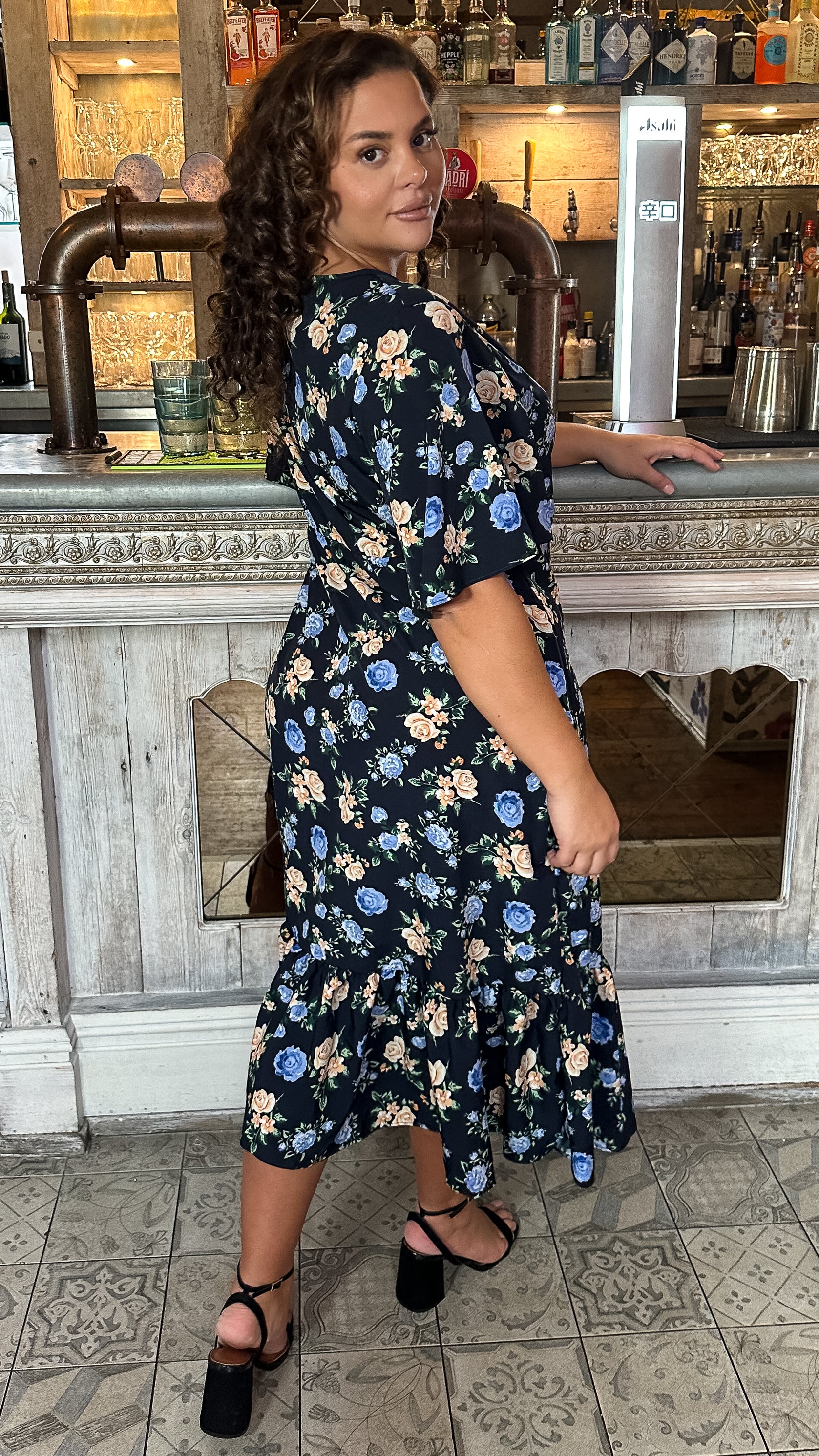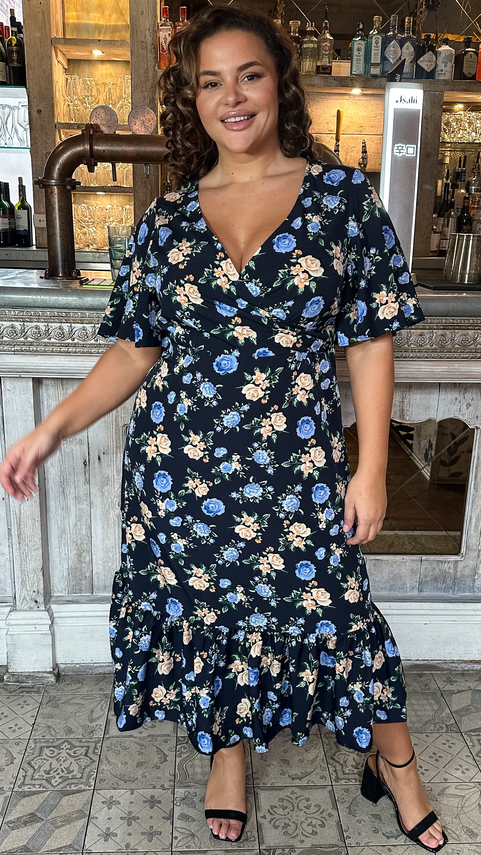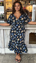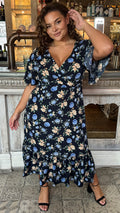 CurveWow Wrap Smock Midi Dress Blue Floral