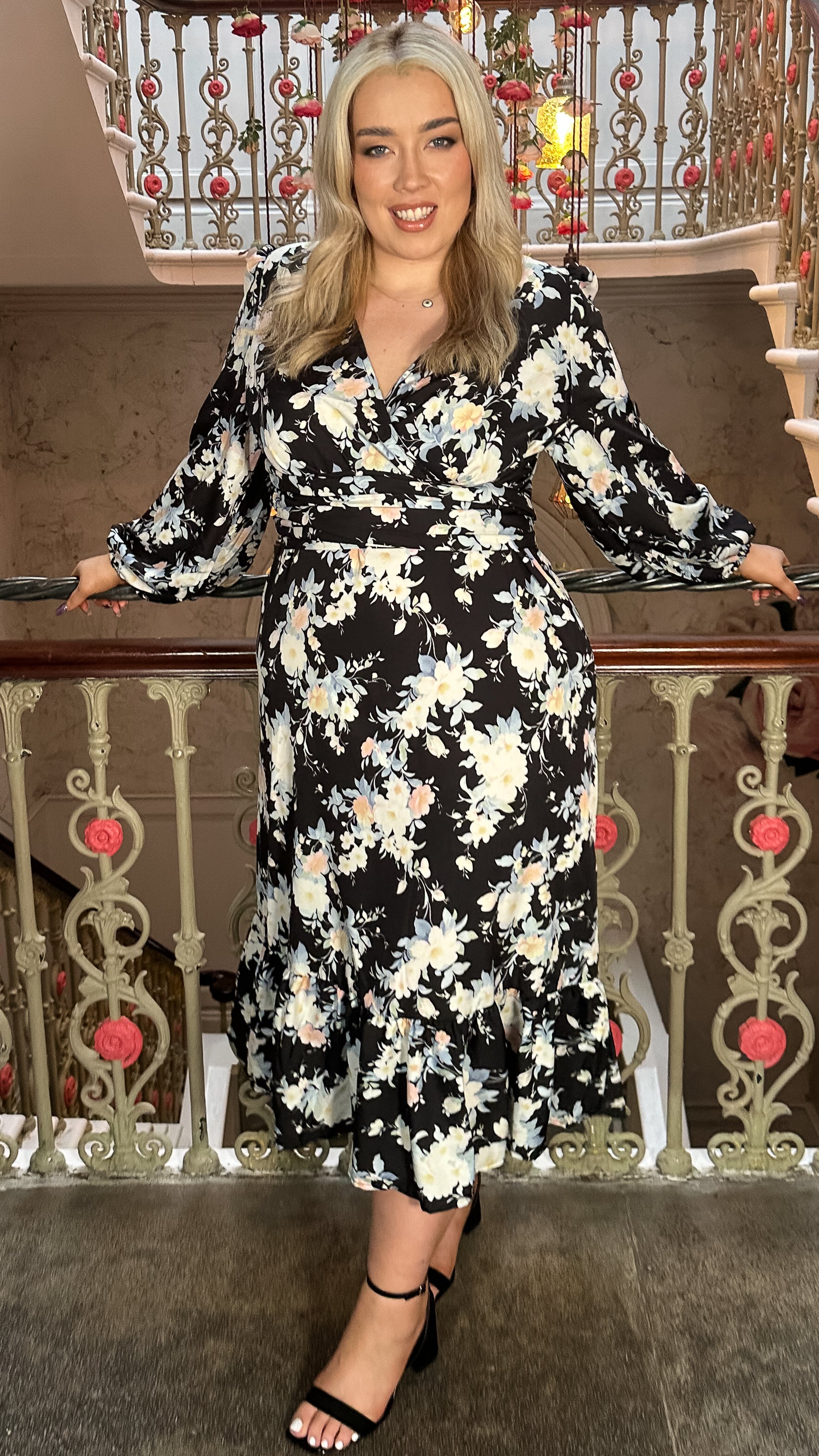 CurveWow Wrap Waist Tiered Hem Midi Dress Black Floral