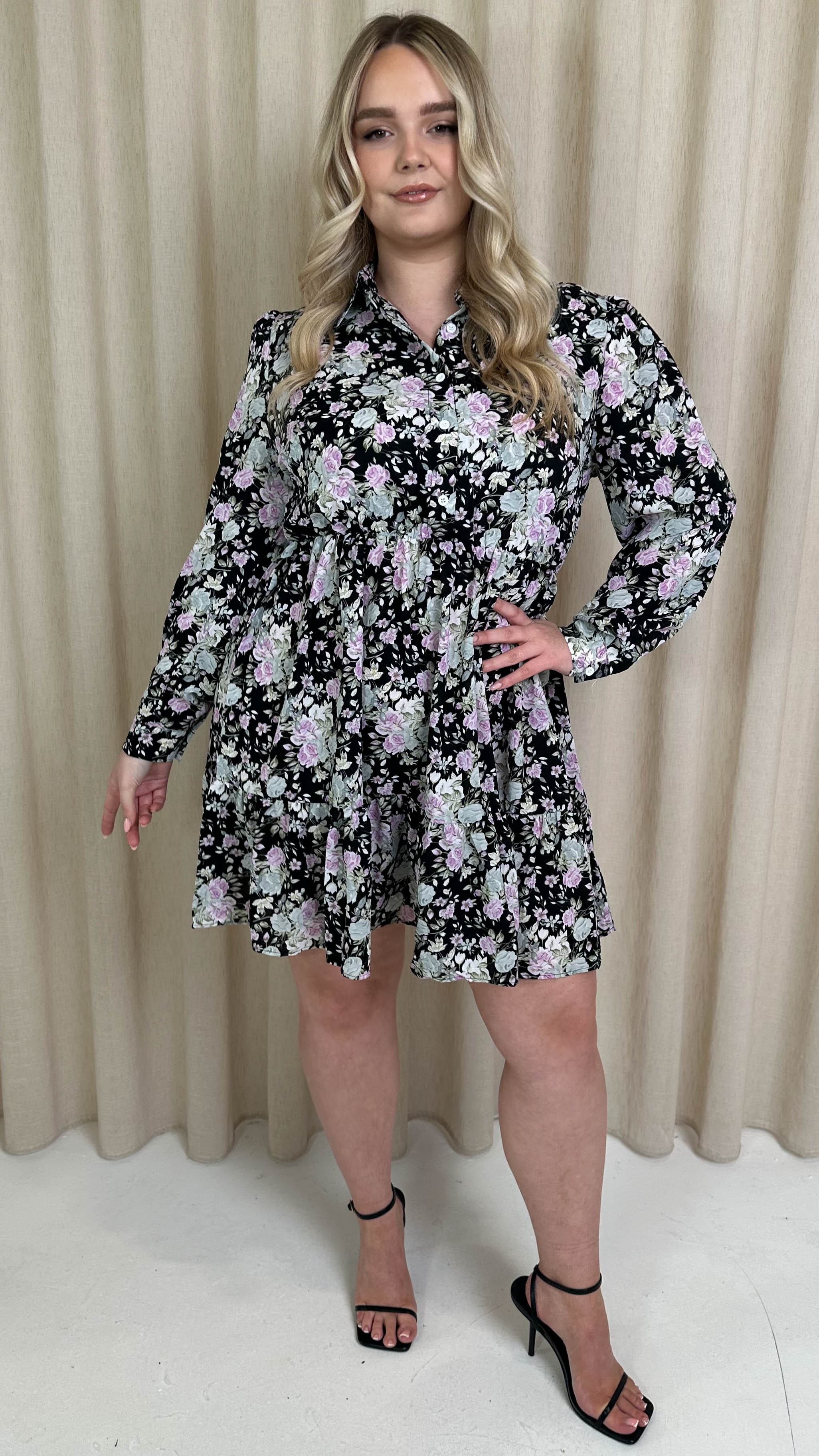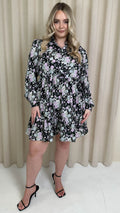 CurveWow Long Sleeve Button Front Frill Dress Black Floral