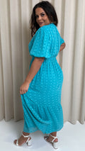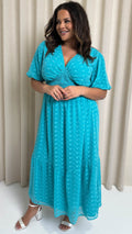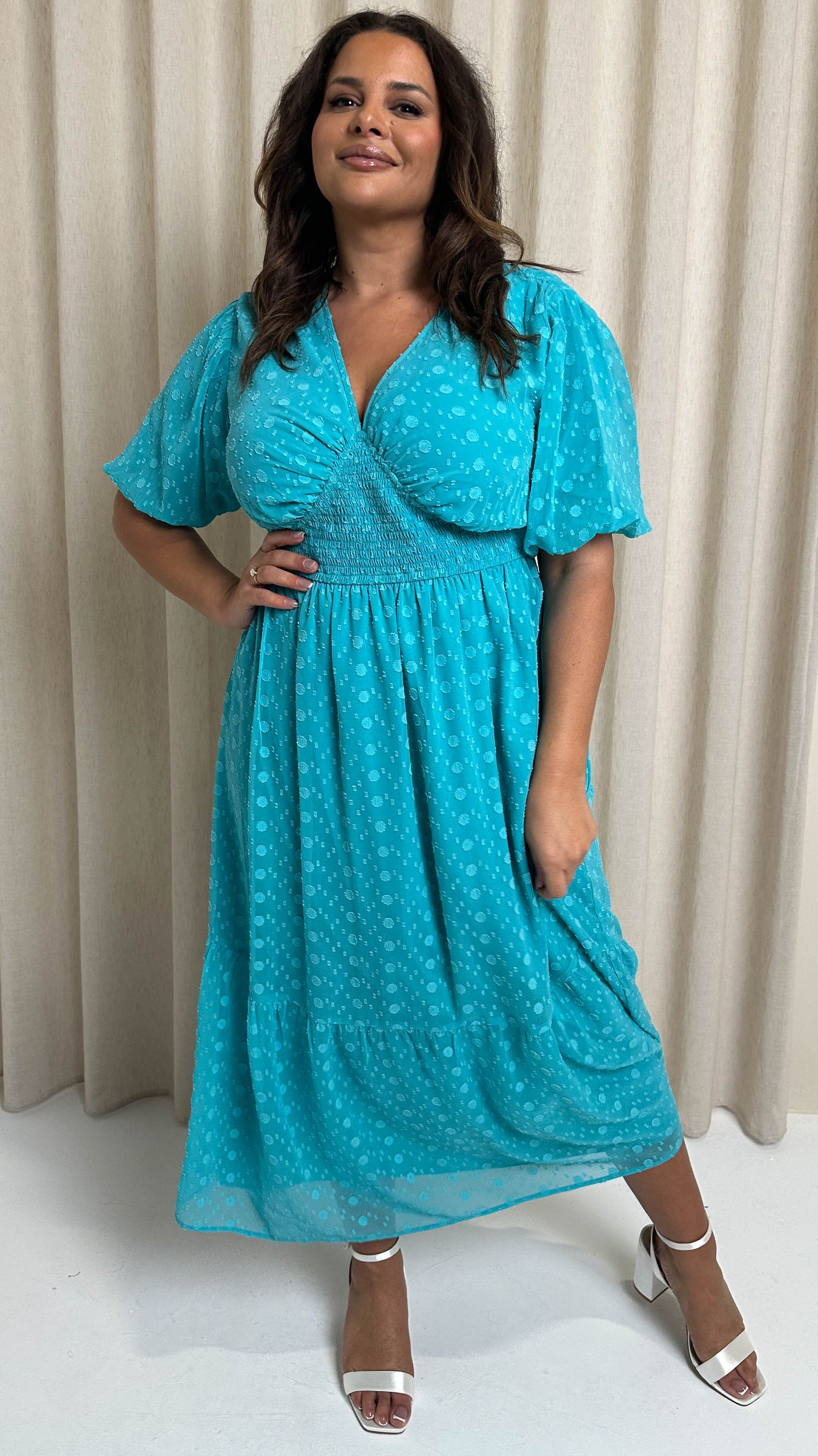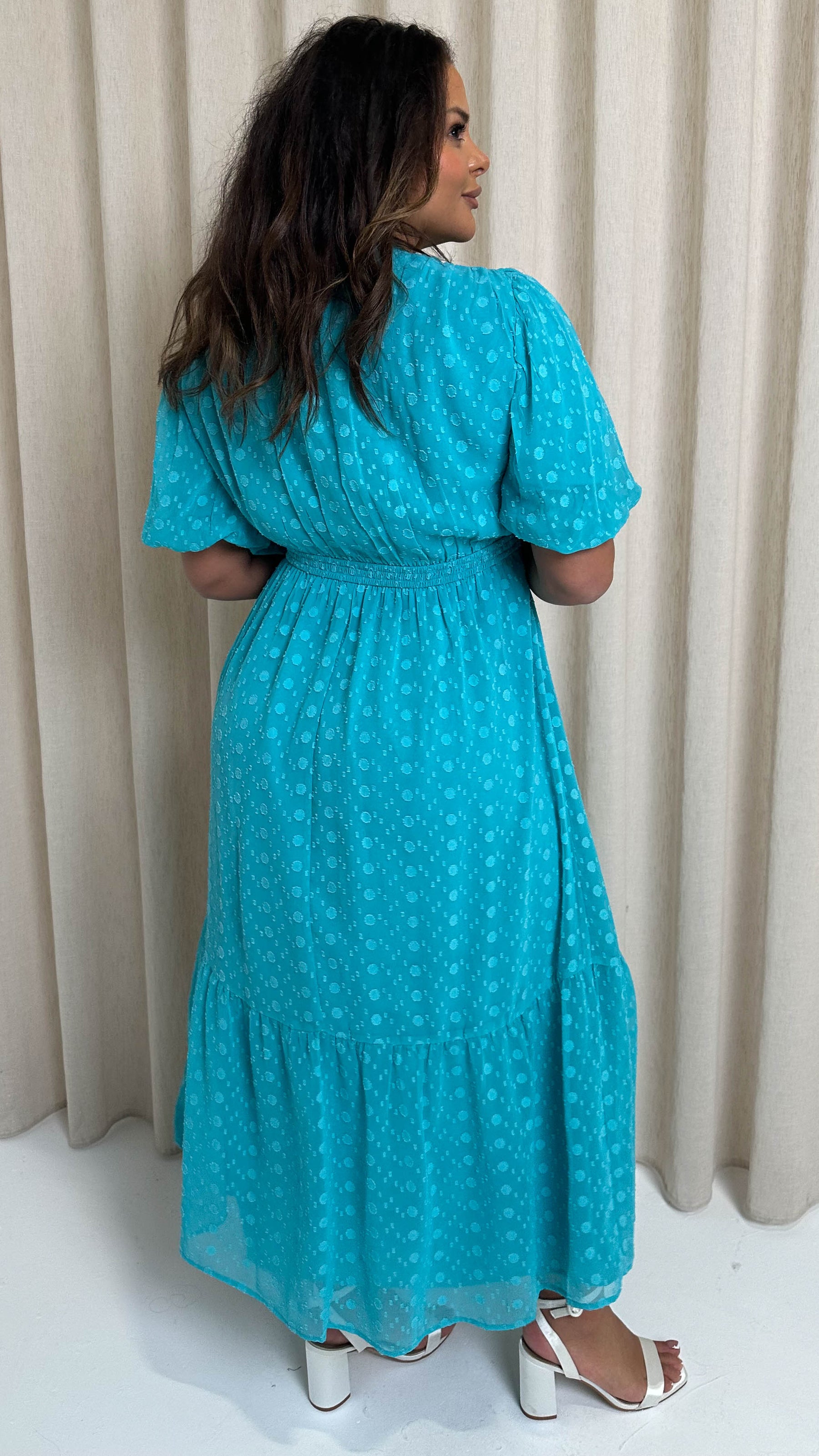 CurveWow Dobby Shiffly Puff Sleeve Vneck Maxi Dress Blue